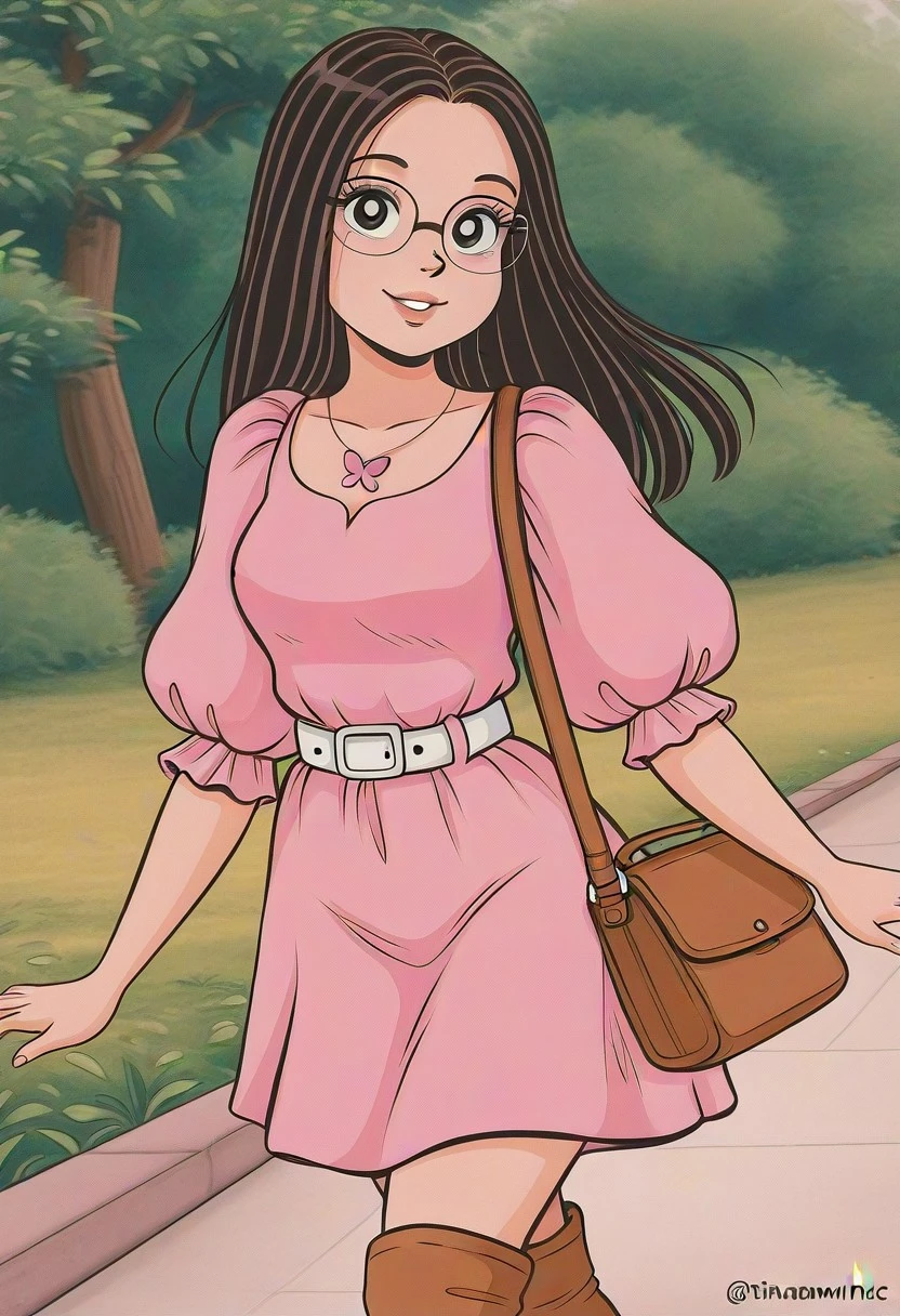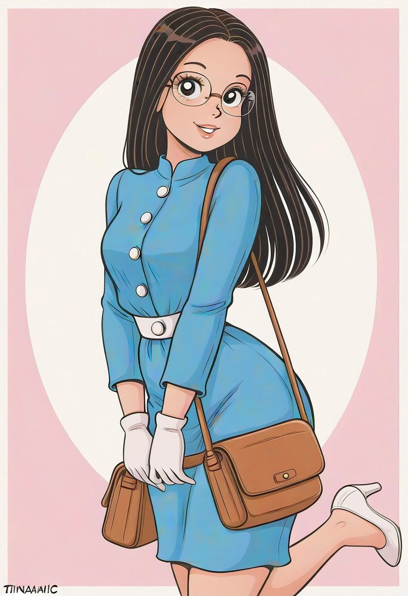 retro cartoon, black hair, straight hair, parted hair, black eyes, lips, eyelashes, glasses,