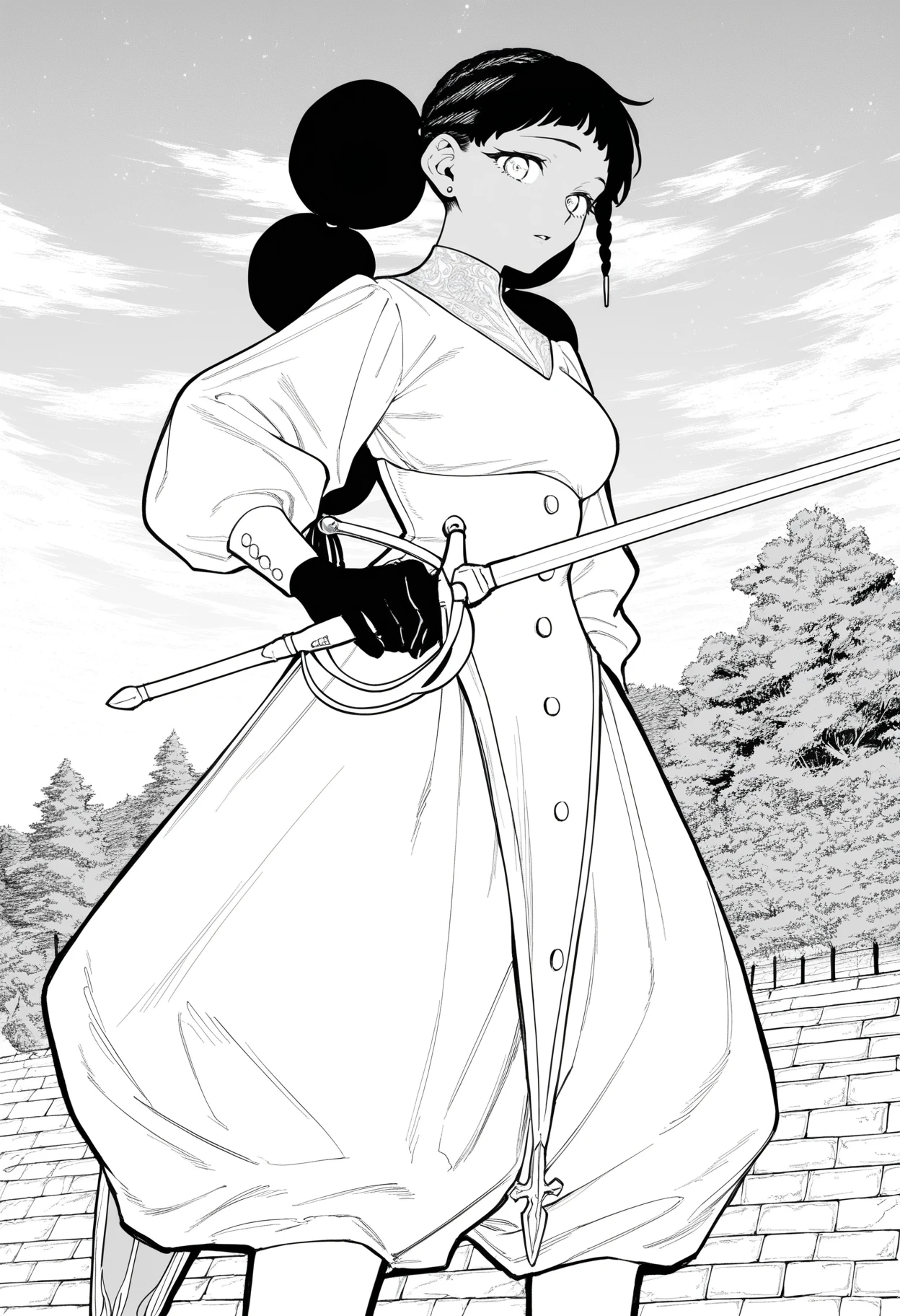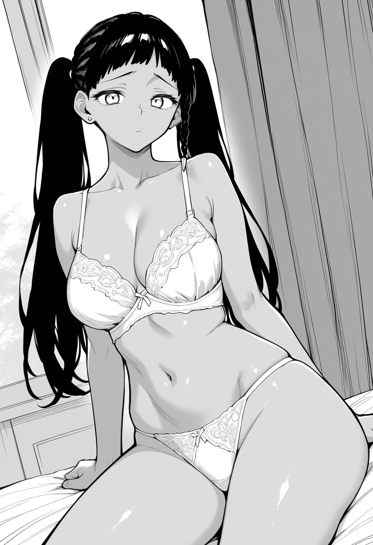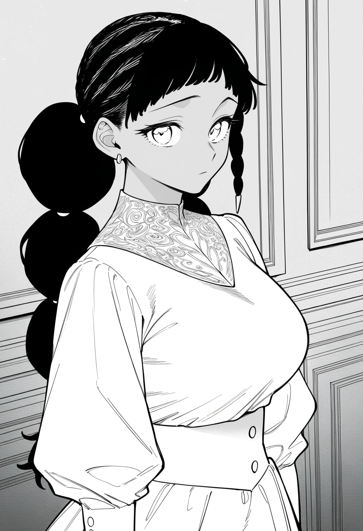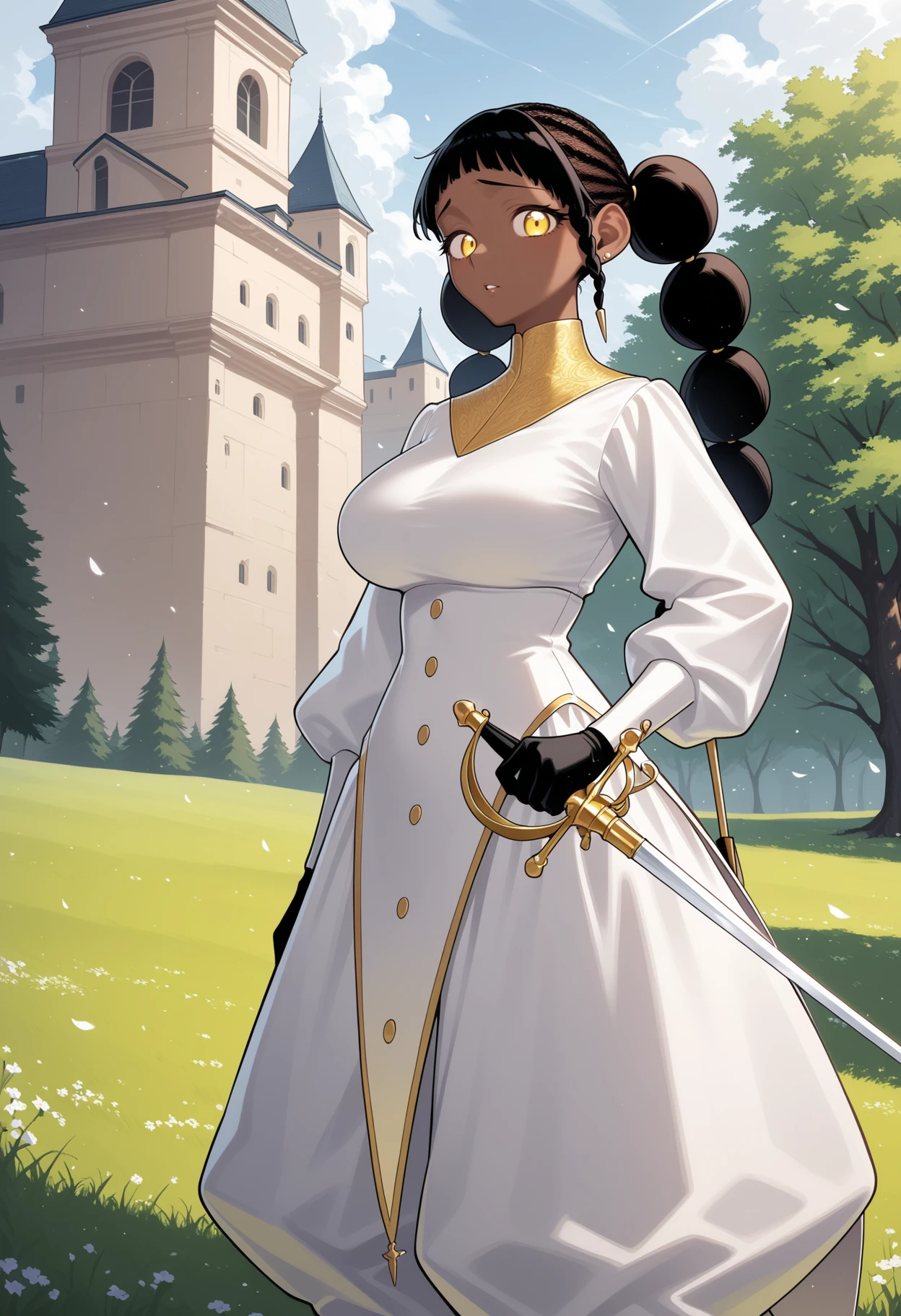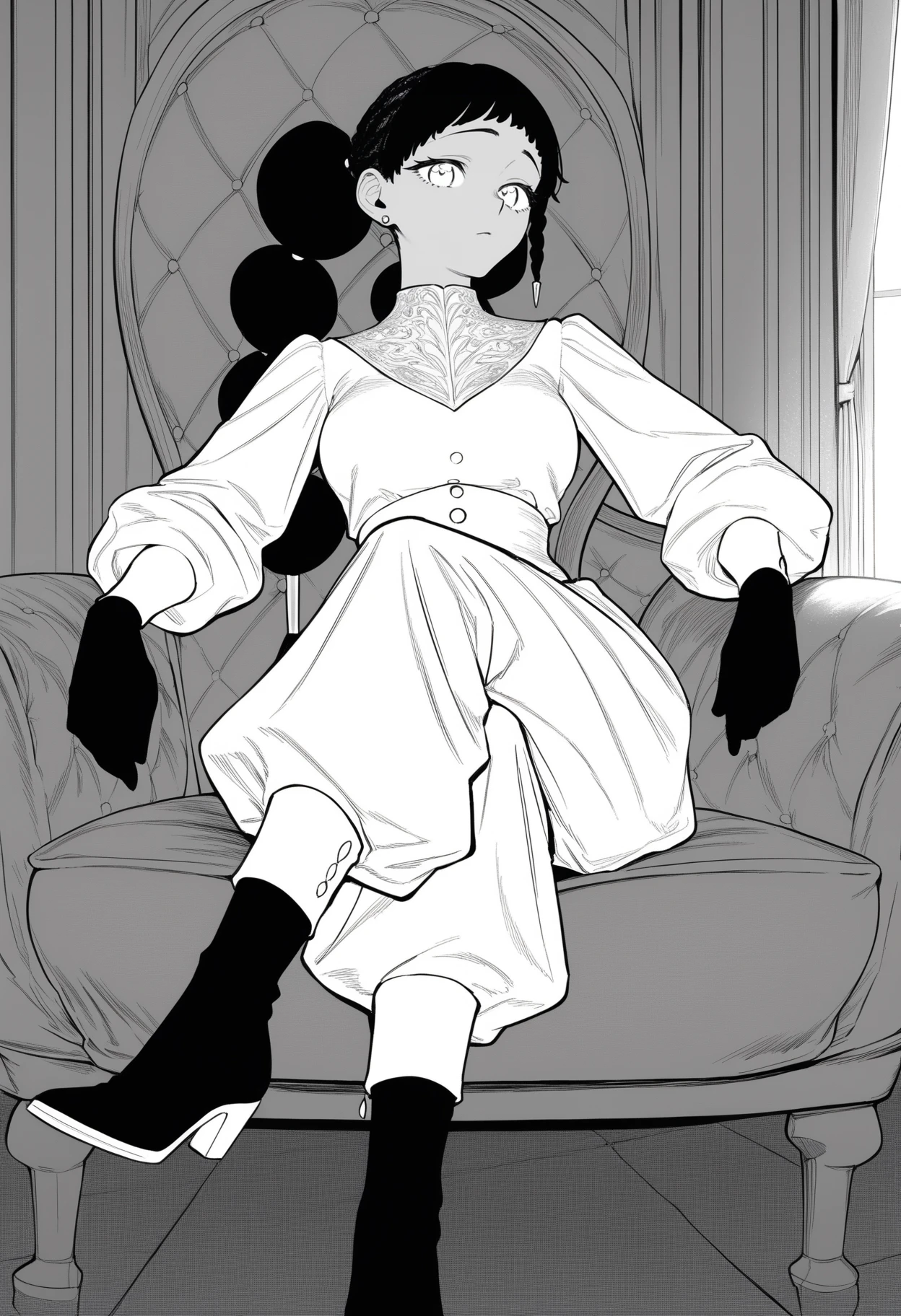 1girl,solo,mm,dark-skinned female,earrings,long hair,multi-tied hair,afro puffs,twintails,braid,side braid,