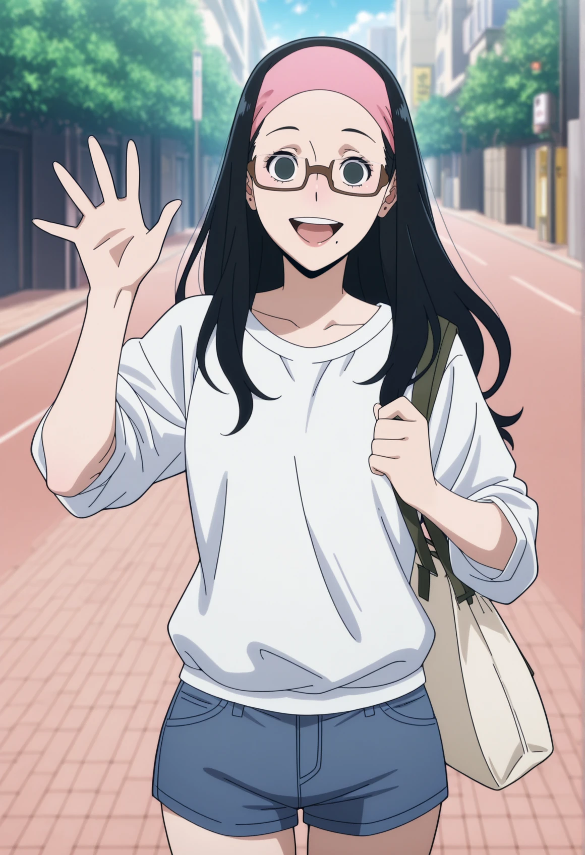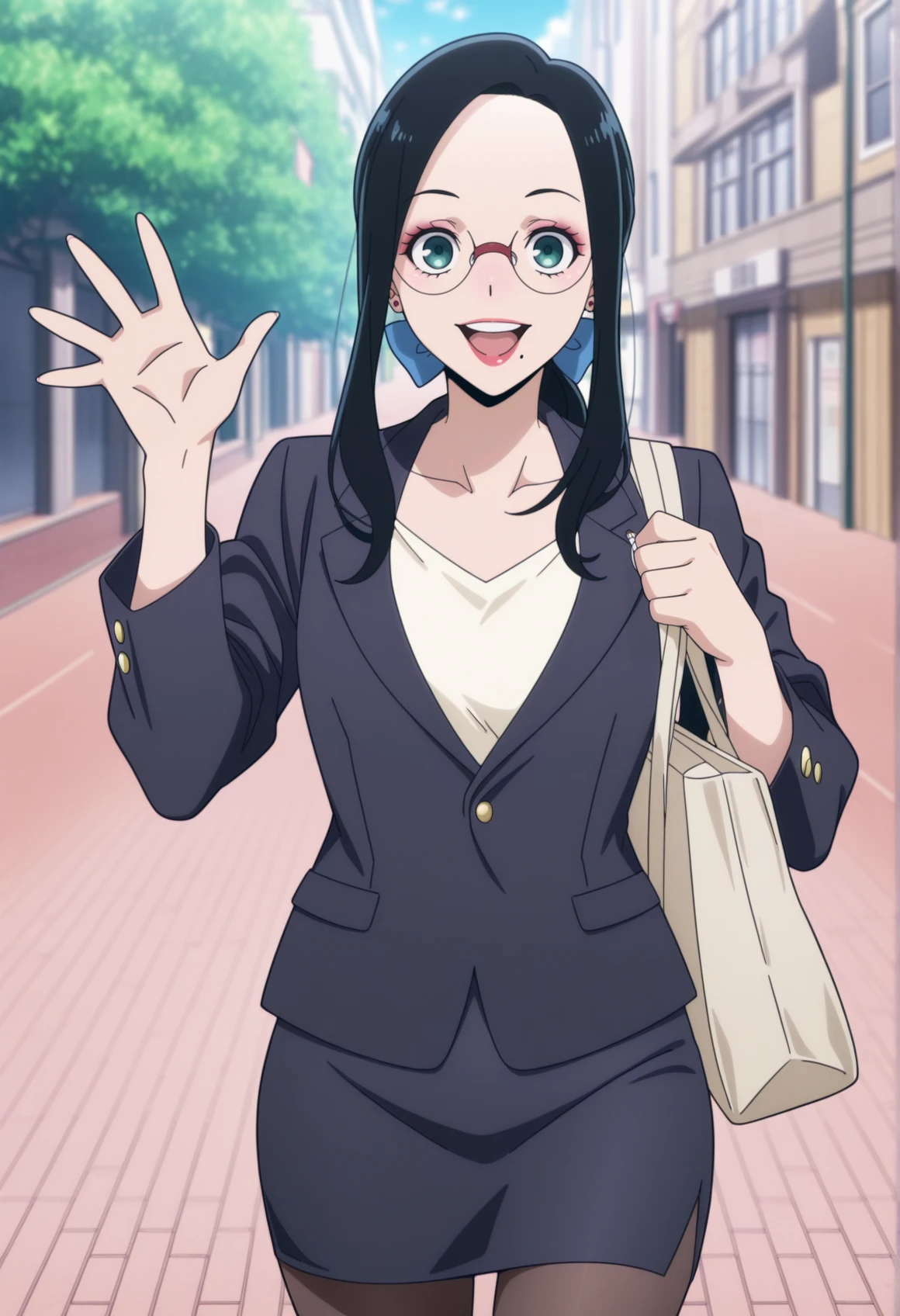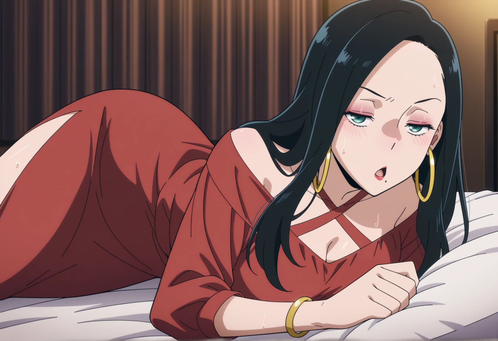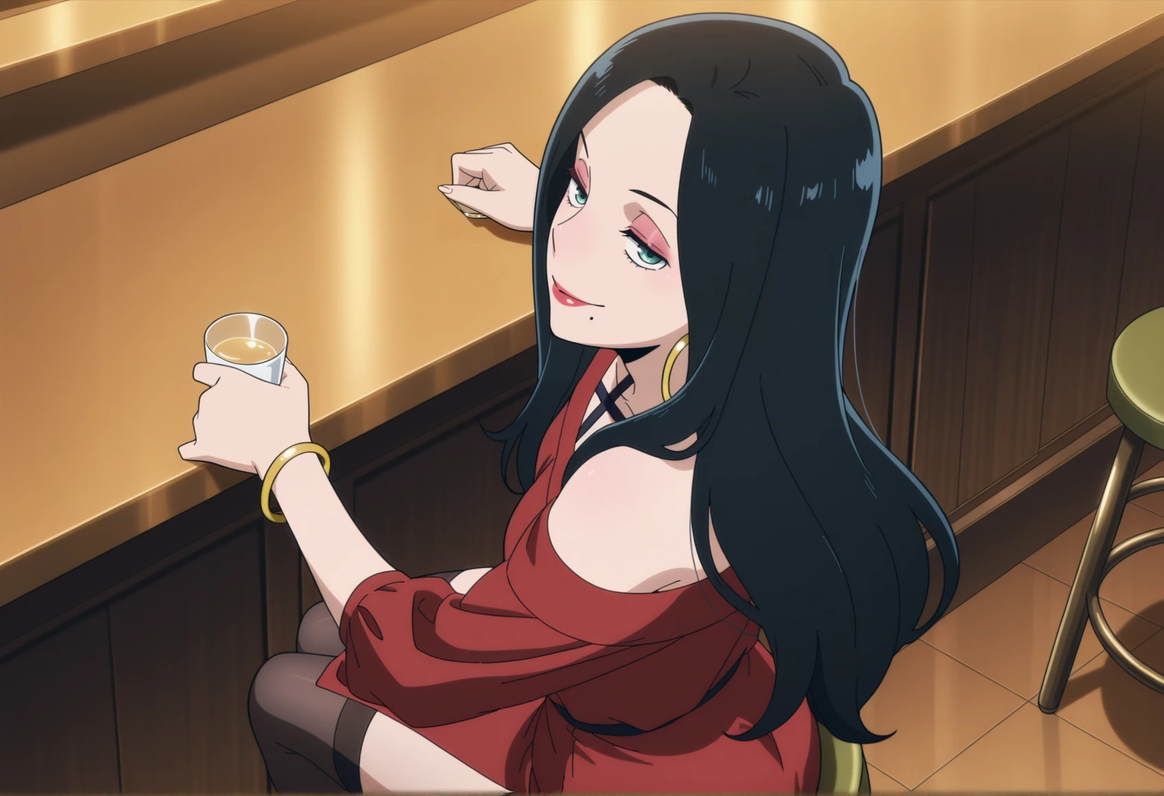 long hair, black hair, green eyes, mole under mouth, eyeshadow, lipstick, hoop earrings,