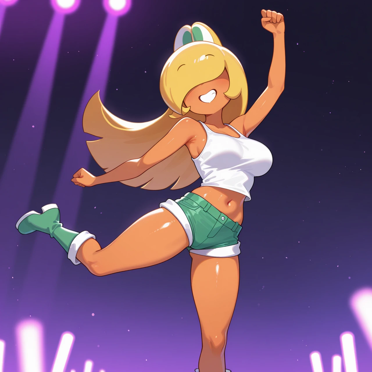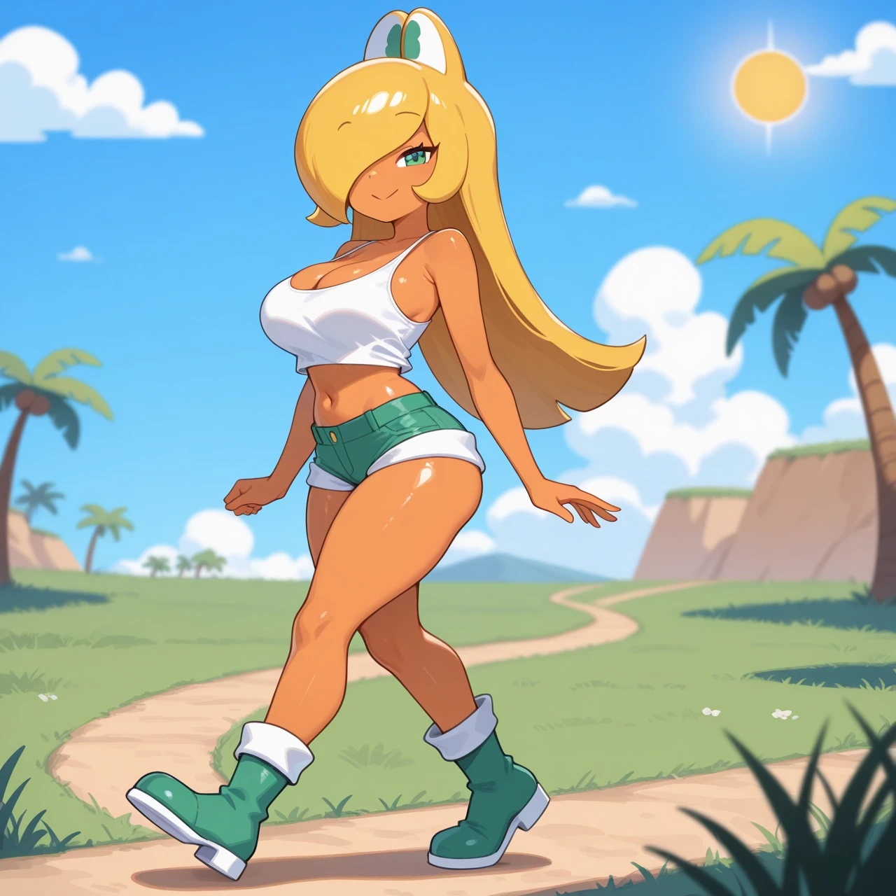 bare shoulders, cleavage, green shorts, midriff, booty shorts, white tank top, green boots