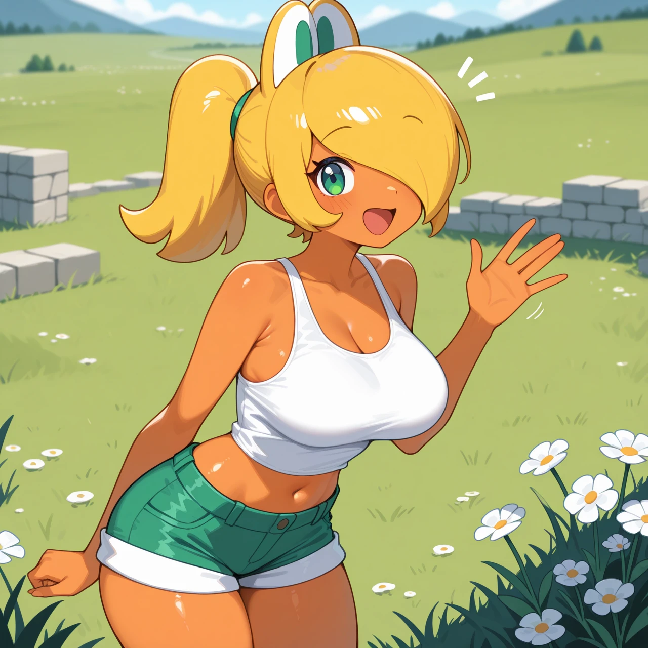 yellow hair, orange skin, hair ornament, long hair, green eyes, hair over one eye