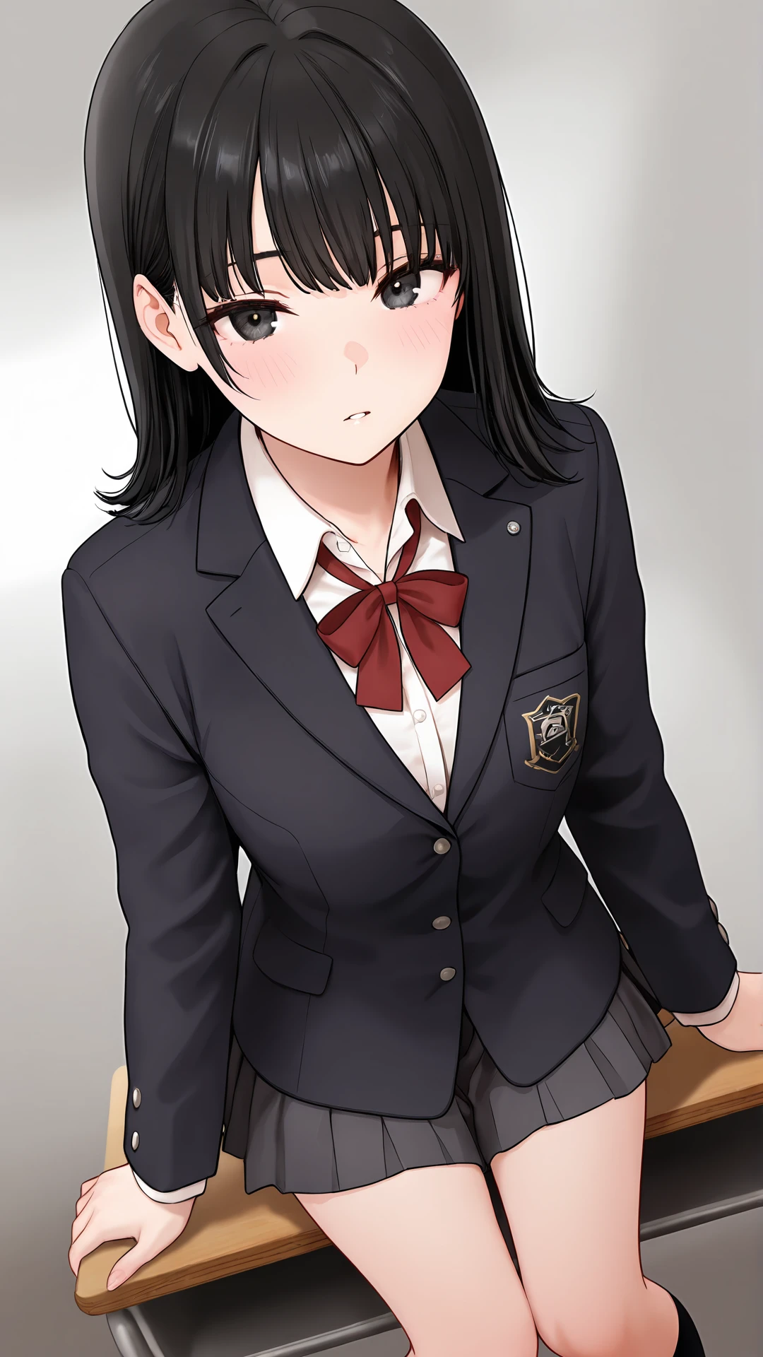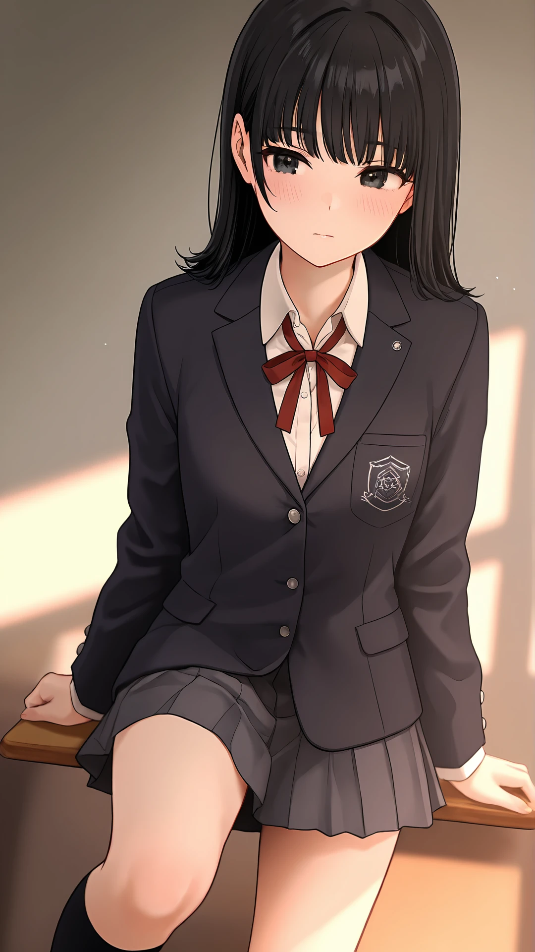 kosotate,1girl,black hair,solo,jacket,school uniform,shirt,neck ribbon,ribbon,white shirt,blazer,black jacket,black eyes,medium hair,collared shirt,long sleeves,long hair,skirt,pleated skirt,socks,