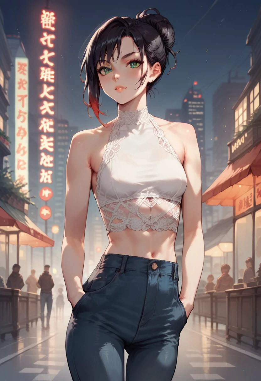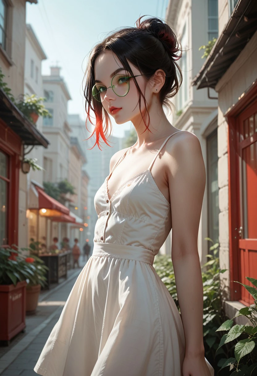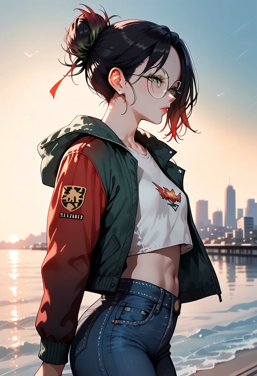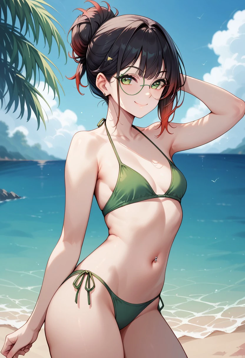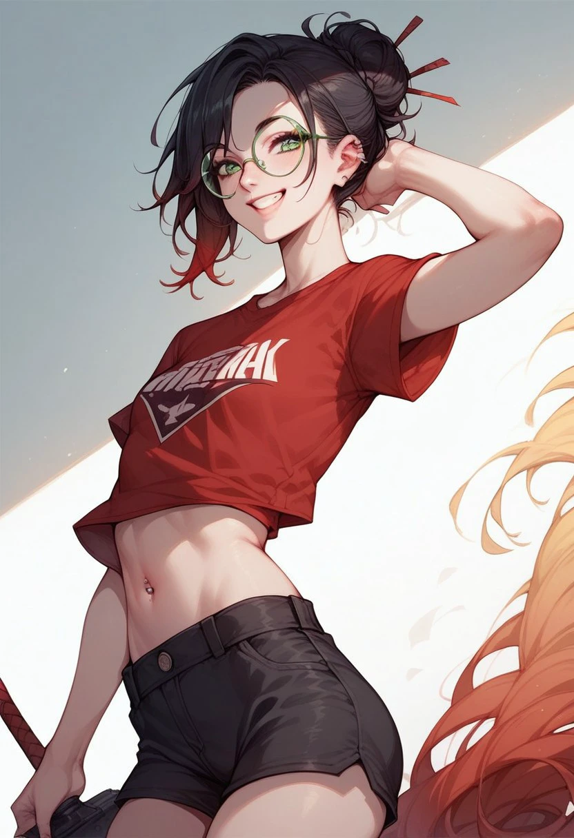 black hair, hair bun, gradient hair(red-black), green eyes, big round eyeglasses, small breasts, slim, pierced navel, pale skin