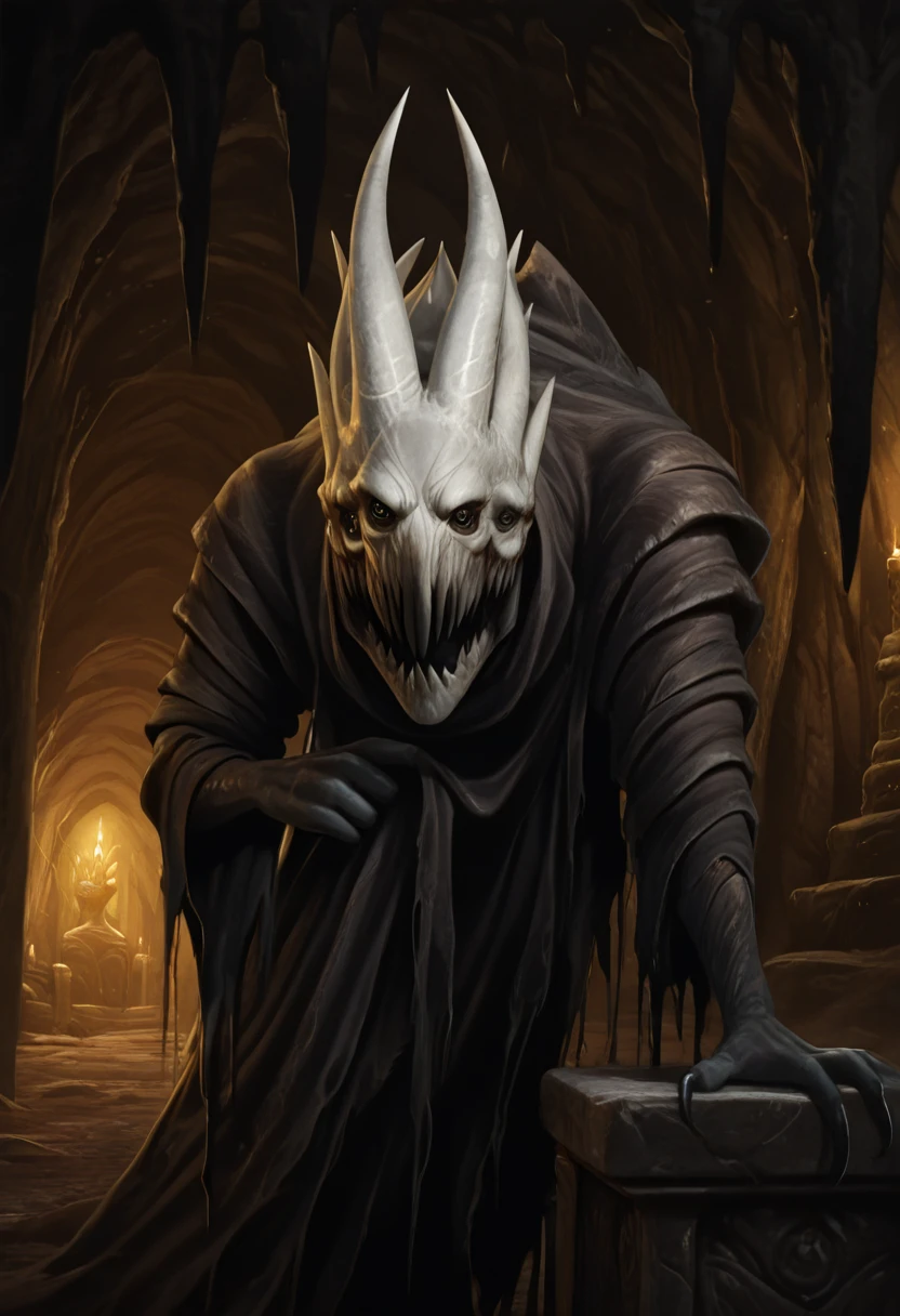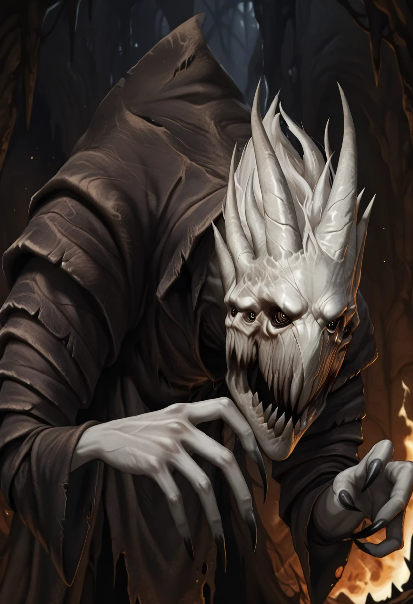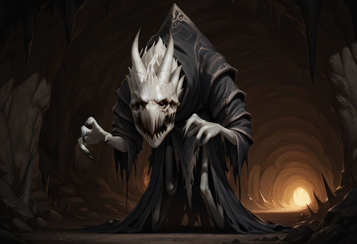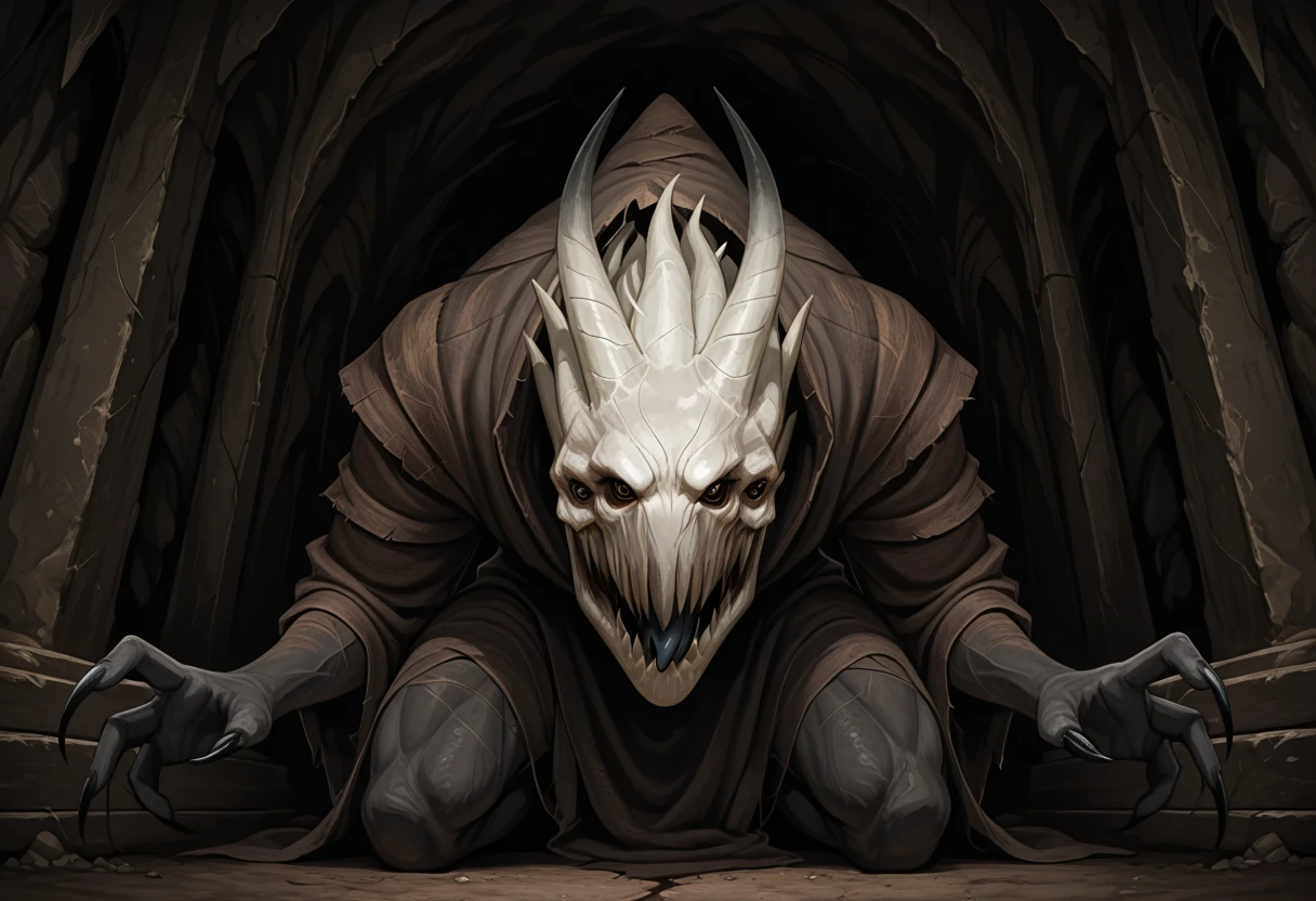 Tags: monster, multiple eyes, pale skin, tattered robe, no humans, sharp mouth, claws, hunched posture, horned head