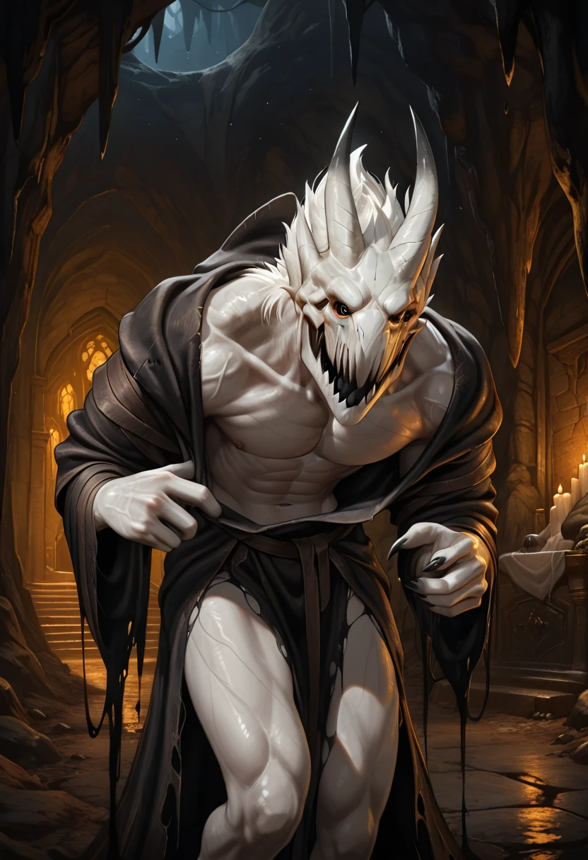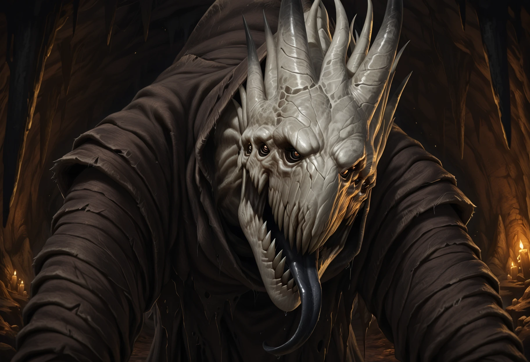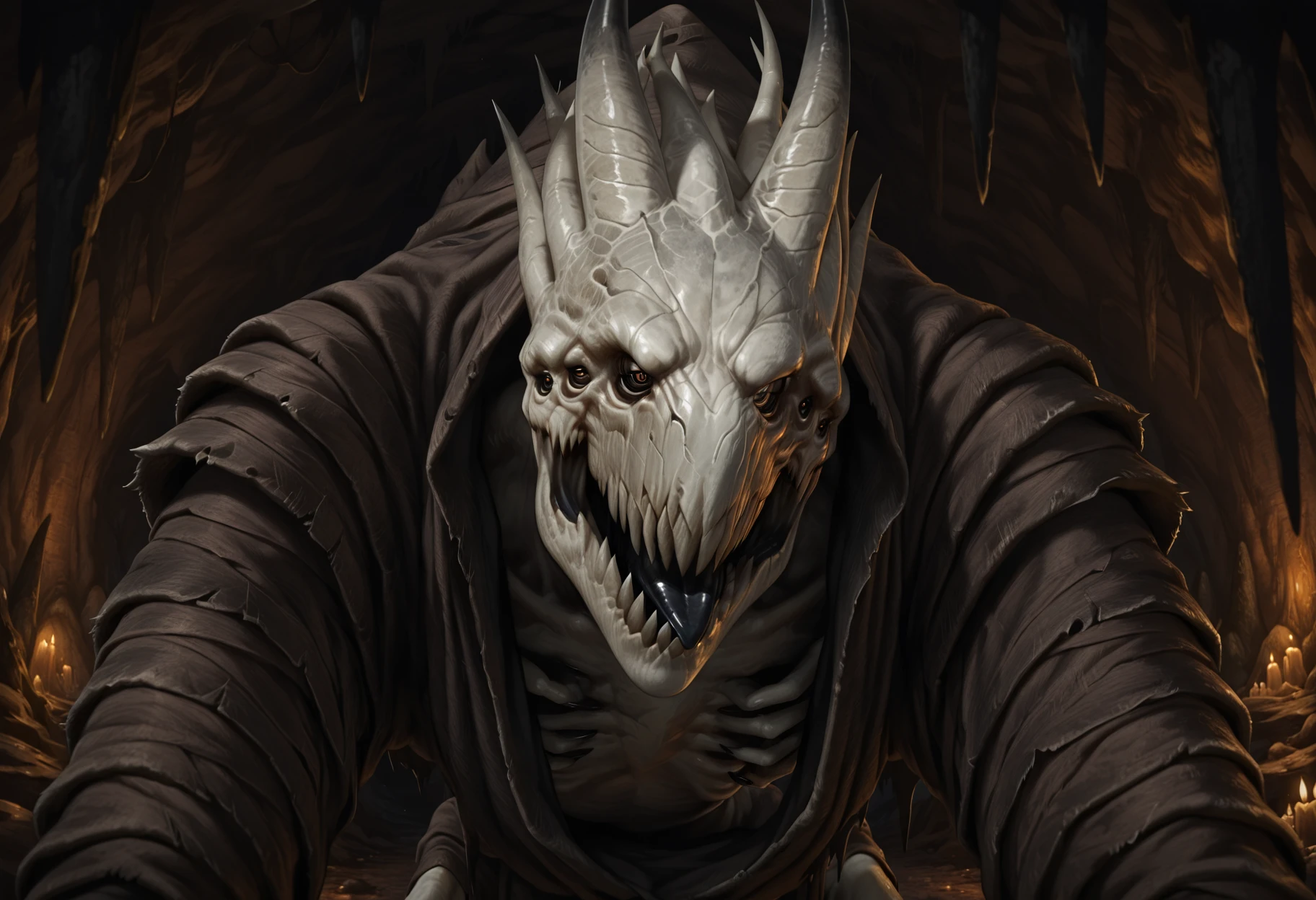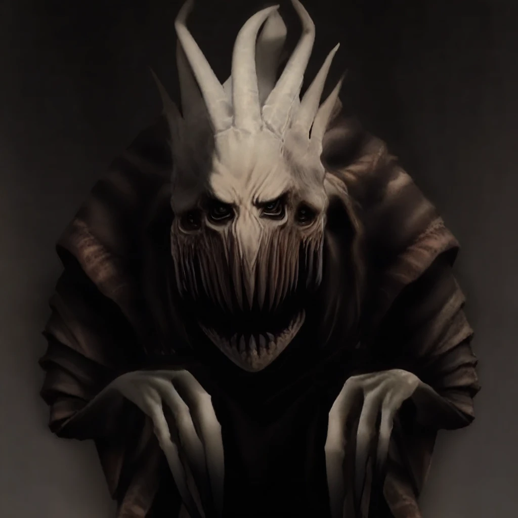 Tags: monster, multiple eyes, pale skin, tattered robe, no humans, sharp mouth, claws, hunched posture, horned head