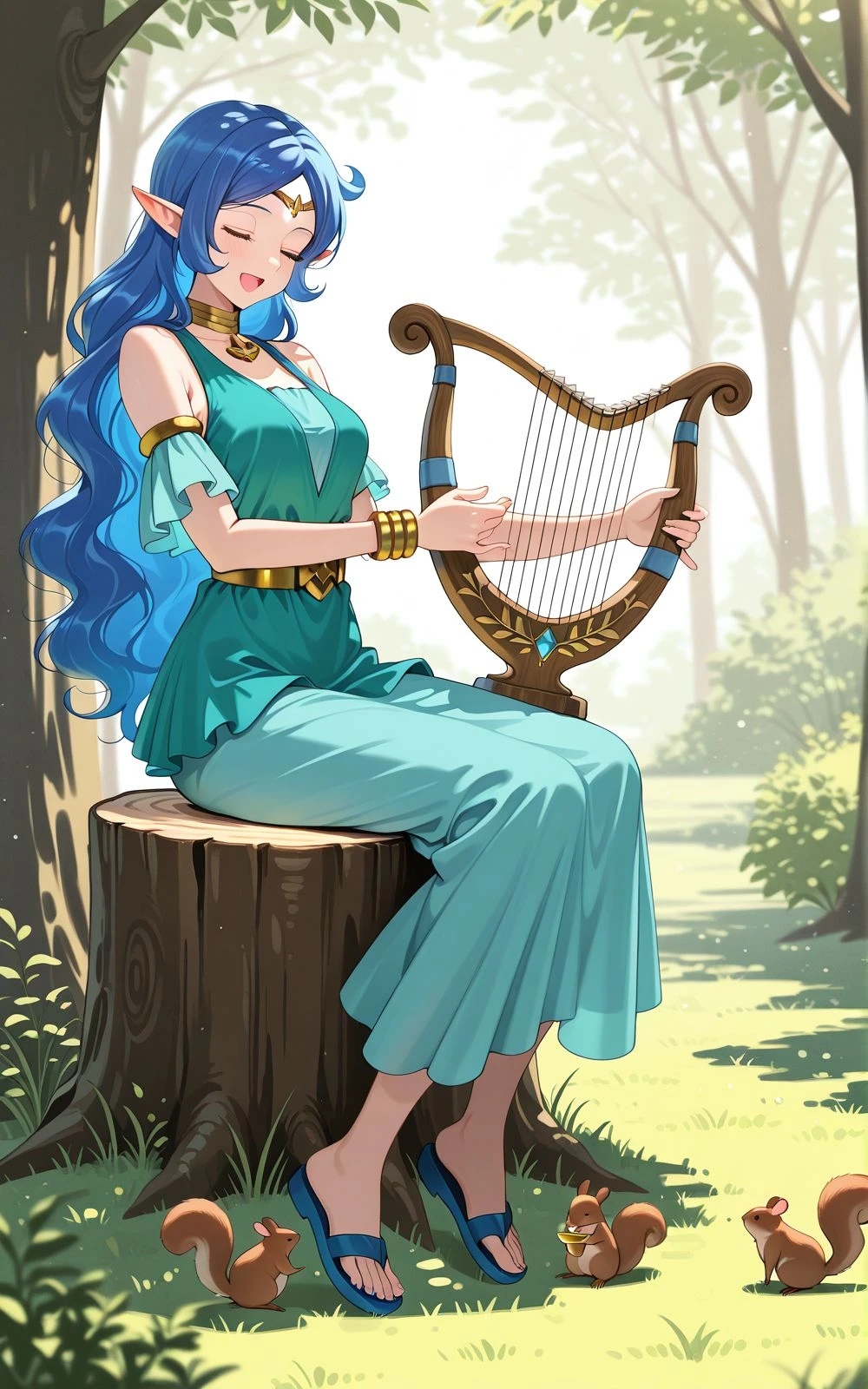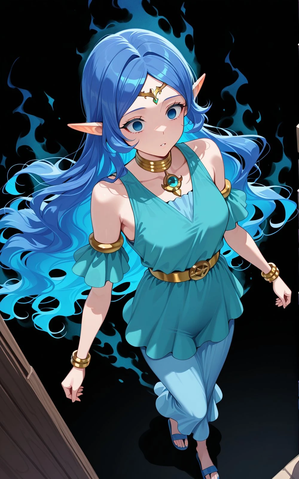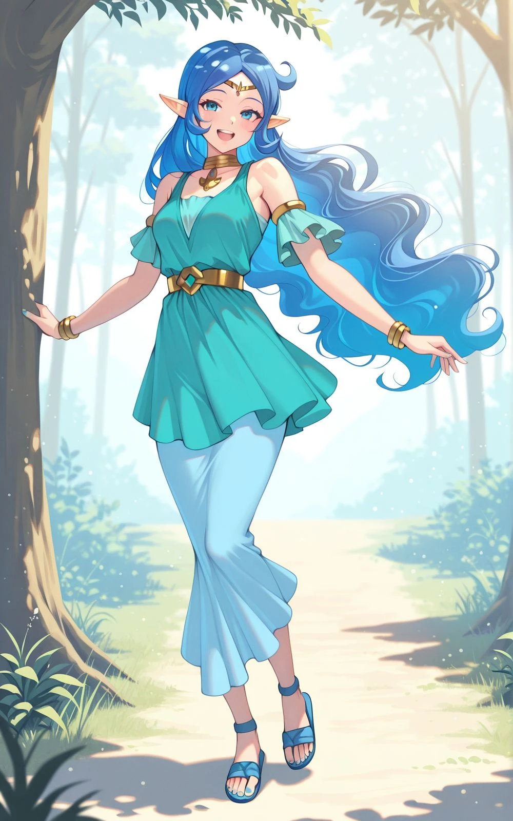 Nayru, long hair, blue hair, elf ears, blue eyes, circlet, gold necklace, aqua shirt, blue dress, bare shoulders, blue sandals, bracelets