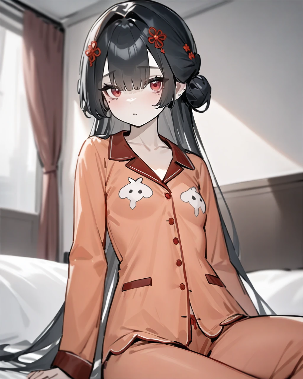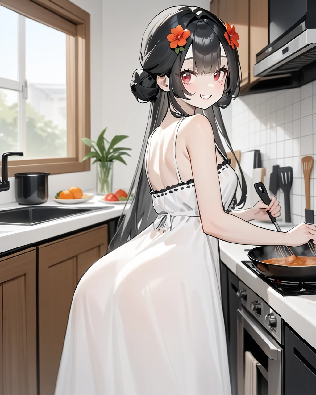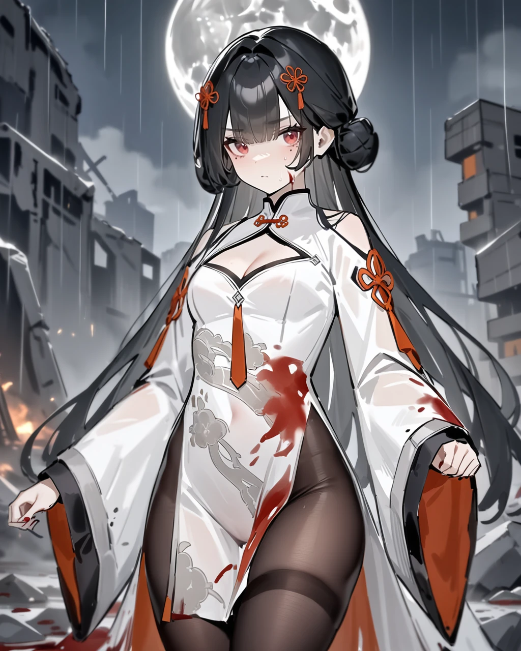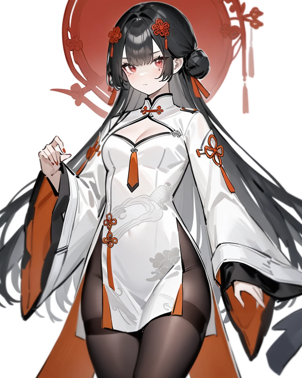 xuankai snowbreak,1girl,solo,mole under eye,long hair,cleavage cutout,clothing cutout,black hair,sleeves past wrists,pantyhose,sleeves past fingers,hair ornament,dress,red eyes,flower,black pantyhose,chinese clothes,hair flower,white dress,breasts,small breasts,bangs,long sleeves,hair bun,wide sleeves,推荐在更换服装时,为正确还原头饰,加入负面提示词: