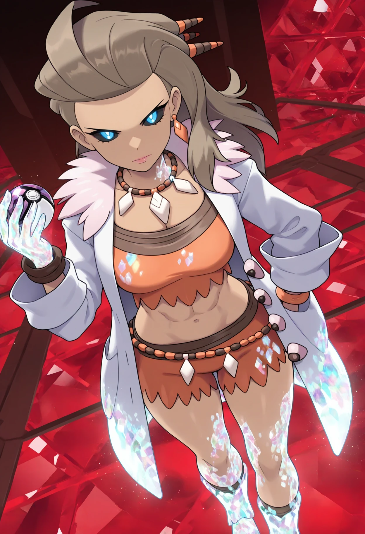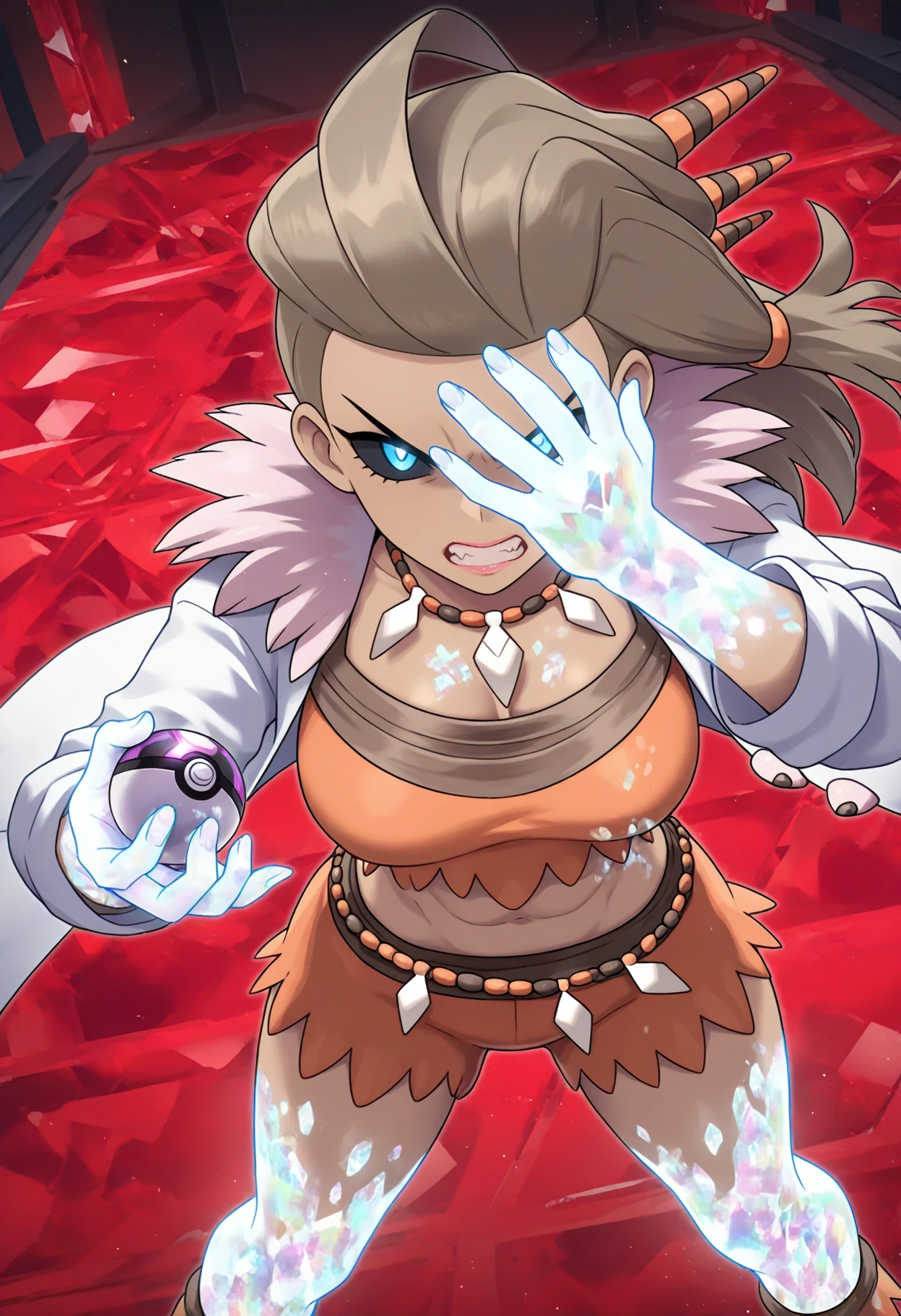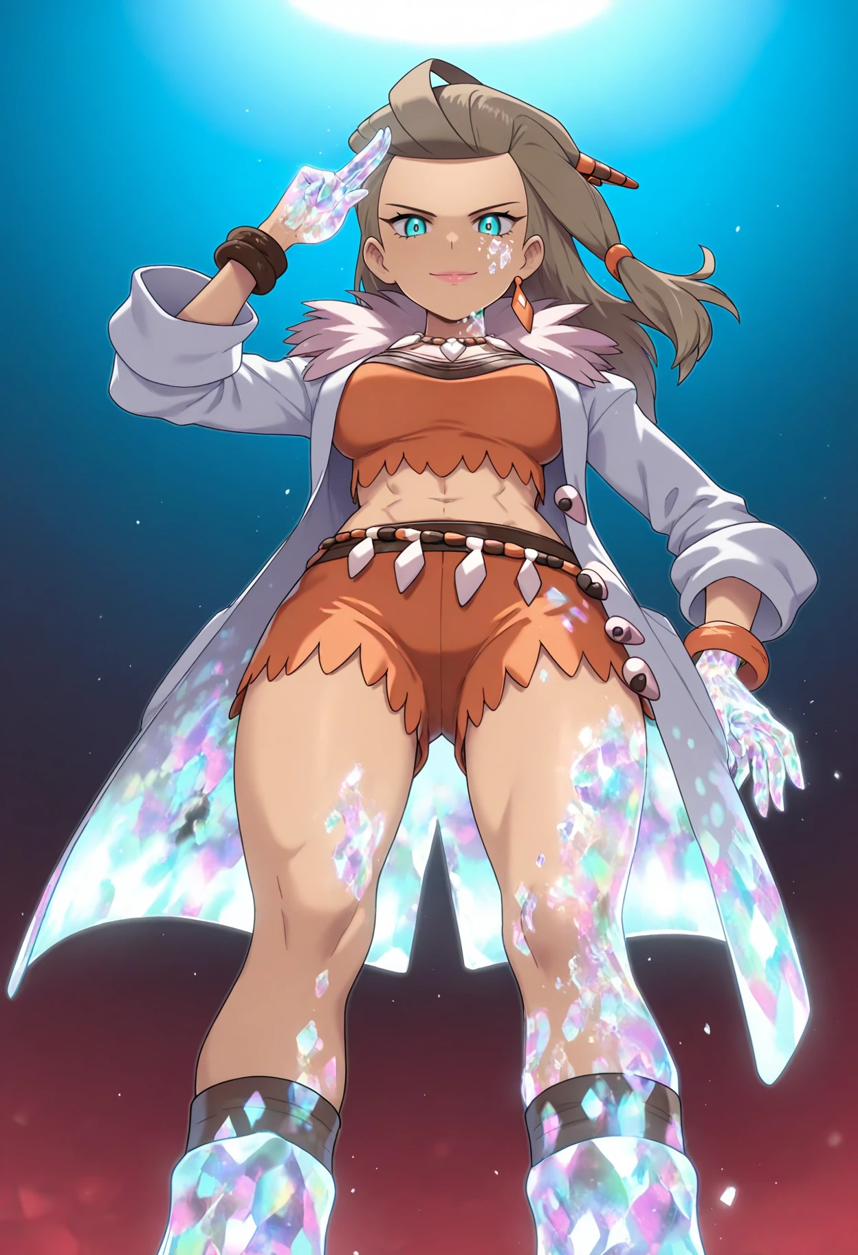 light brown hair, hair slicked back, hair ornament, black sclera, blue eyes, glowing eyes, ???????, pink lips, toned female, crystal clothes, crystal coat, crystal crop top, fur-trimmed coat, orange crop top, short shorts, crystal shorts,crystallization, crystal body, crystal hands, glowing, light particles,Artistic Disclaimer: