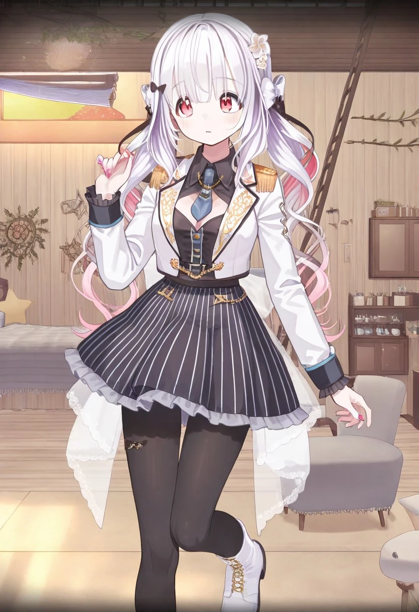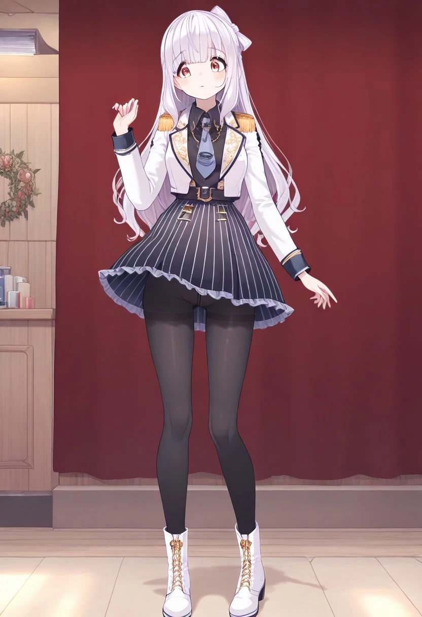 necktie,long sleeves,black pantyhose,striped, black shirt,collared shirt,vertical-striped skirt,jacket,boots pantyhose,skirt,white jacket,shirt, striped skirt,white footwear,epaulettes ,