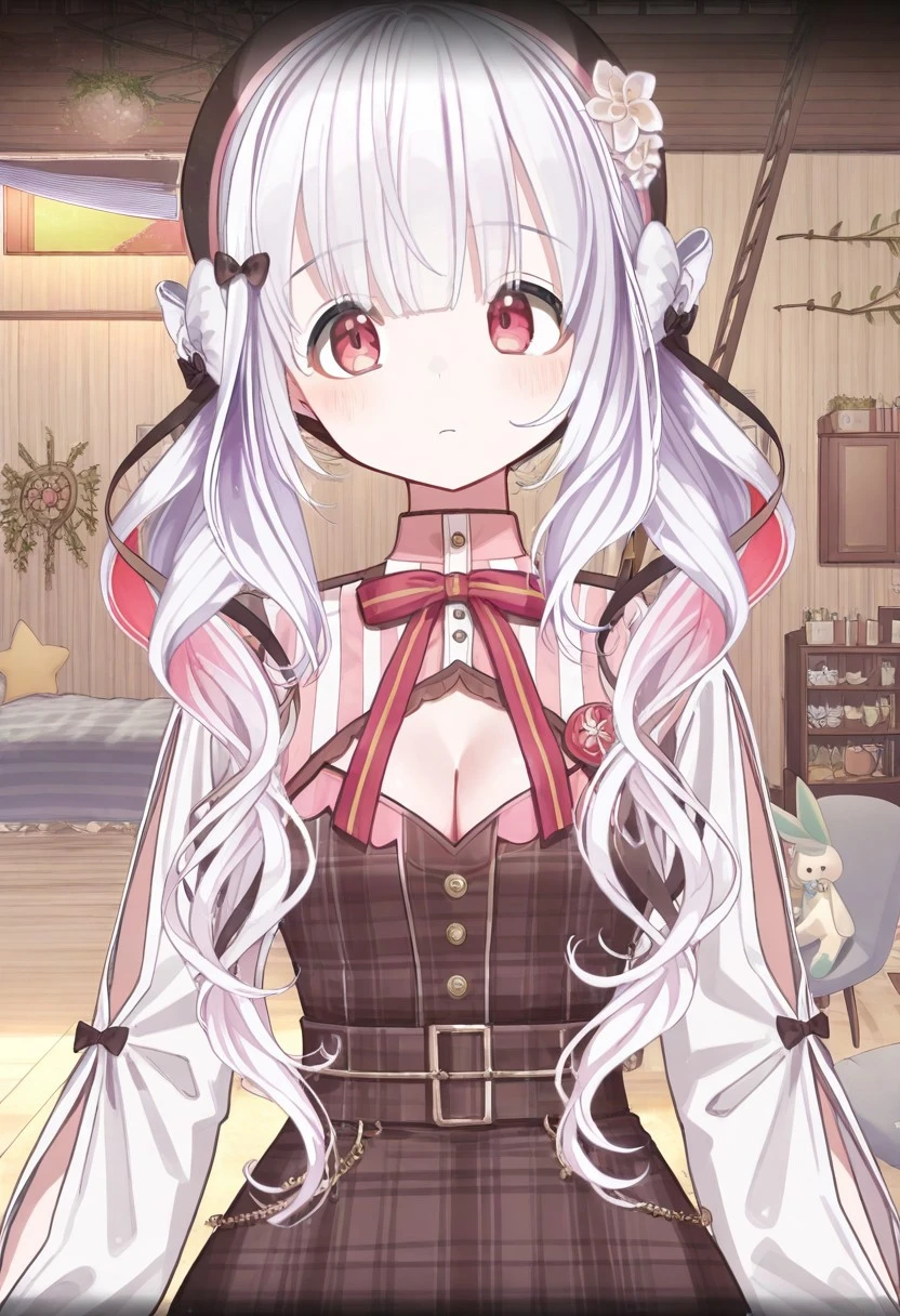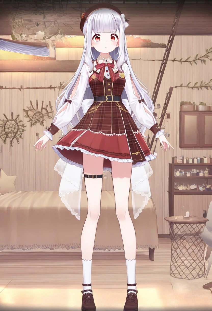 beret, bow, long sleeves,dress, shirt, plaid, flower, brown dress, belt, white shirt, skirt, plaid dress, ribbon, socks,thigh strap, shoes, striped, white socks, puffy long sleeves, white flower, red skirt, white bow, puffy sleeves, black headwear, clothing cutout, black bow, brown footwear, frills, red bow, red dress, black belt, brown bow, braid, plaid skirt, collared shirt, black footwear, sleeves past wrists,hat, brown headwear, red headwear,