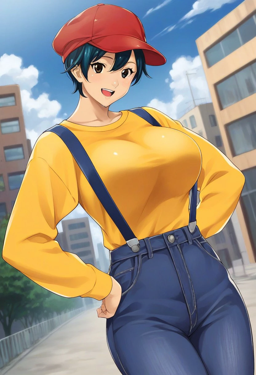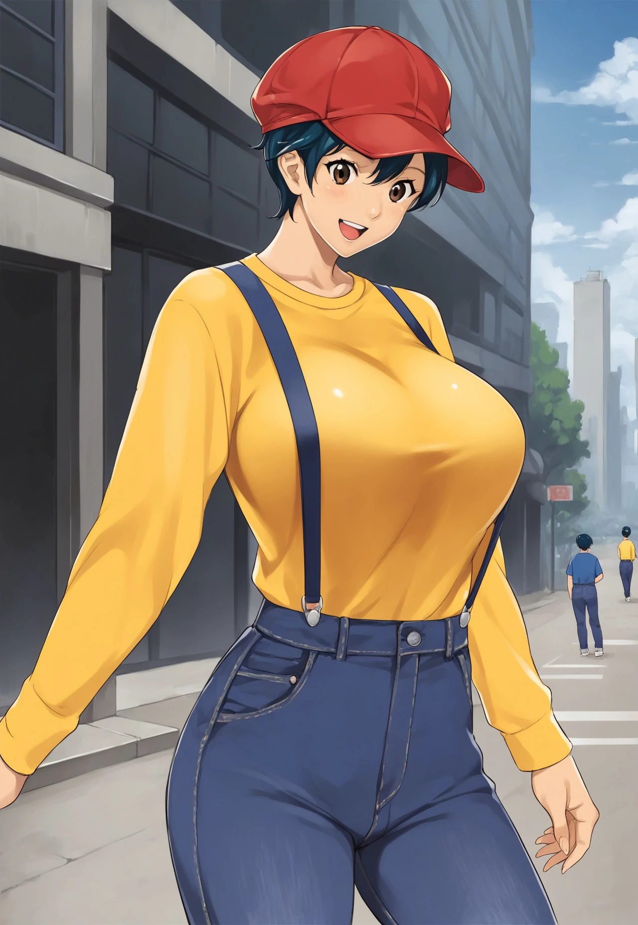2nd outfit: red cap, yellow shirt, long sleeves, blue suspenders, blue jeans,