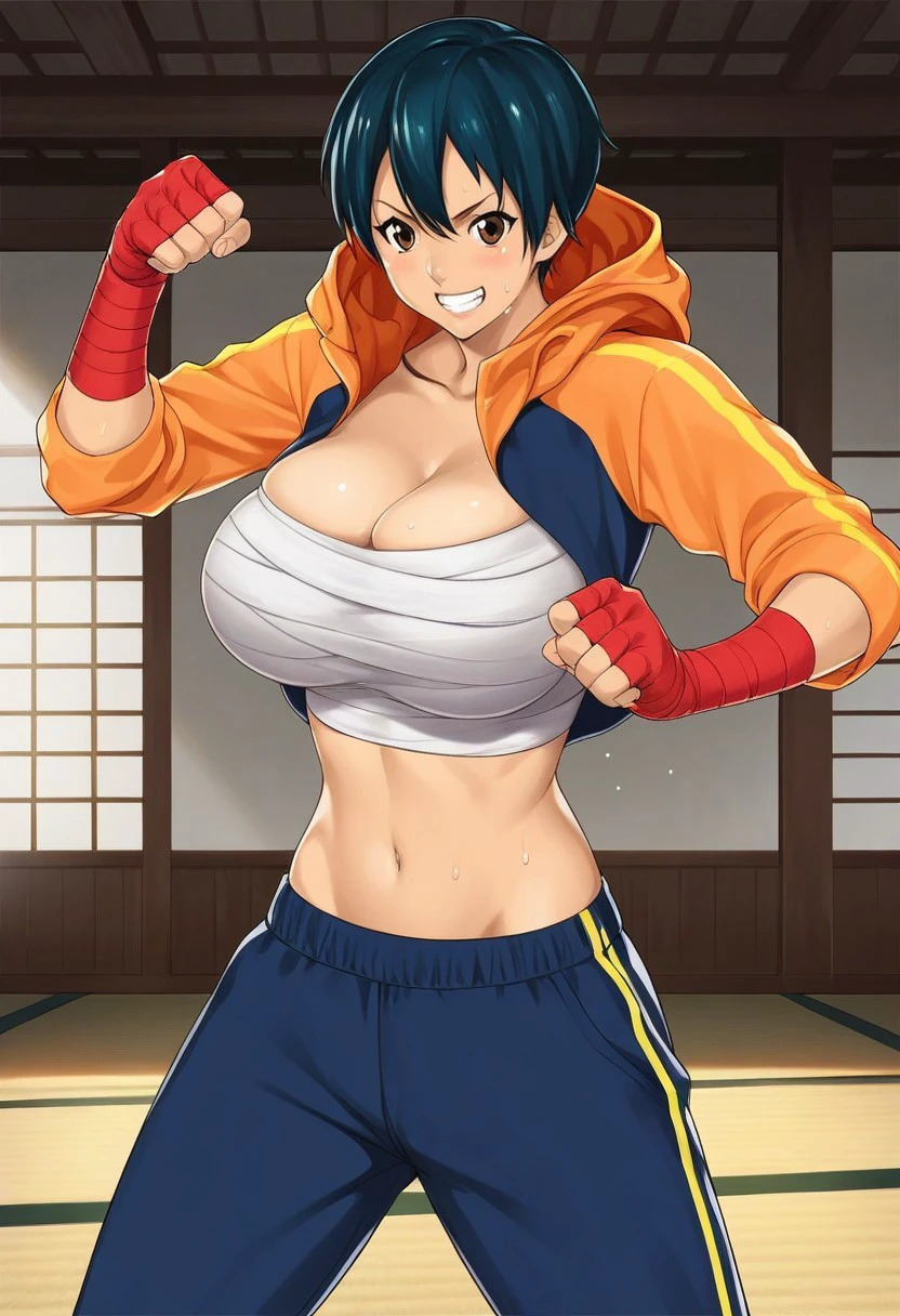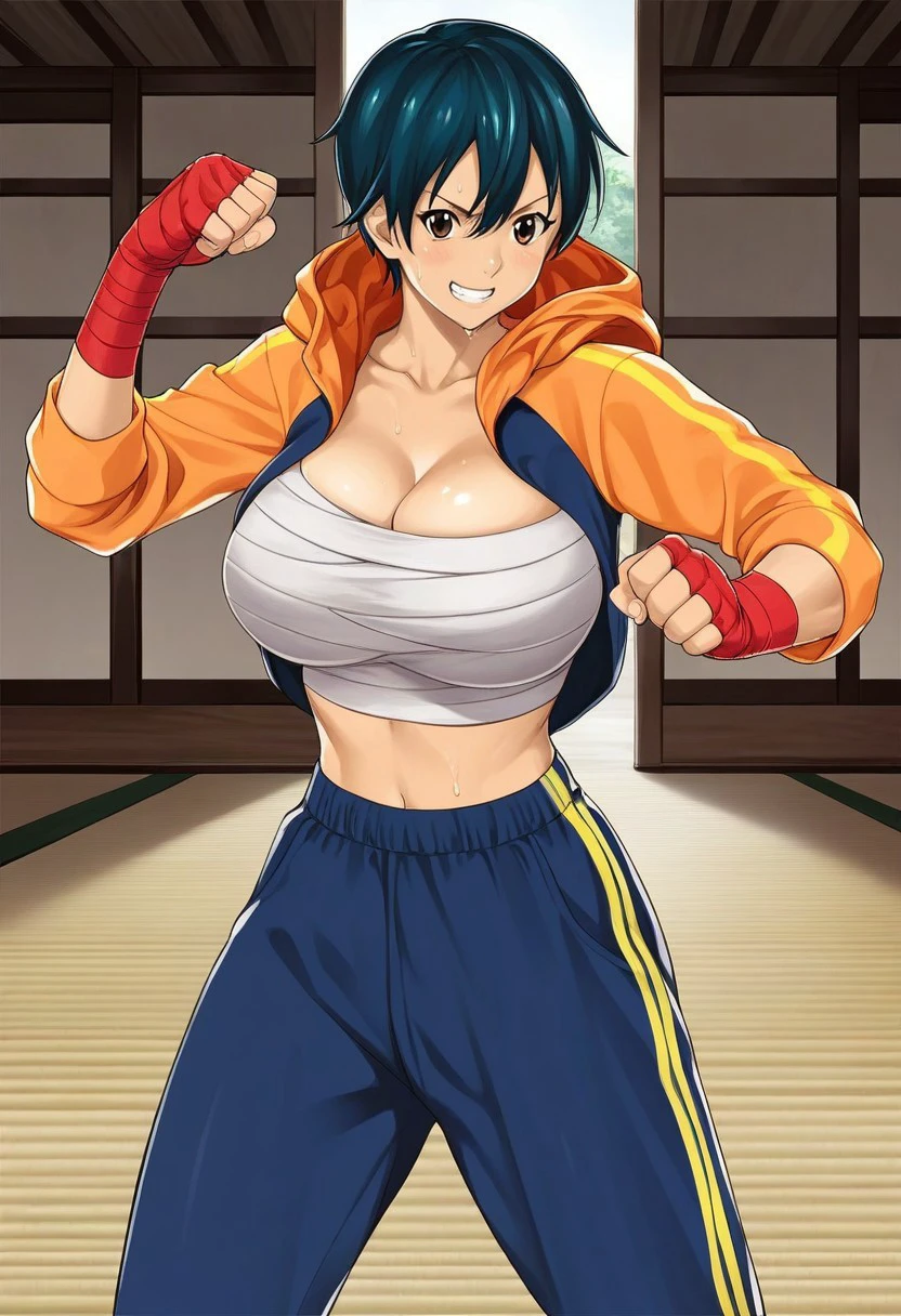 1st outfit: orange hooded jacket, white sarashi wrapped around breasts, navy blue joggers, red sneakers, red hand wrap,