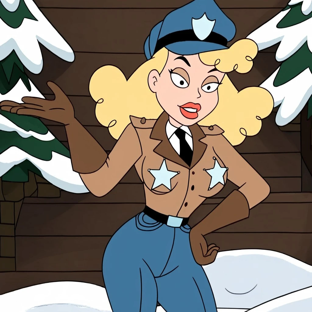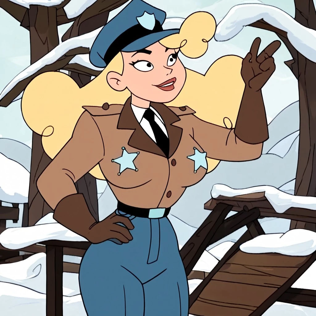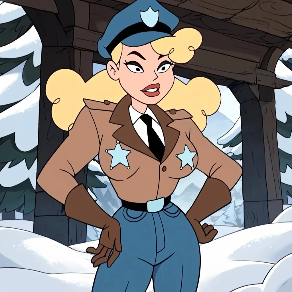 gloves, blue pants, collared shirt, black hair, police, black necktie, shirt, blonde hair,