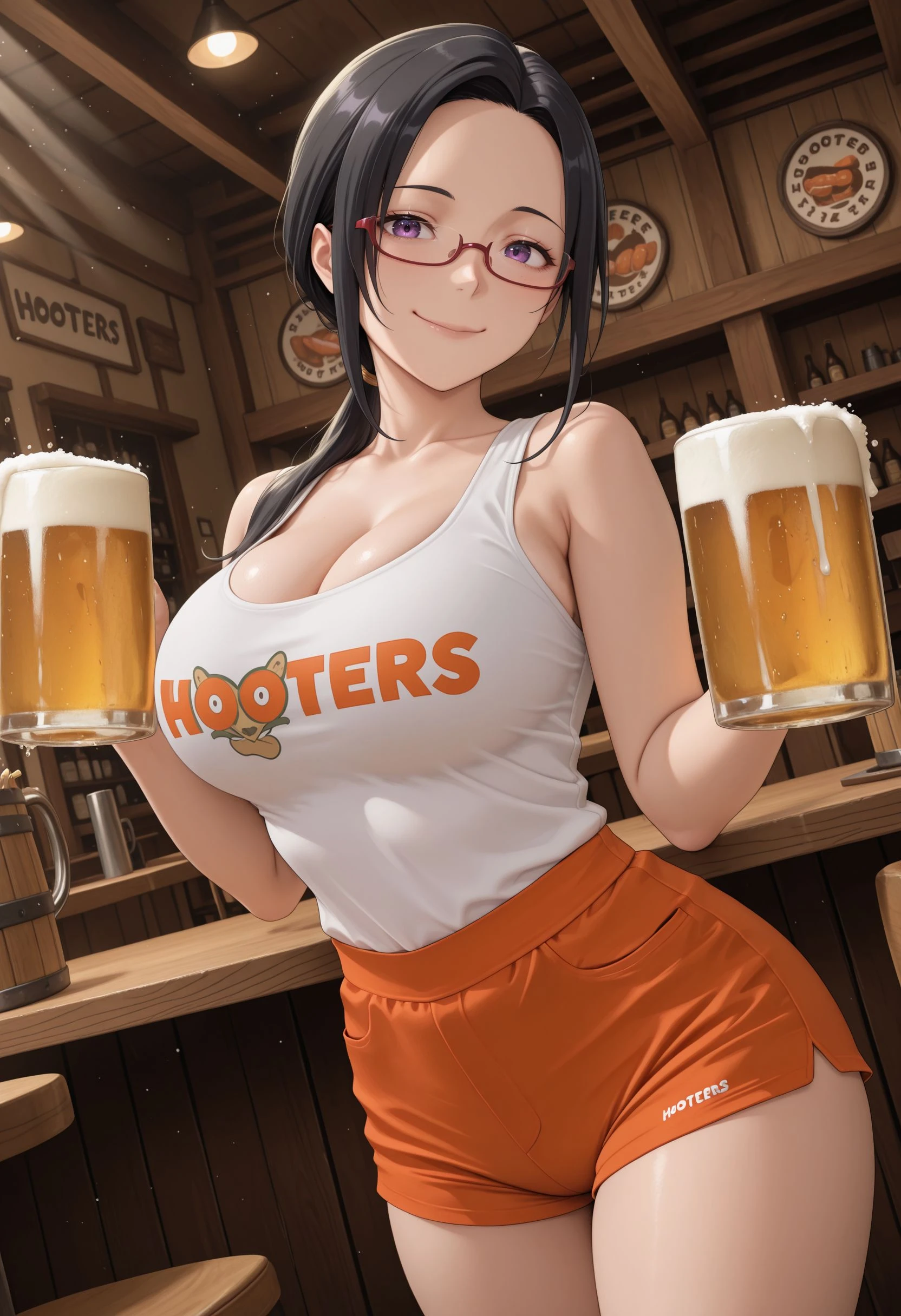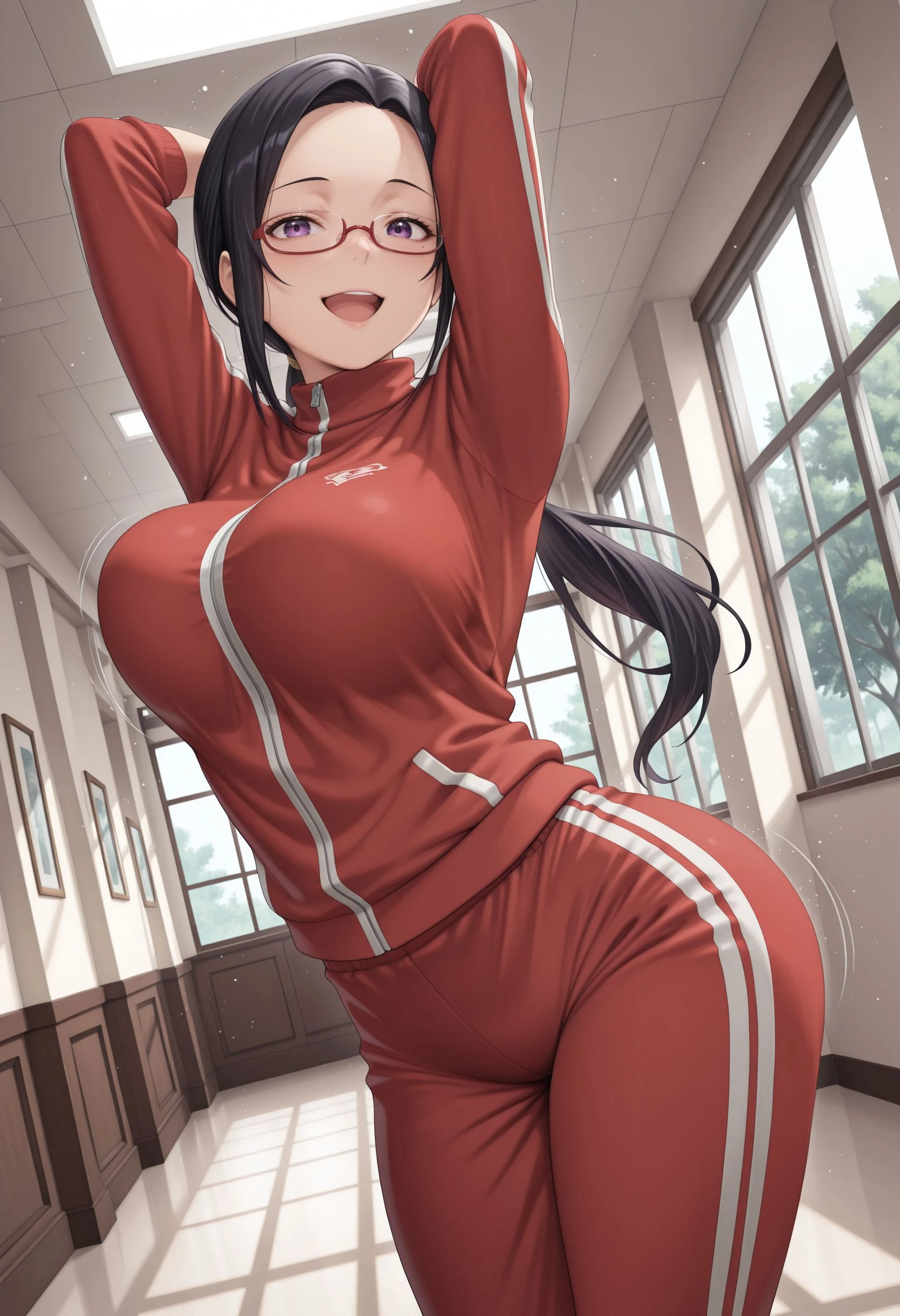 1girl, solo, mature female, curvy, long hair, black hair, low ponytail, yellow hair tie, parted bangs, forehead, purple eyes, red-framed eyewear, semi-rimless eyewear, large breasts, narrow waist, wide hips,