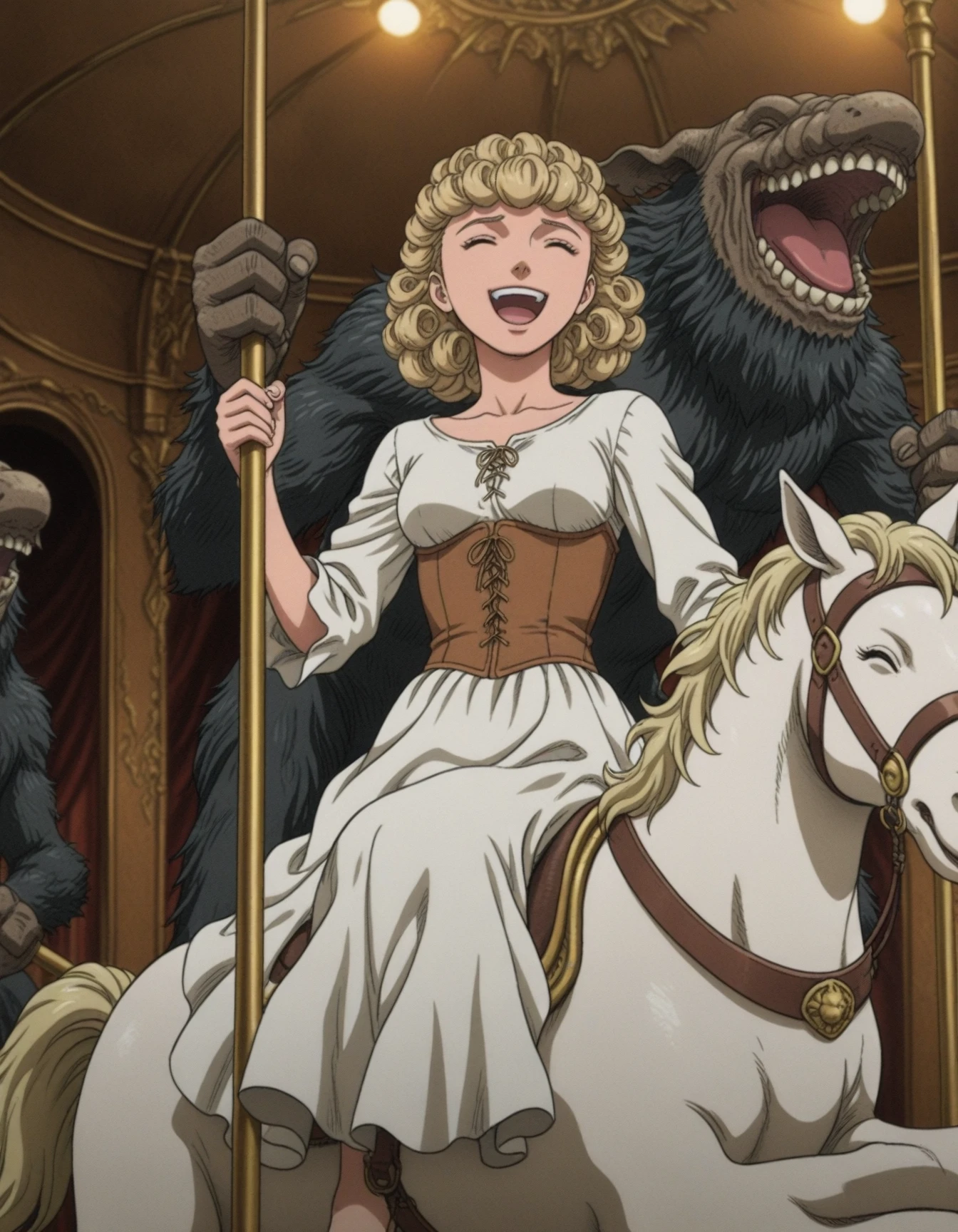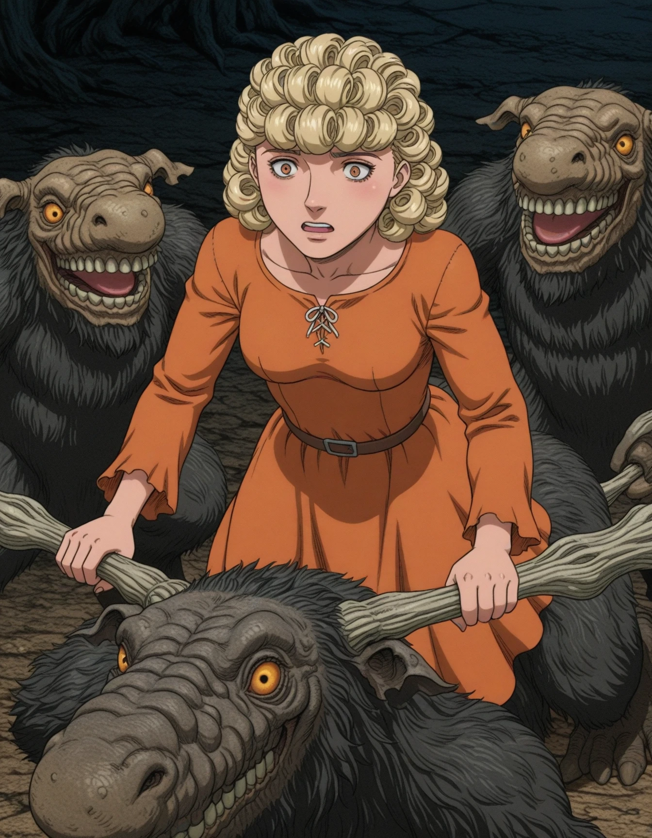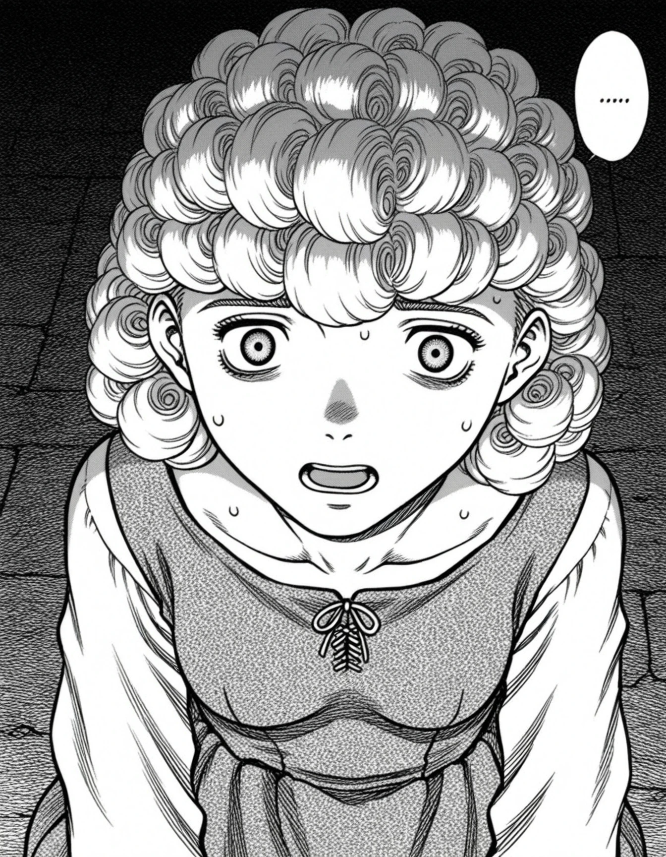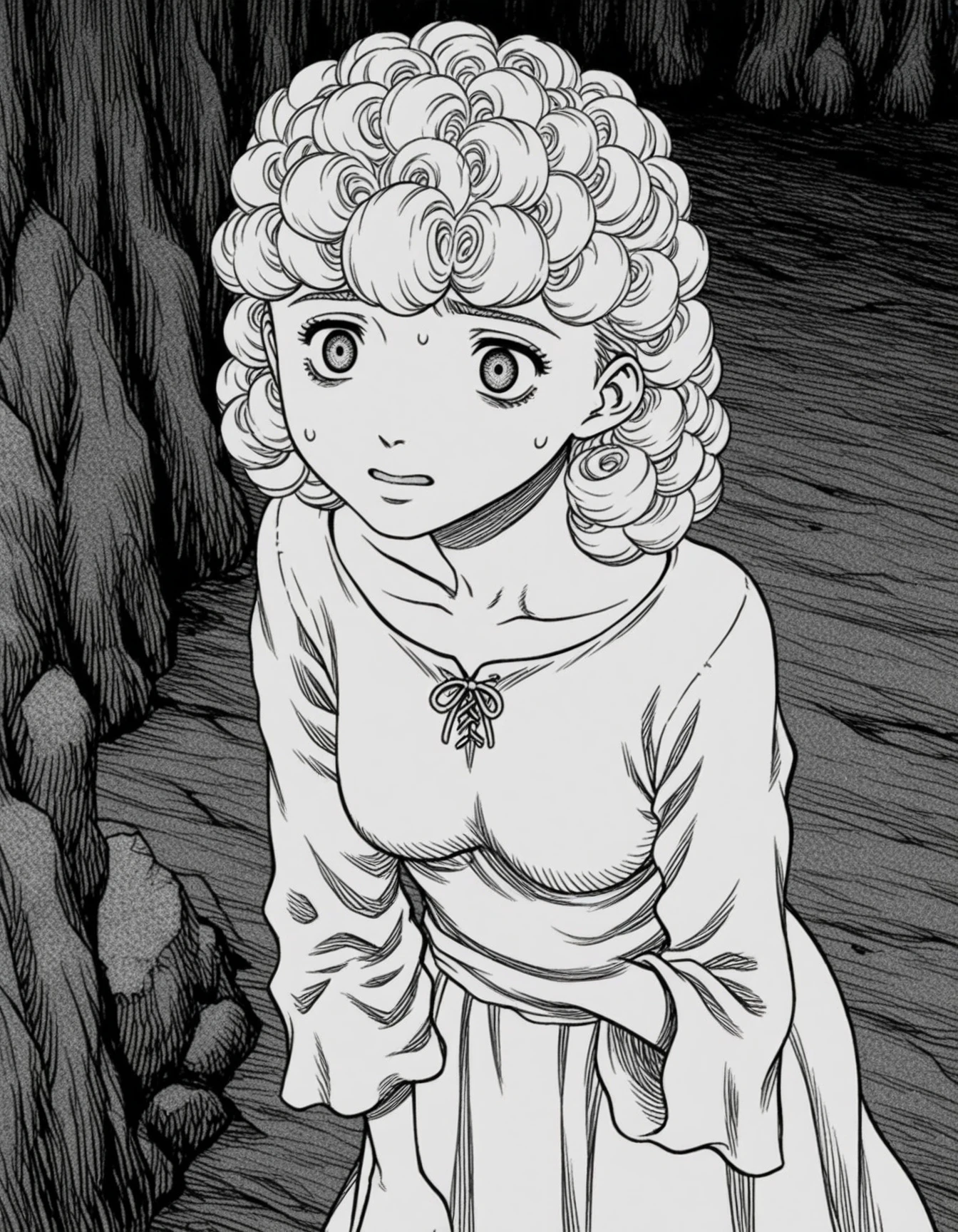 1girl,curly hair,dress,monochrome,greyscale