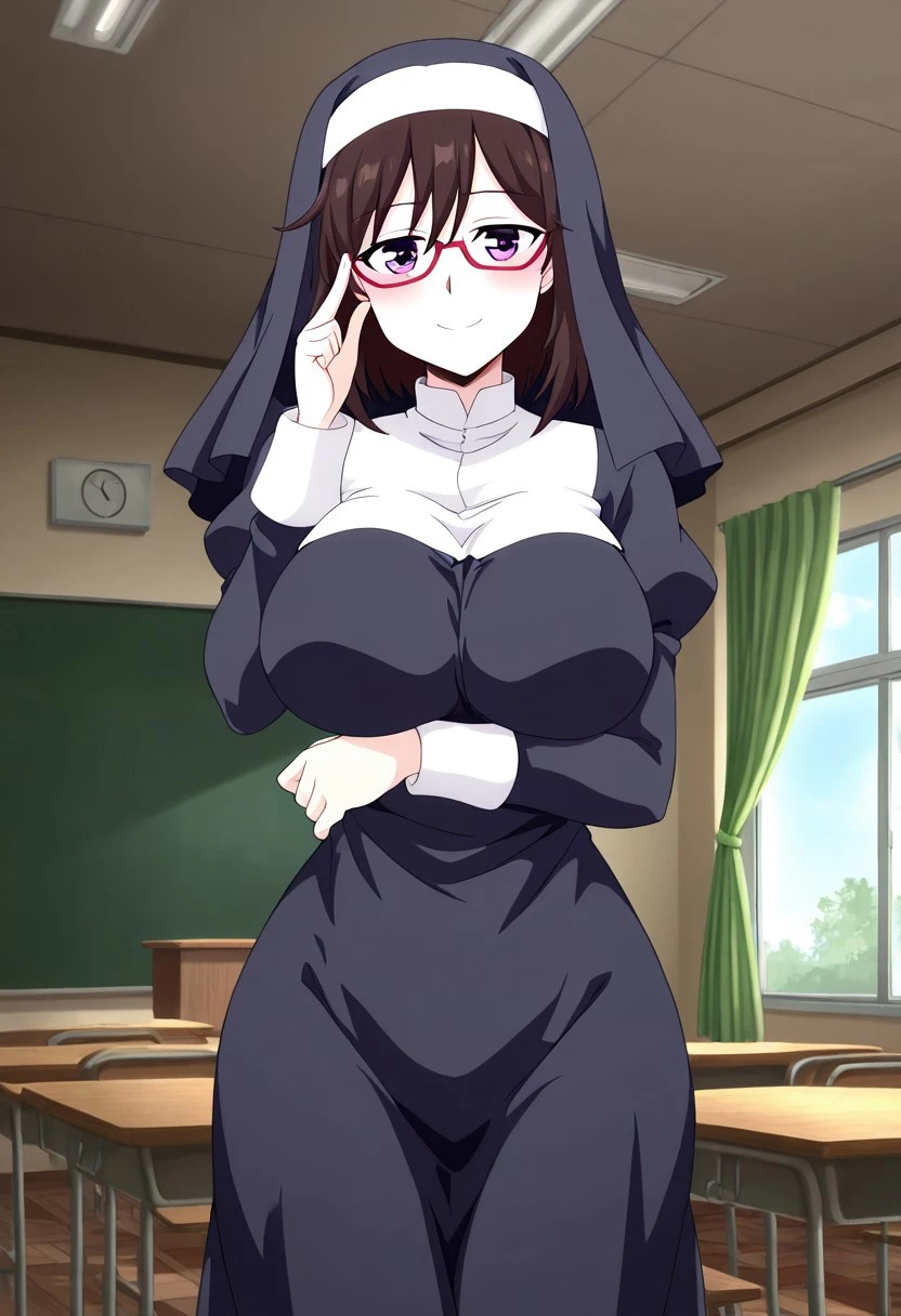 Oki Natsume, brown hair,purple eyes,shot hair, large breasts,red-framed eyewear,adjusting eyewear,glasses