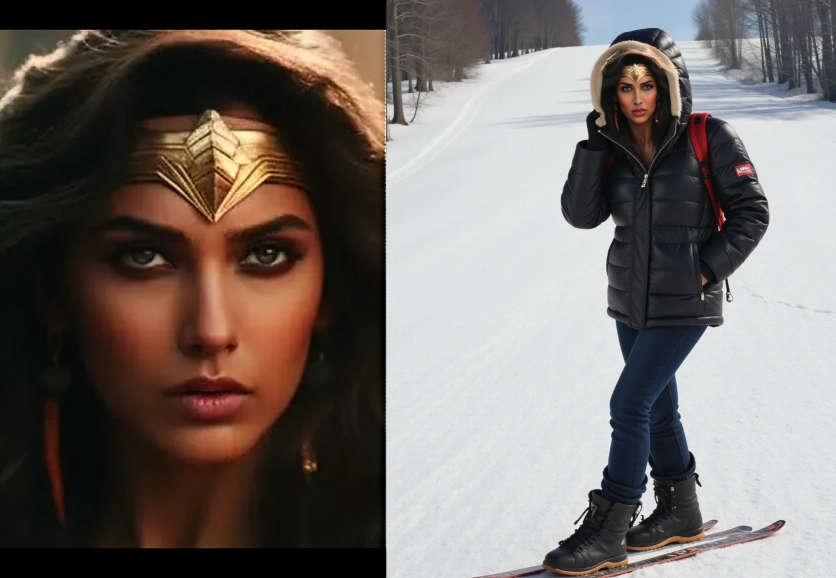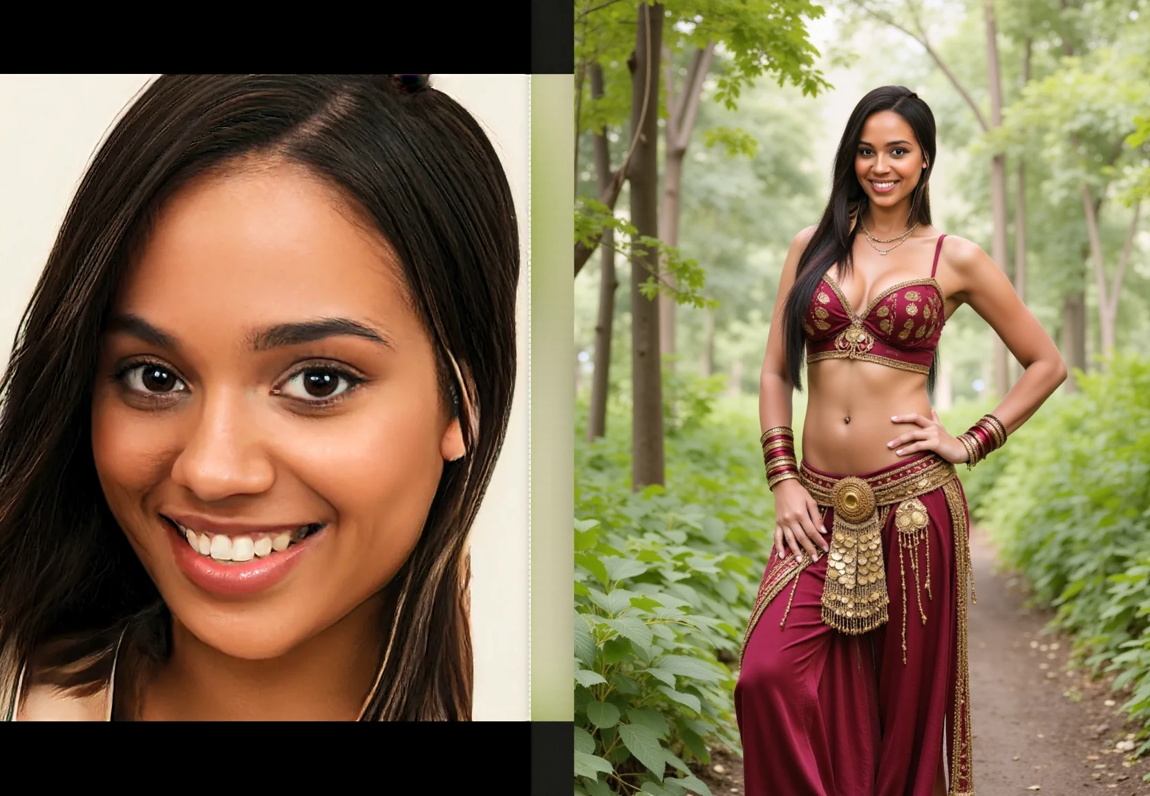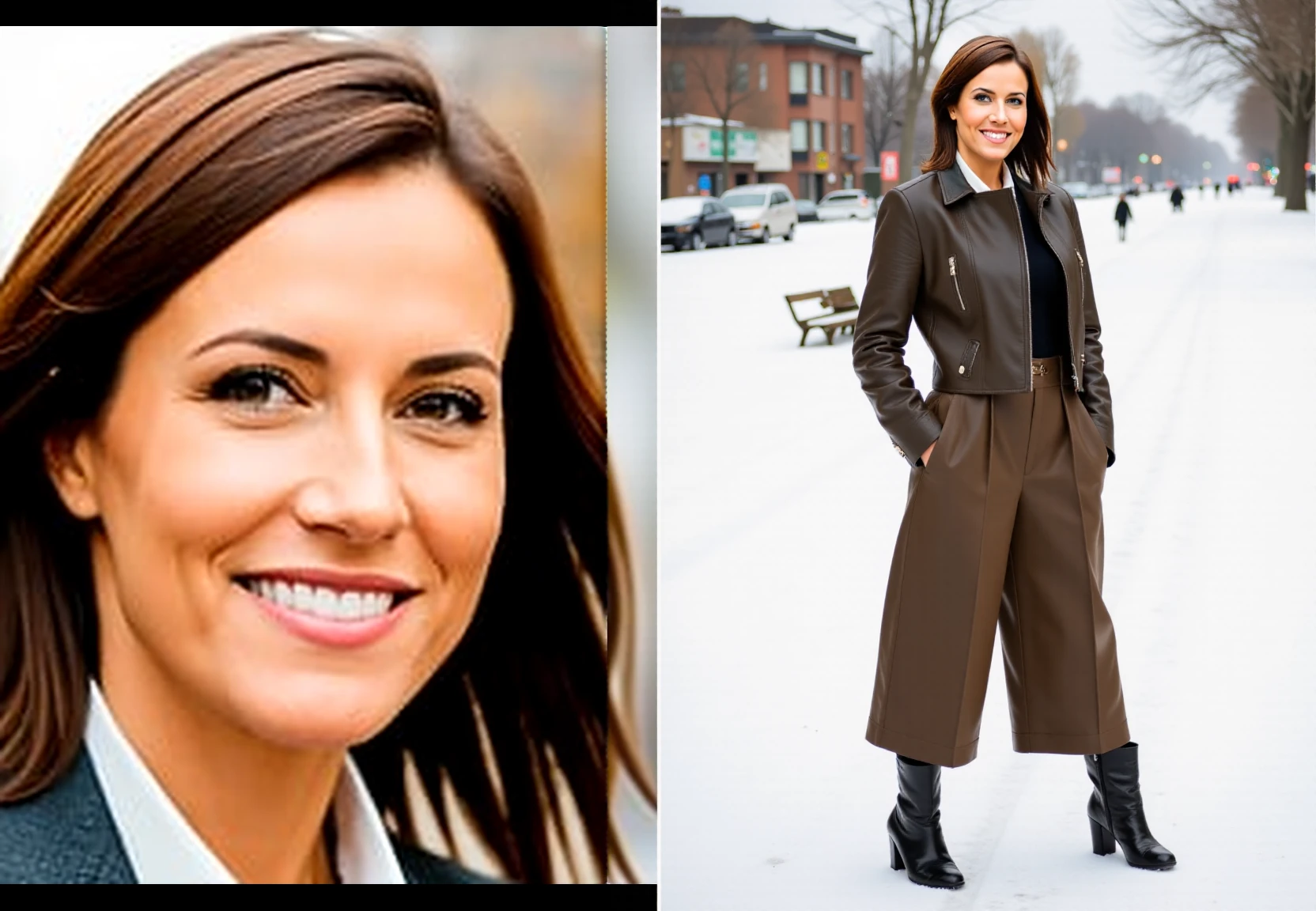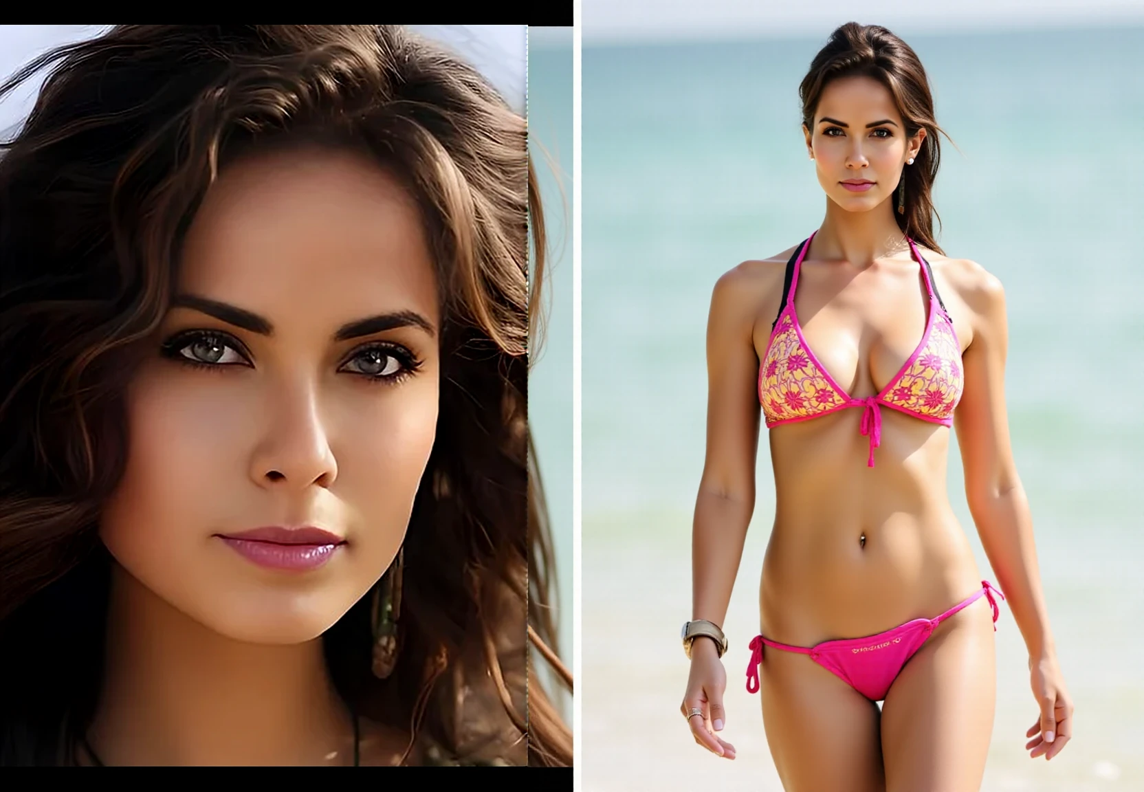 Trigger prompt: fchlpr, Side-by-side amateur photos: a close-up portrait and a half-body shot of a woman