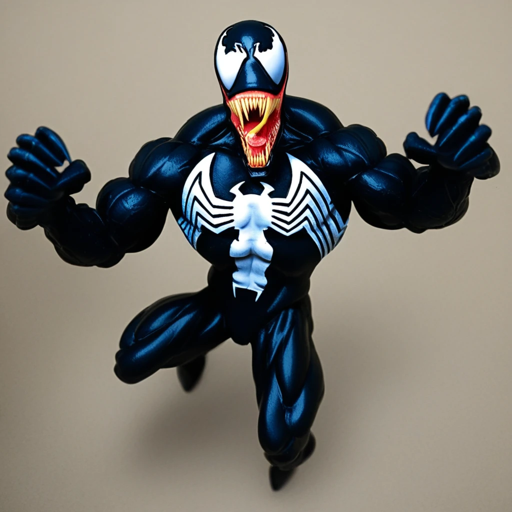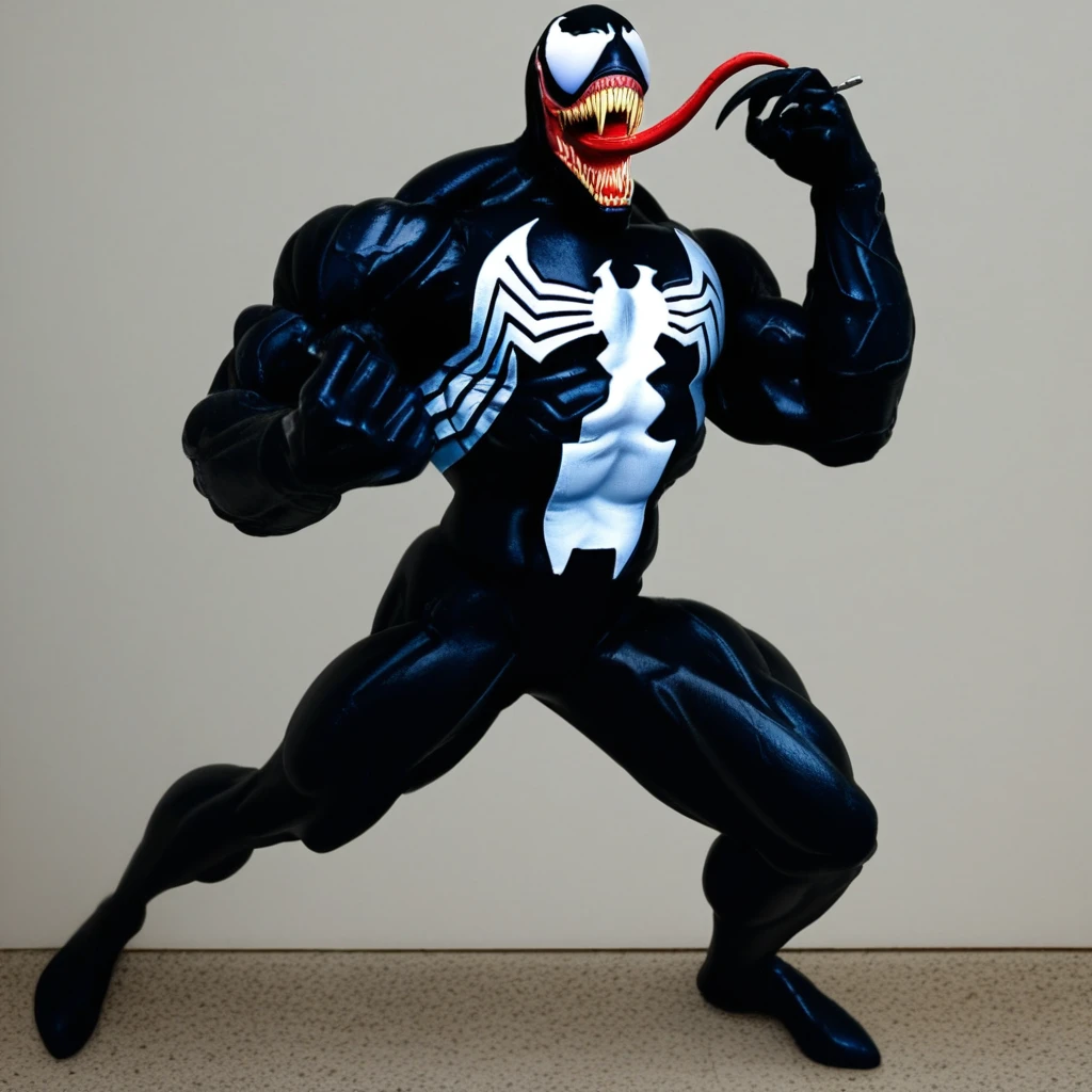venom, symbiote, cel shaded, comic book, 90s, markbagley, tongie, green saliva, fangs, muscular build, broad shoulders, thick neck, narrow waist, elongated dome head, jagged white eyes with tapering points, monstrous wide grin, sharp needle-like teeth, minimal tongue, sinister expression, barrel chest, defined abs, bold white spider emblem with thick legs wrapping torso and back, smooth glossy black suit, massive arms and exaggerated forearms, huge claw-like hands with stretched fingers, powerful proportionate legs, large feet, deep black body with glossy sheen, blue and purple highlights, yellow teeth, minimal pink tongue, clean spandex-like surface, terrifying and predatory, aggressive animalistic posture, horror menace, blue highlights, blue,