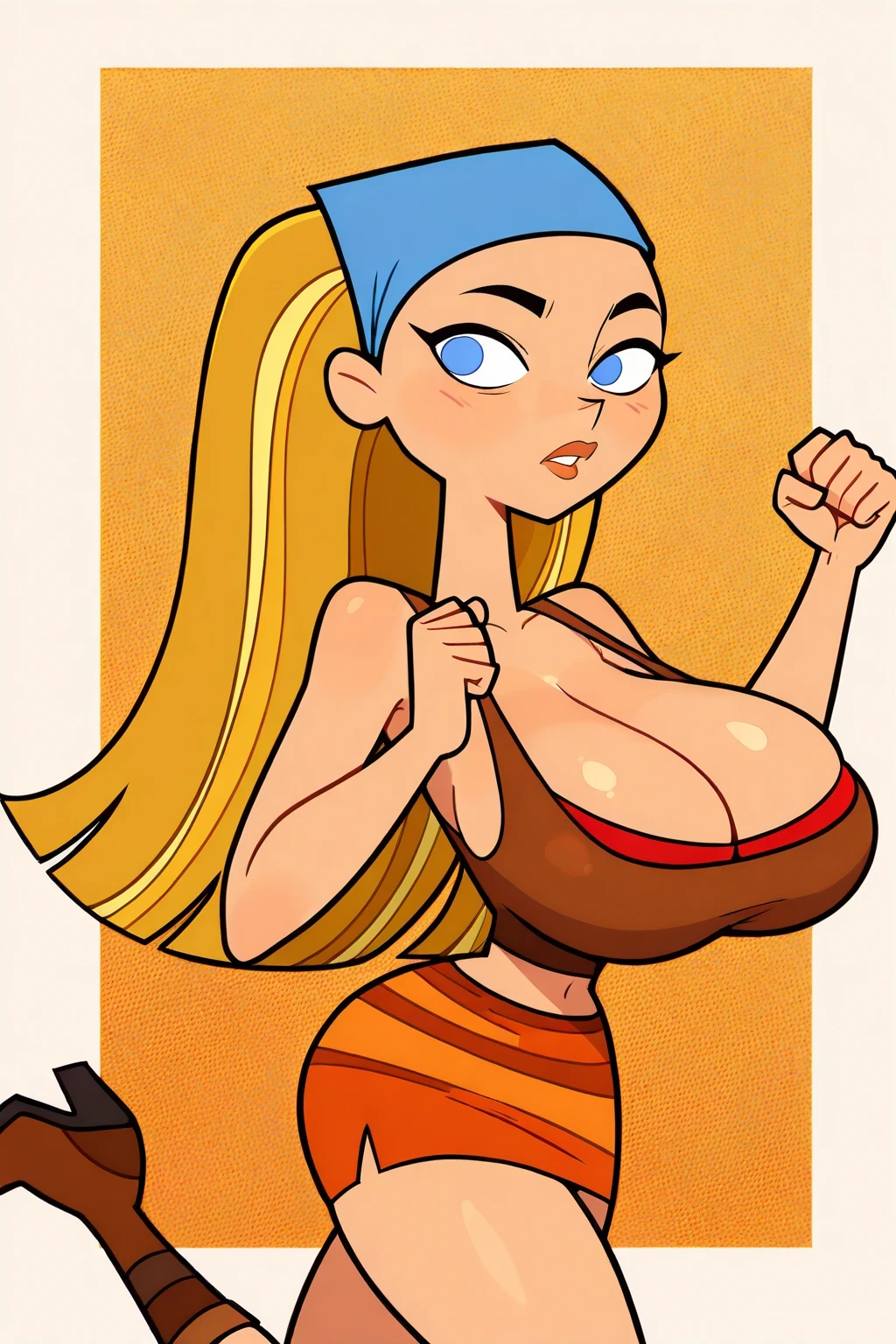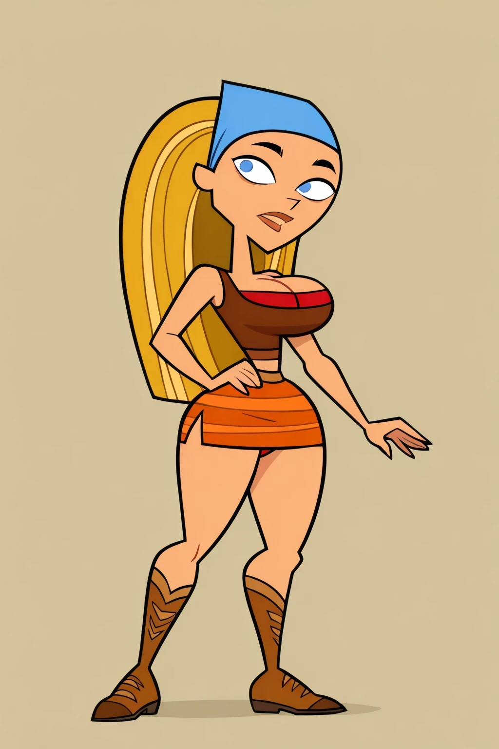 LindsayTDI, 1girl, long blonde hair, blue bandana, brown crop top, red bikini, big breasts, brown boots, orange skirt, black eyebrows, lips, big lips, lindsay (total drama),
