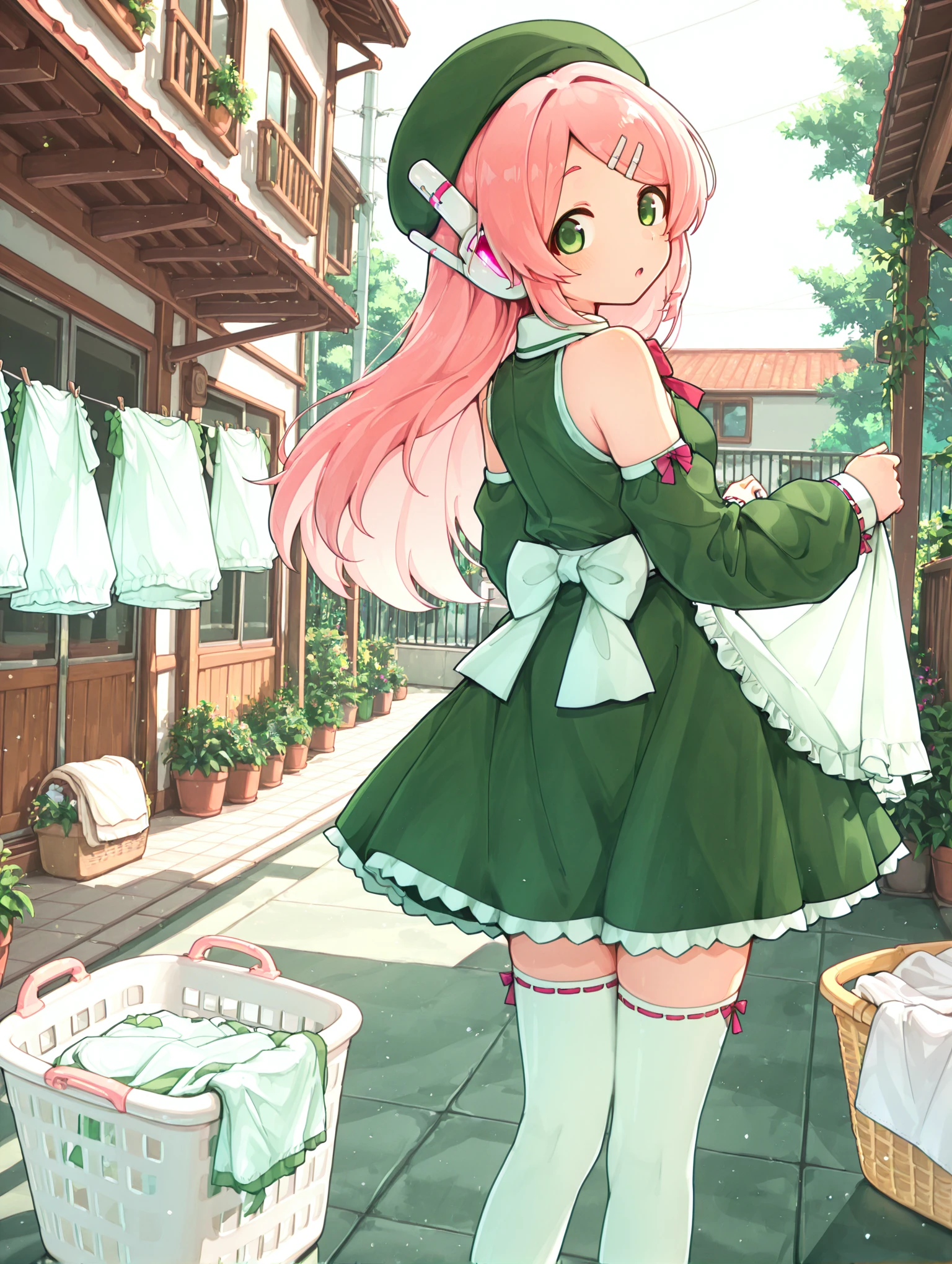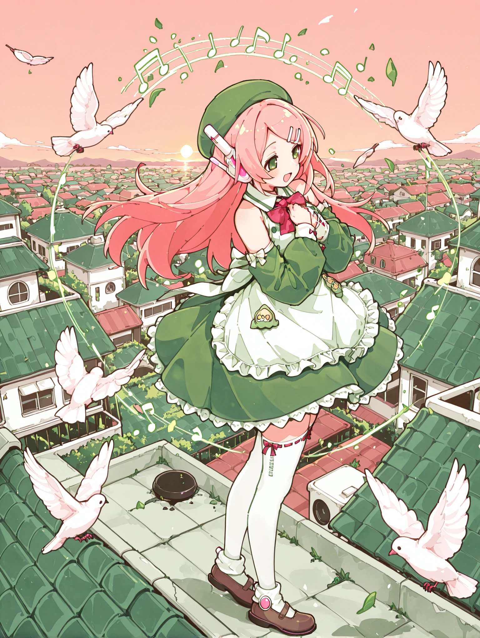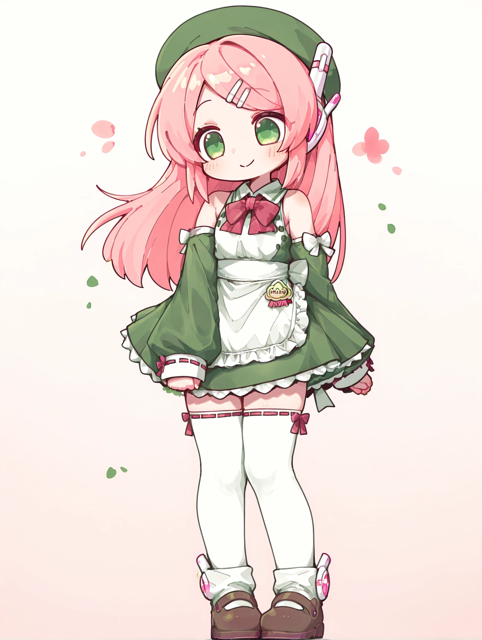 green beret, detached sleeves, green maid, white thighhighs, brown mary janes