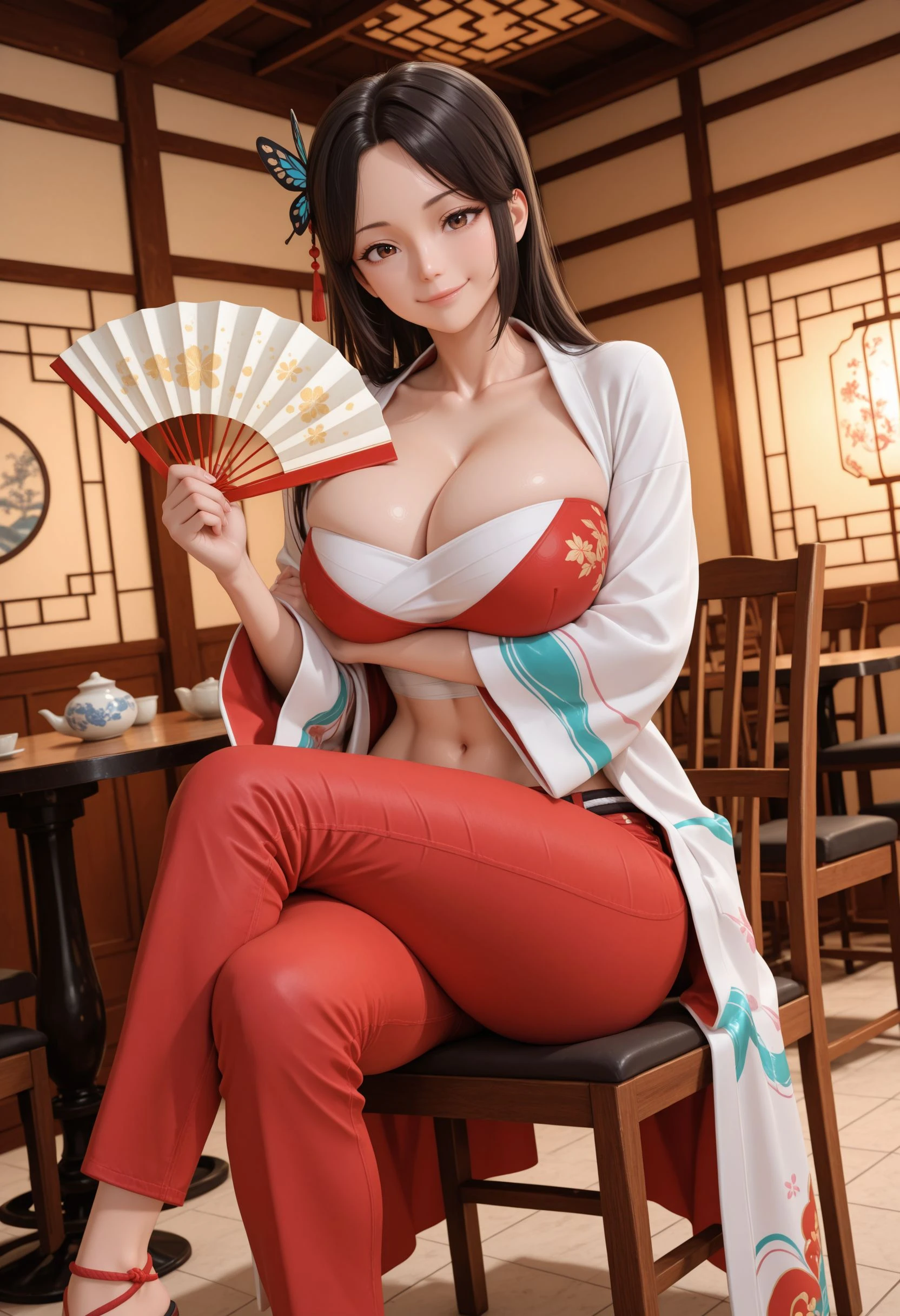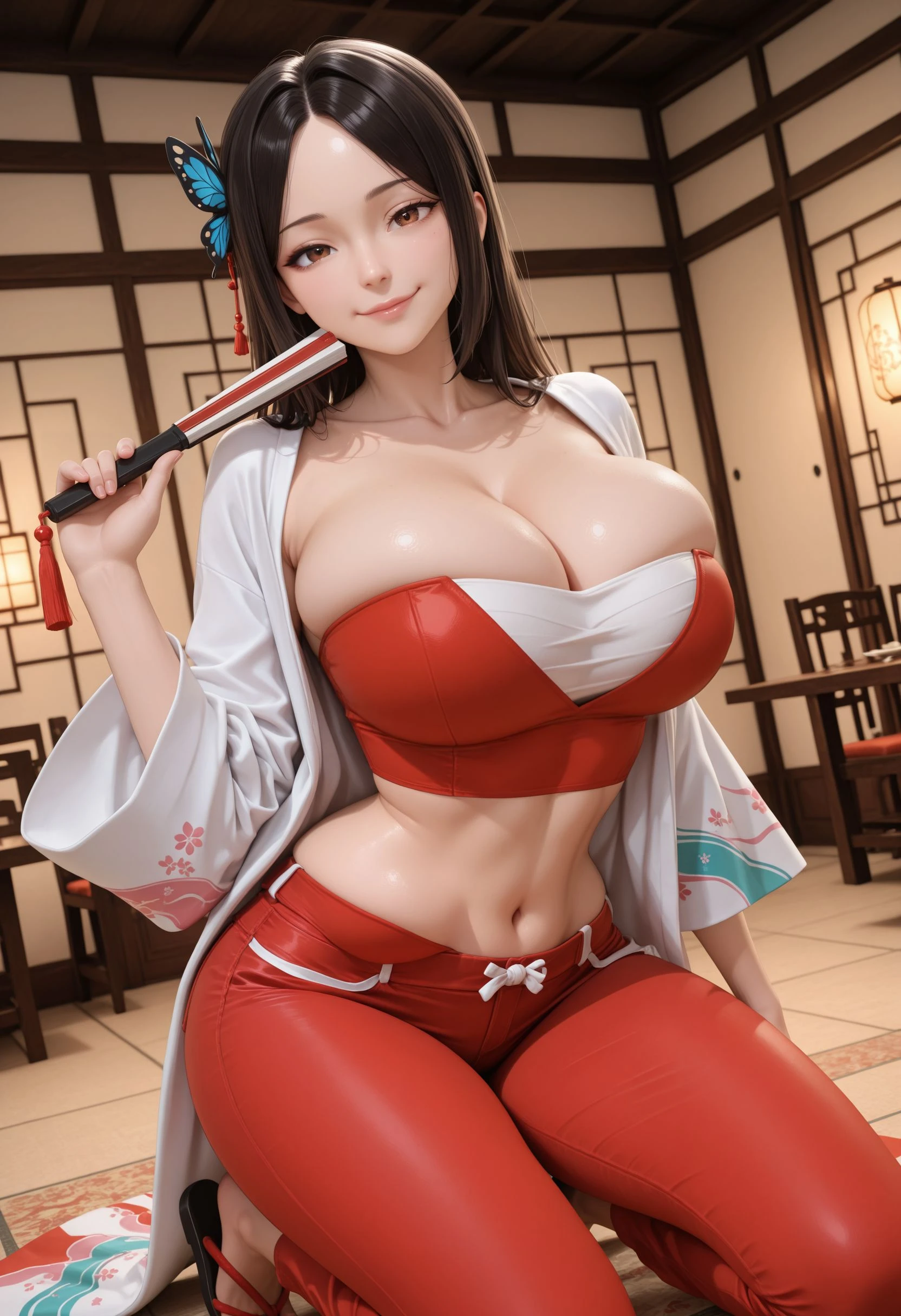 Street Fighter 6 Alt: sf6_alt_mai, black hair, straight hair, parted bangs, butterfly hair ornament, red crop top, bandaged chest, embroidery, collarbone, cleavage, navel, multi-colored coat, red jeans, red sandals,