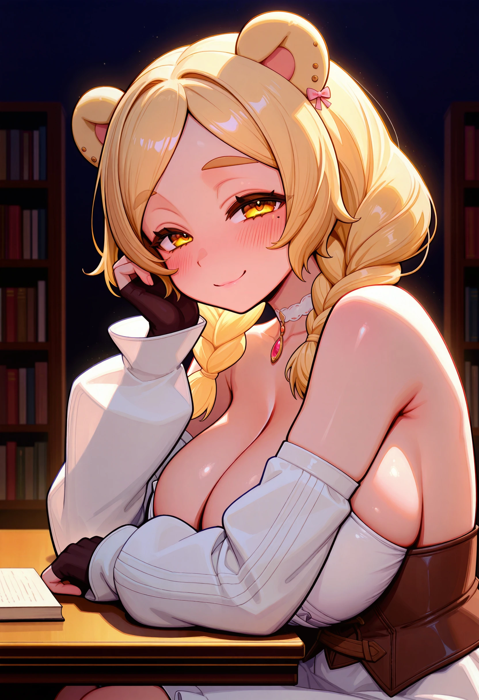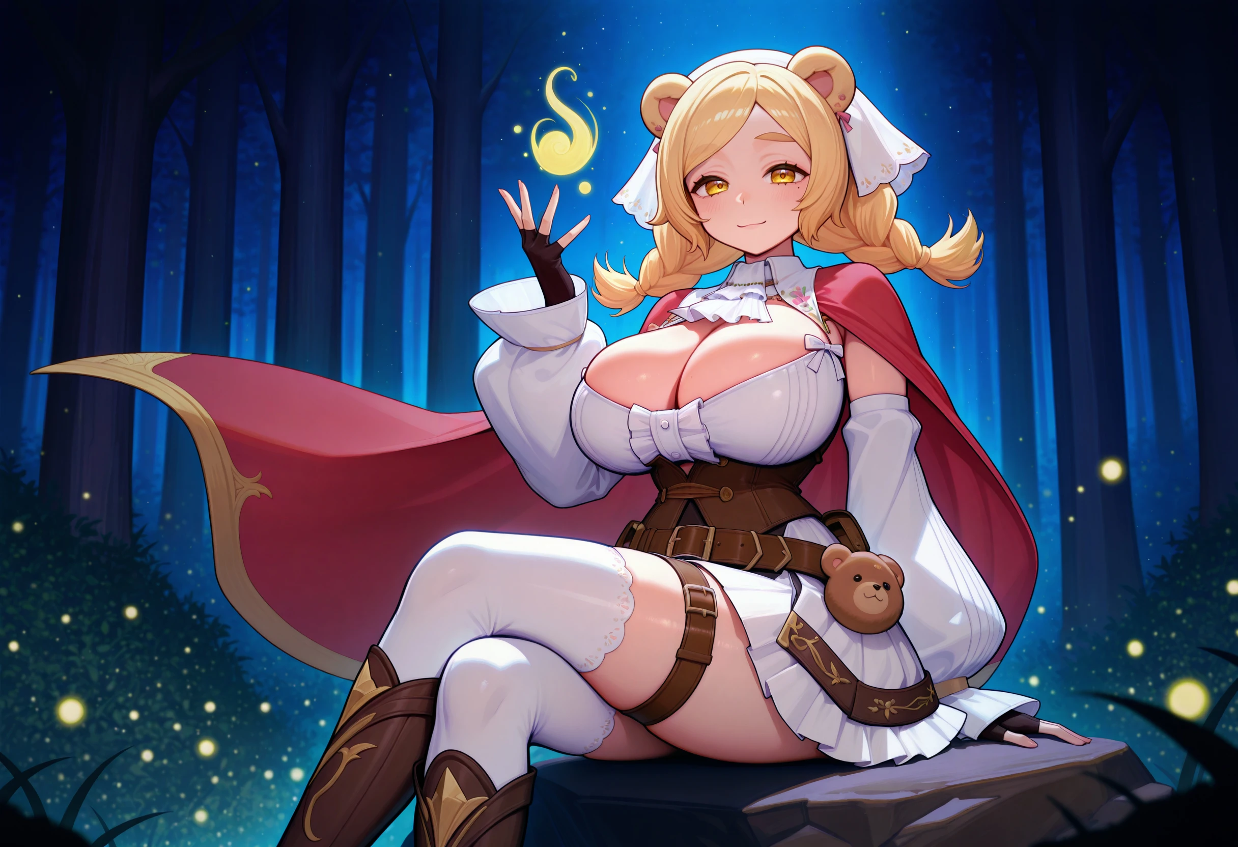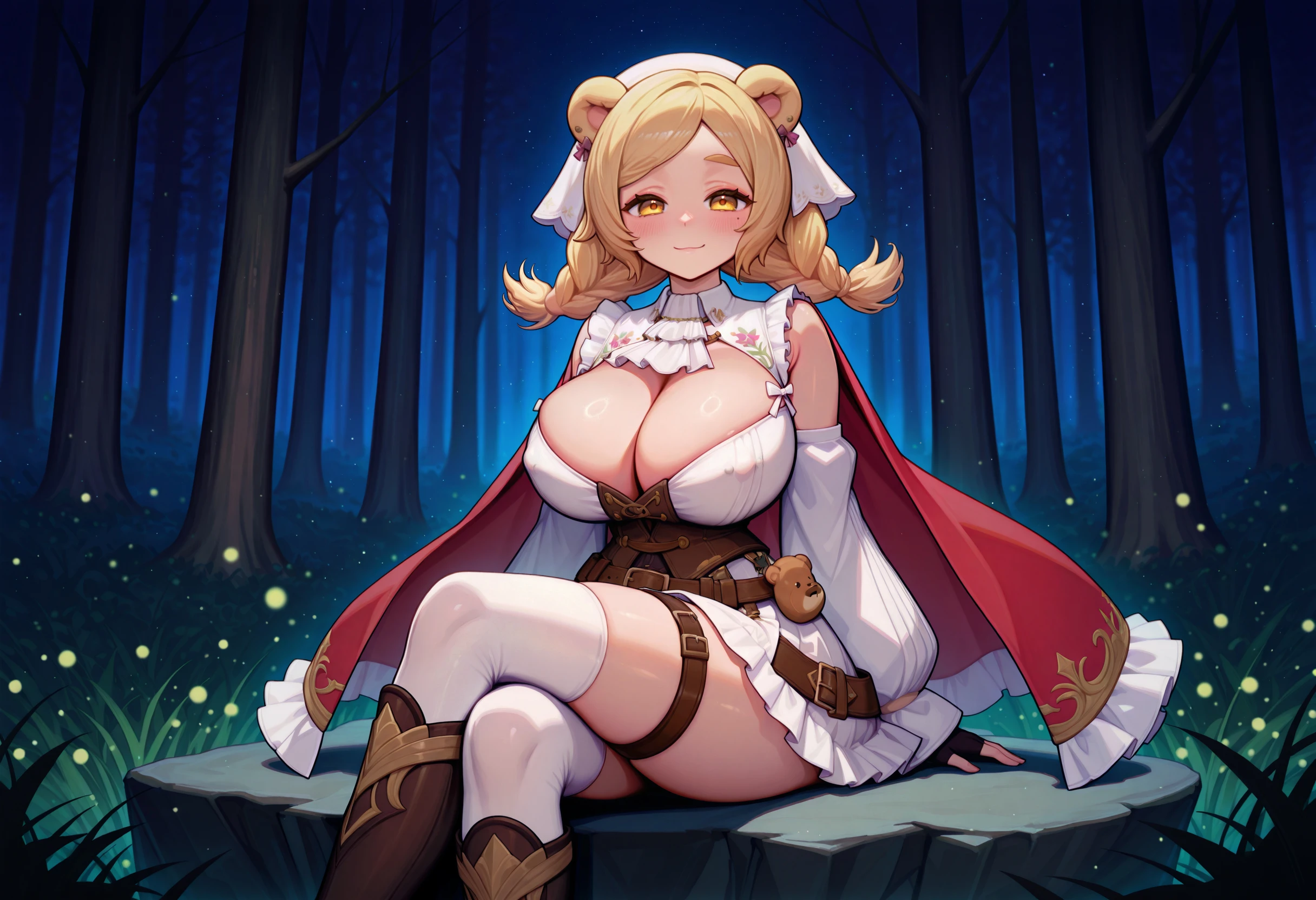 freyaguma, plump, yellow eyes, bear ears, large breasts, flipped hair, twin braids, bonnet, mole under eye, red cape, cleavage, ascot, white sleeveless dress, corset, detached sleeves, sleeves past wrists, fingerless gloves, white skirt, white over-kneehighs, bridal legwear, toe ring, single thigh strap, open knee boots, sandals