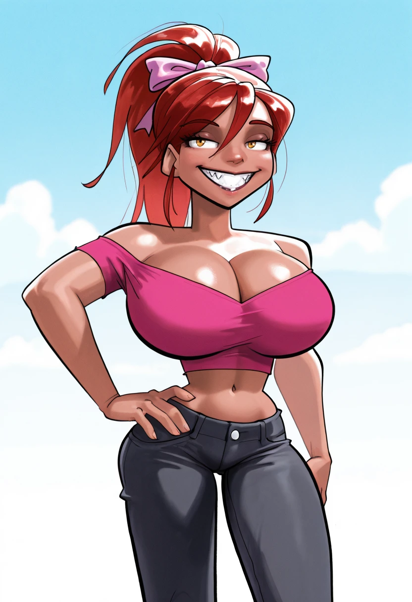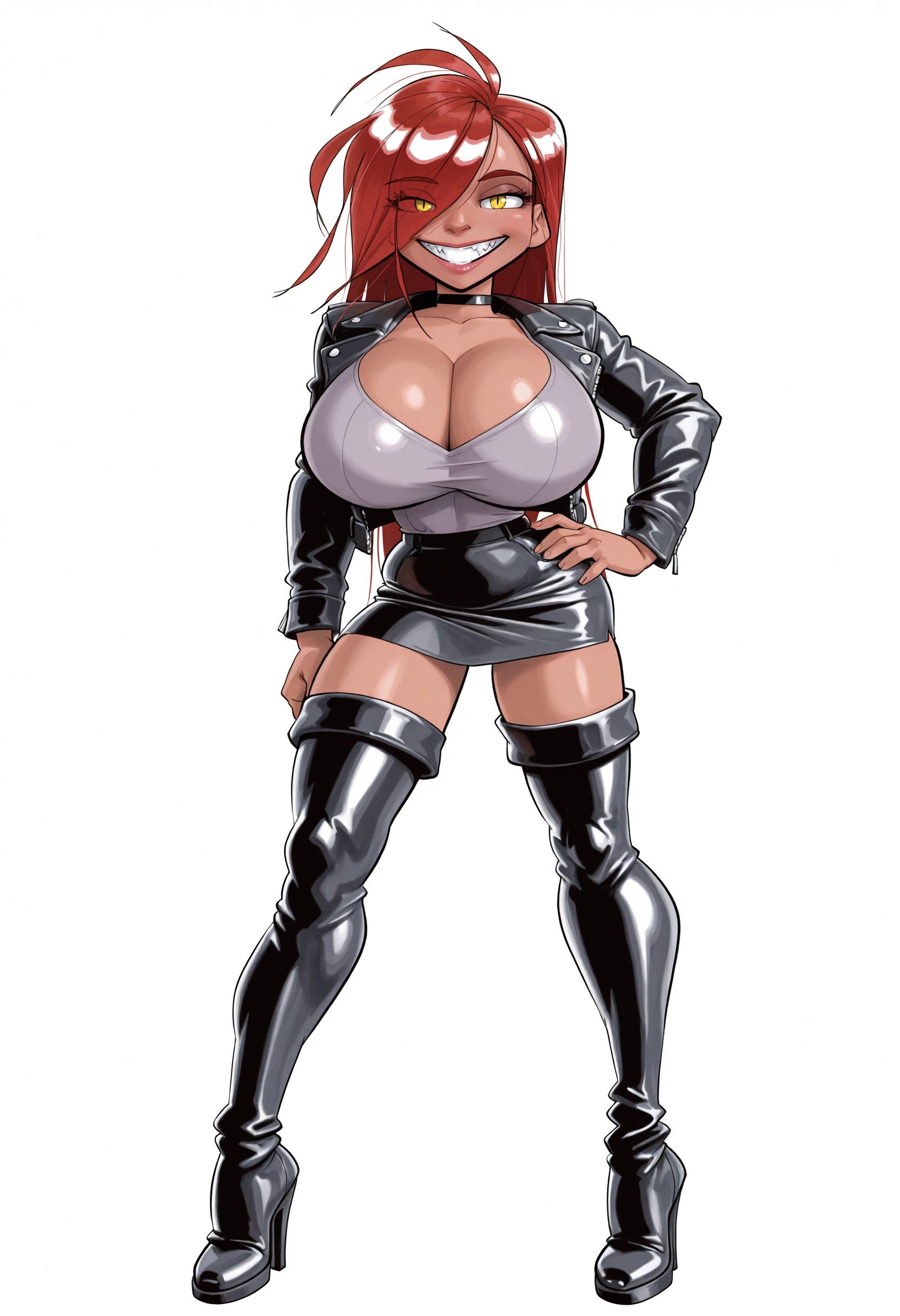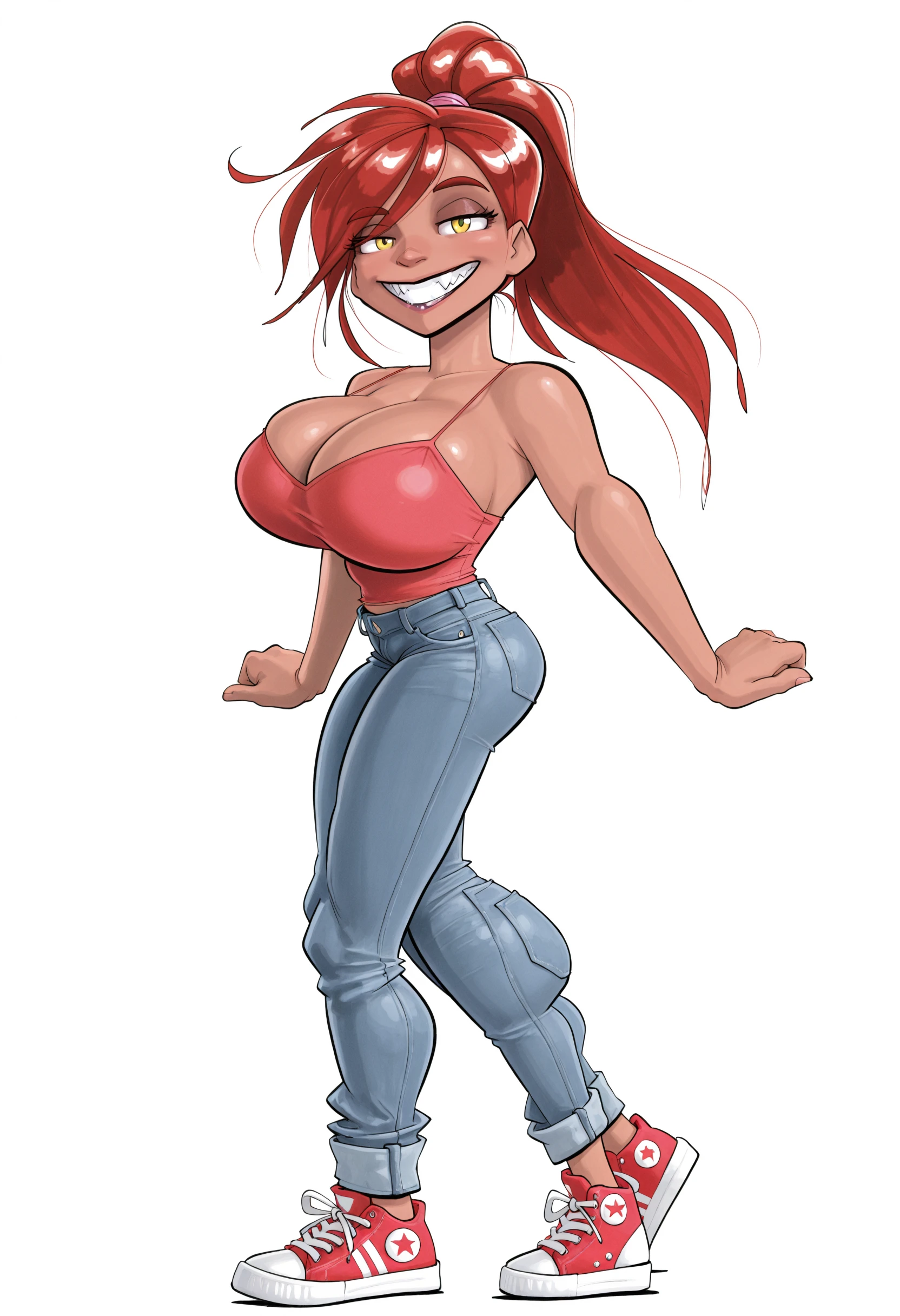 1girl, monica, very short, red hair, dark skin, huge breasts, full lips, slim waist, small ass, round ass,