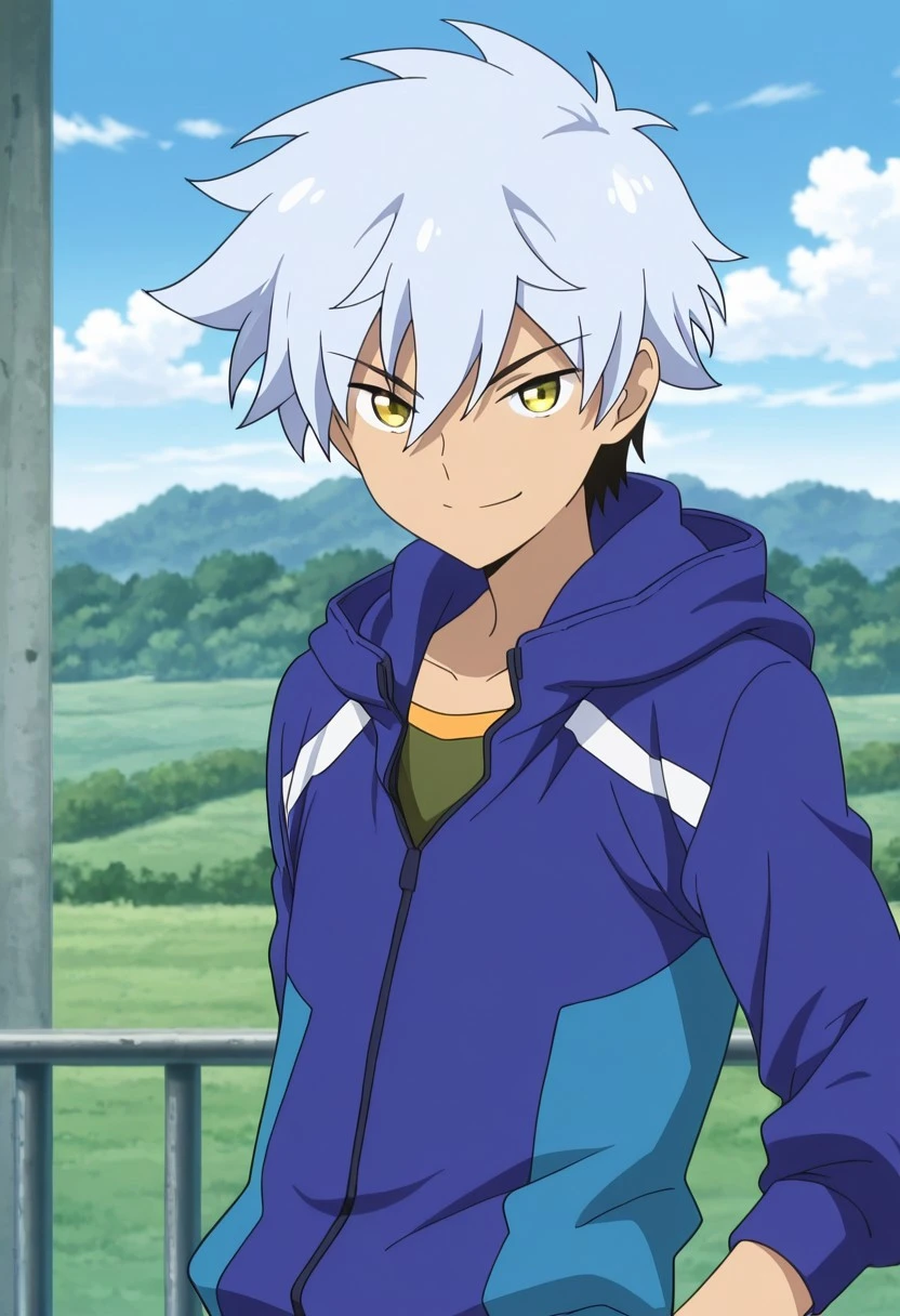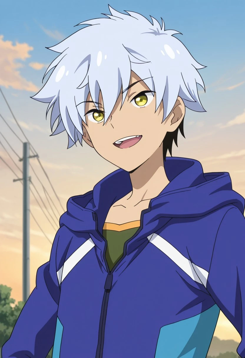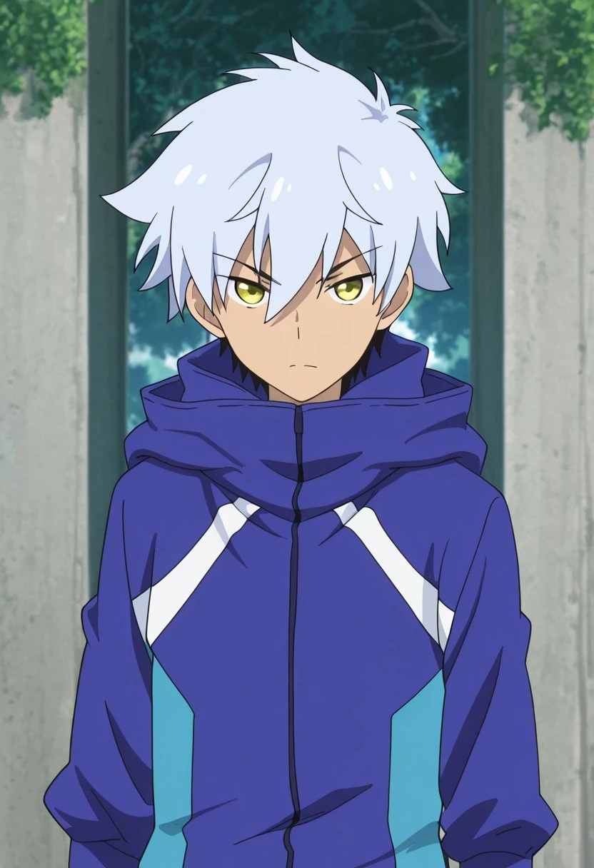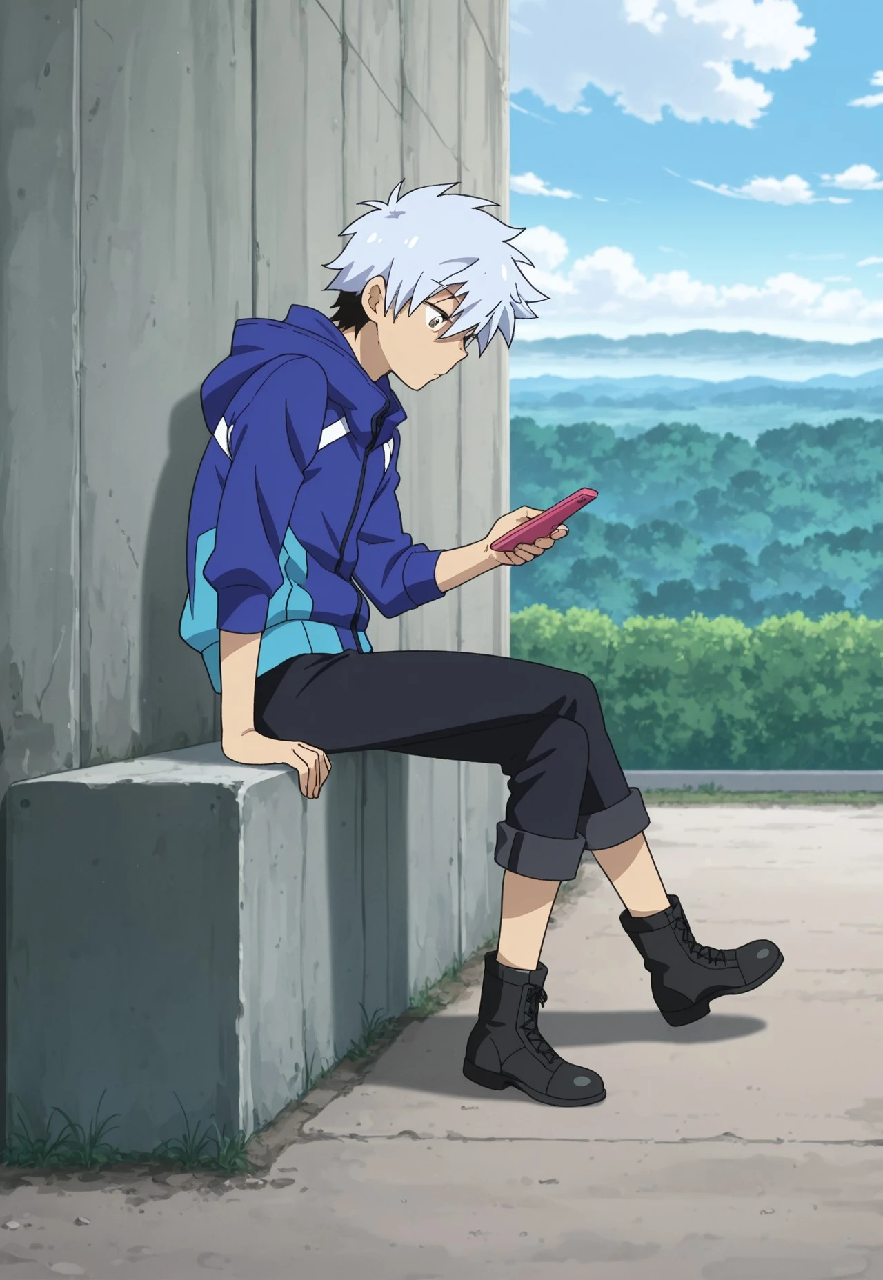 1boy, male focus, solo, yellow eyes, grey hair, blue jacket, hood, partially unzipped, green undershirt, black pants, pants rolled up, boots, black footwear,