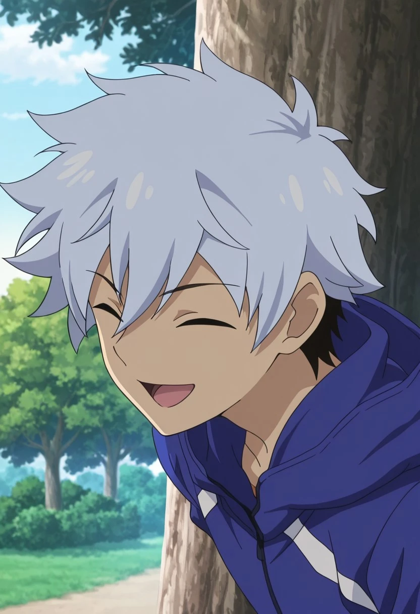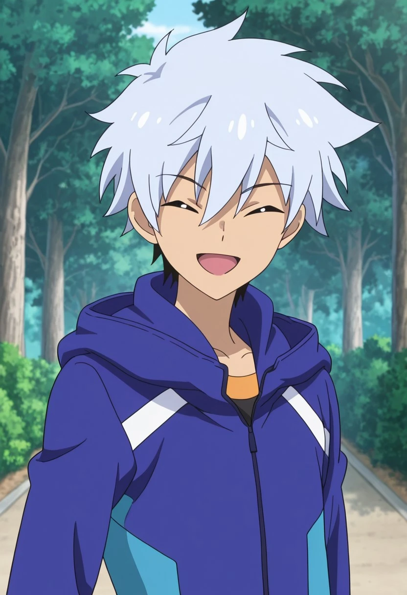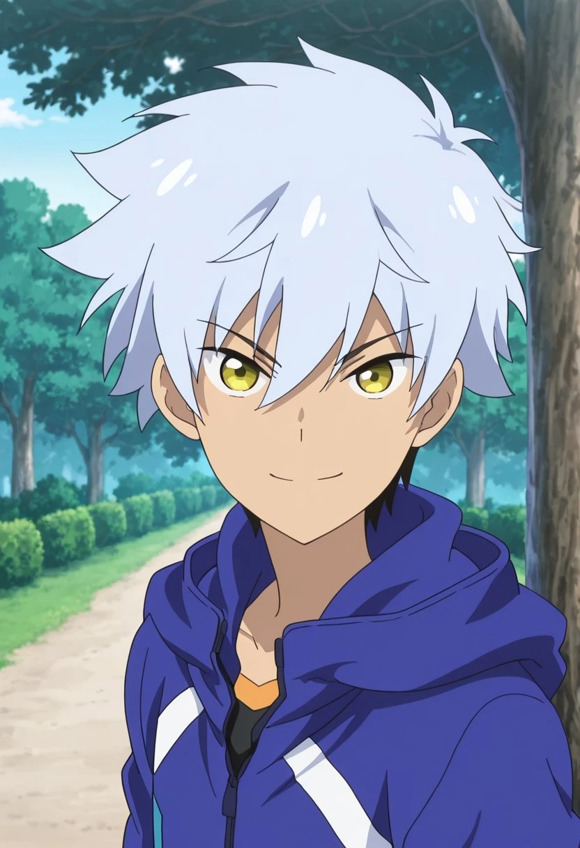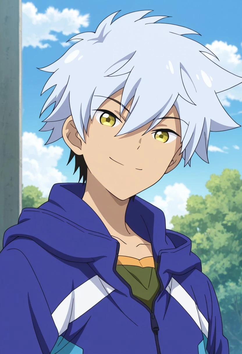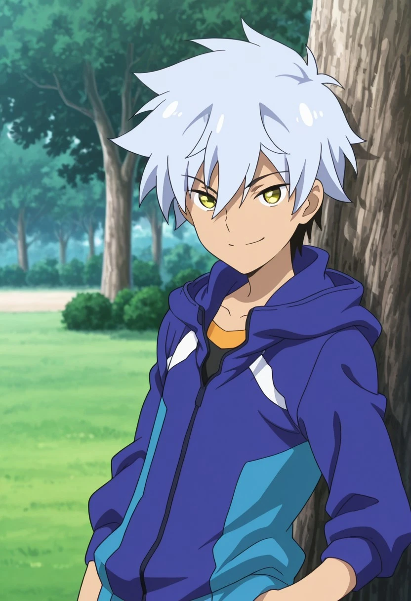 1boy, male focus, solo, yellow eyes, grey hair, blue jacket, hood, partially unzipped, green undershirt, black pants, pants rolled up, boots, black footwear,