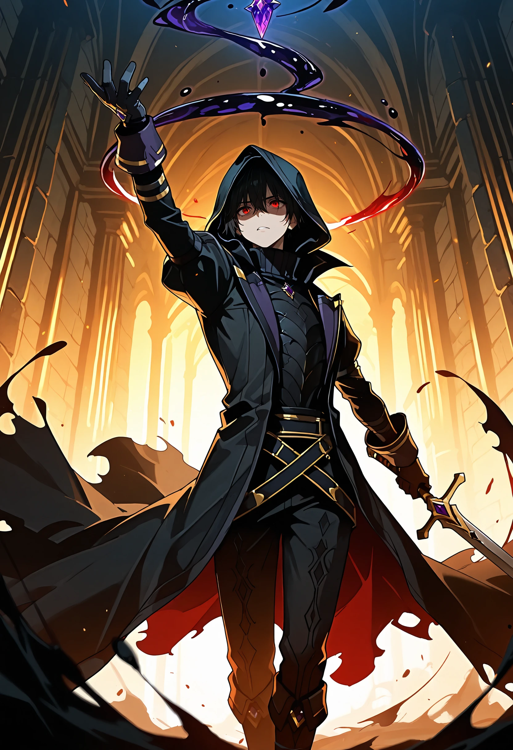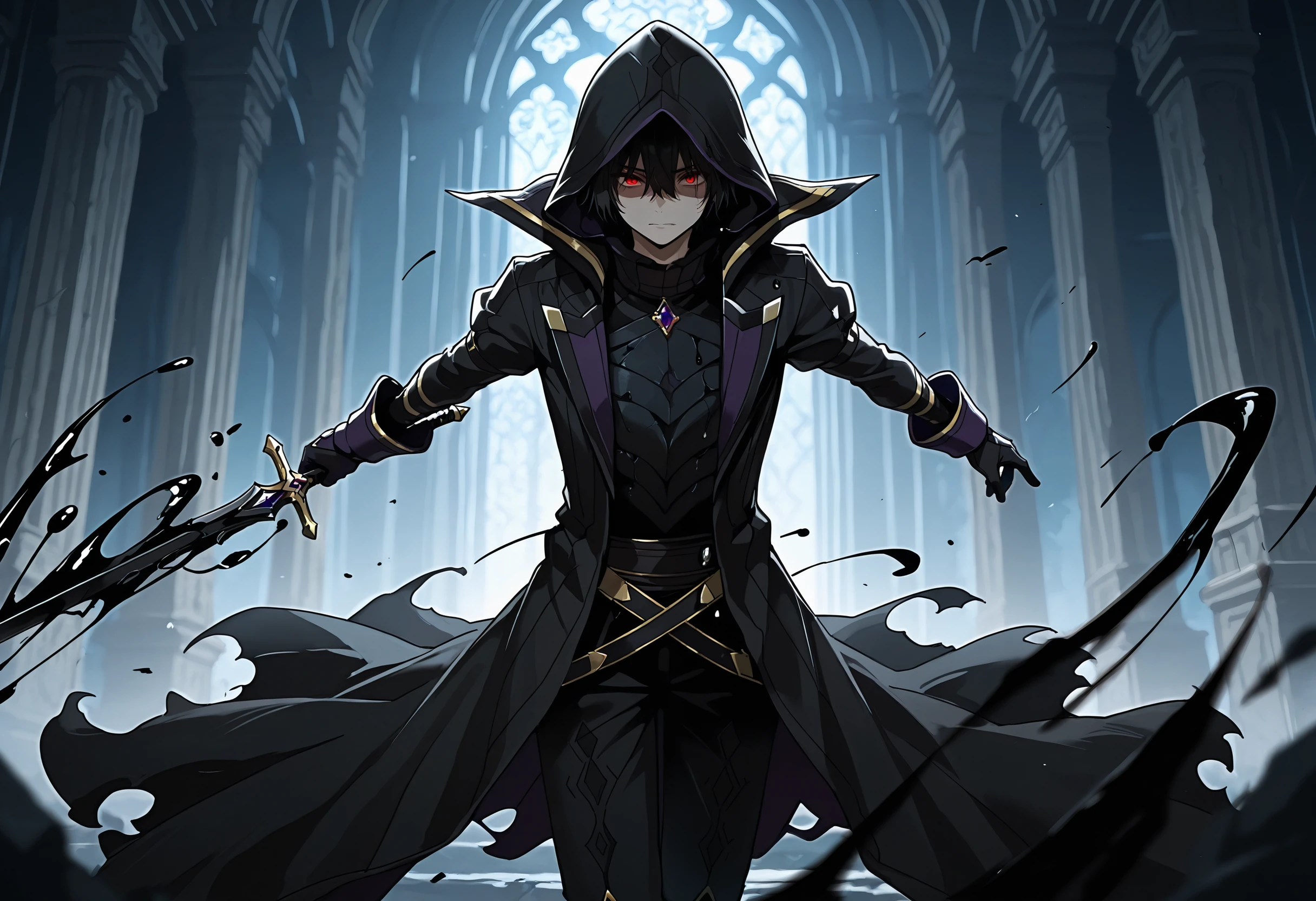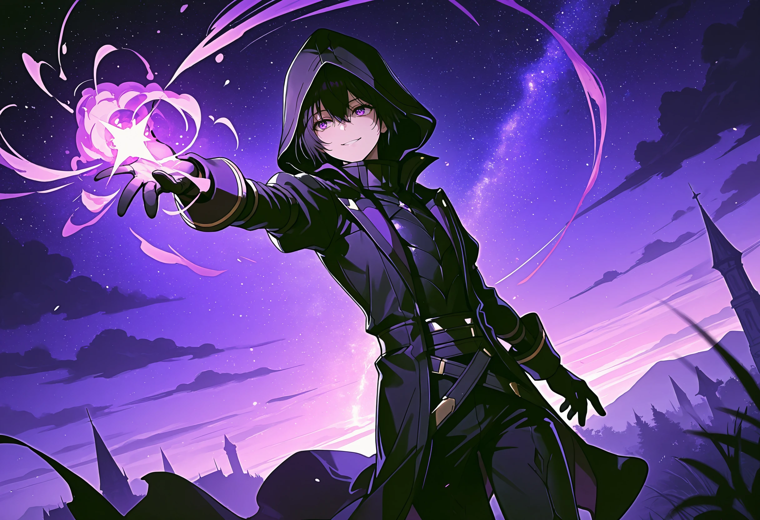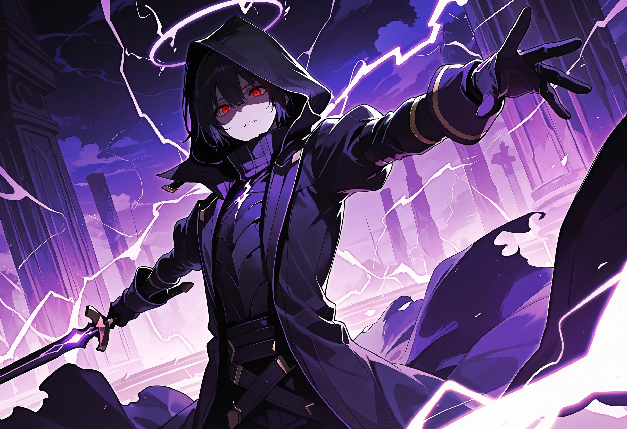 Optional: holding sword, black sword, dynamic pose, action scene, halo, outstretched arms, purple lightning