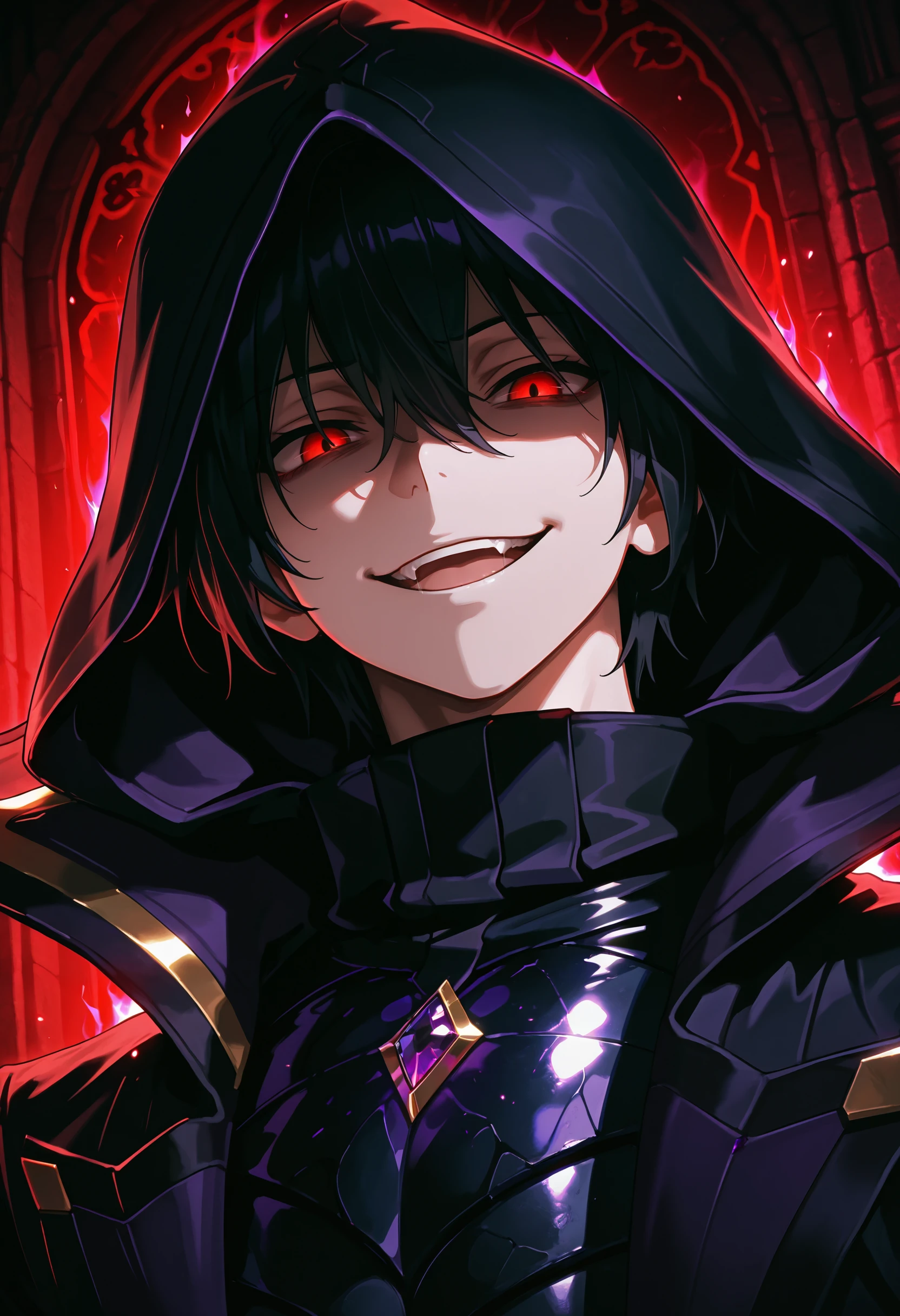 Appearance tag: cid (shadow), 1boy, black eyes, red eyes, glowing eyes, black hair, short hair, hair between eyes