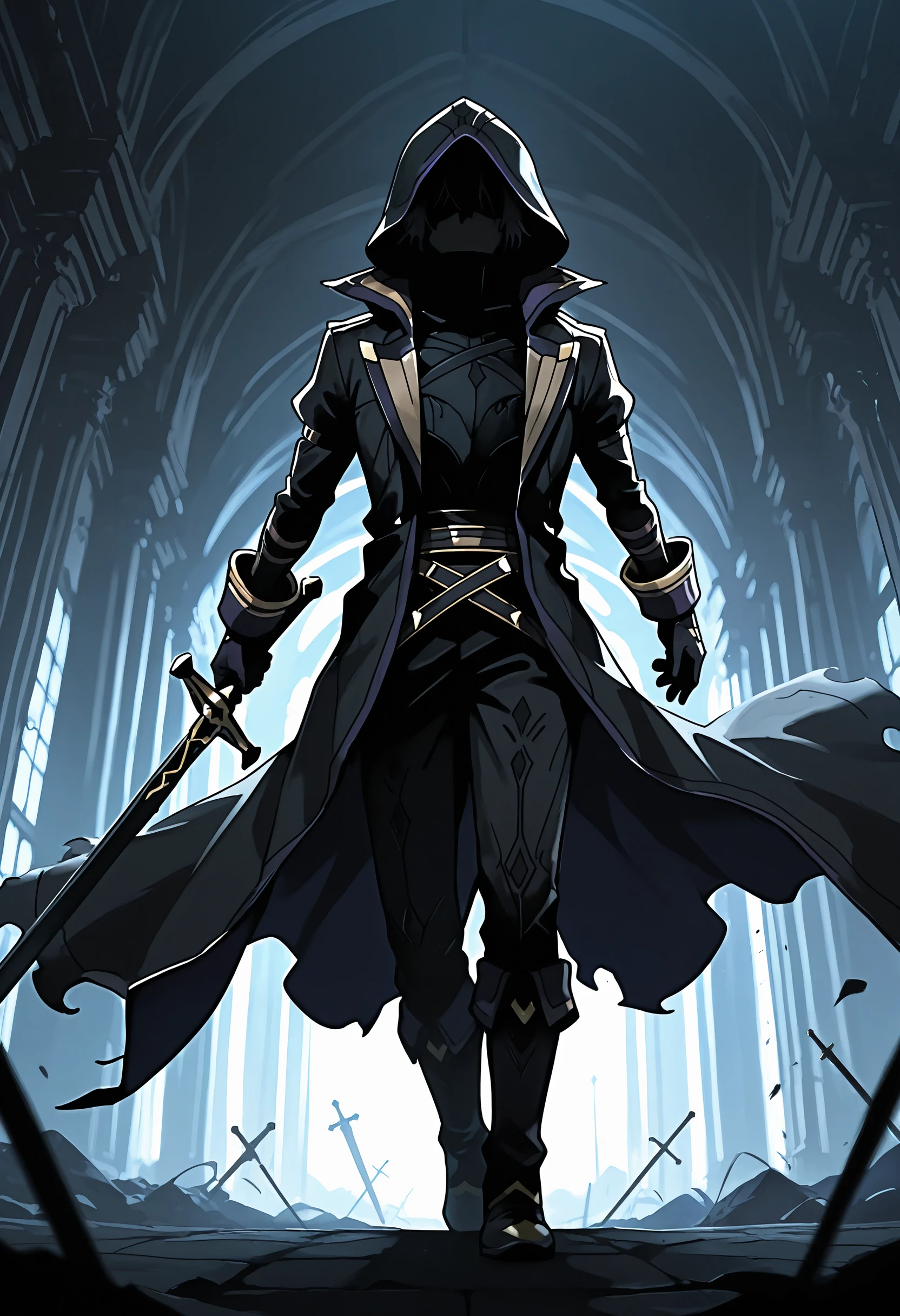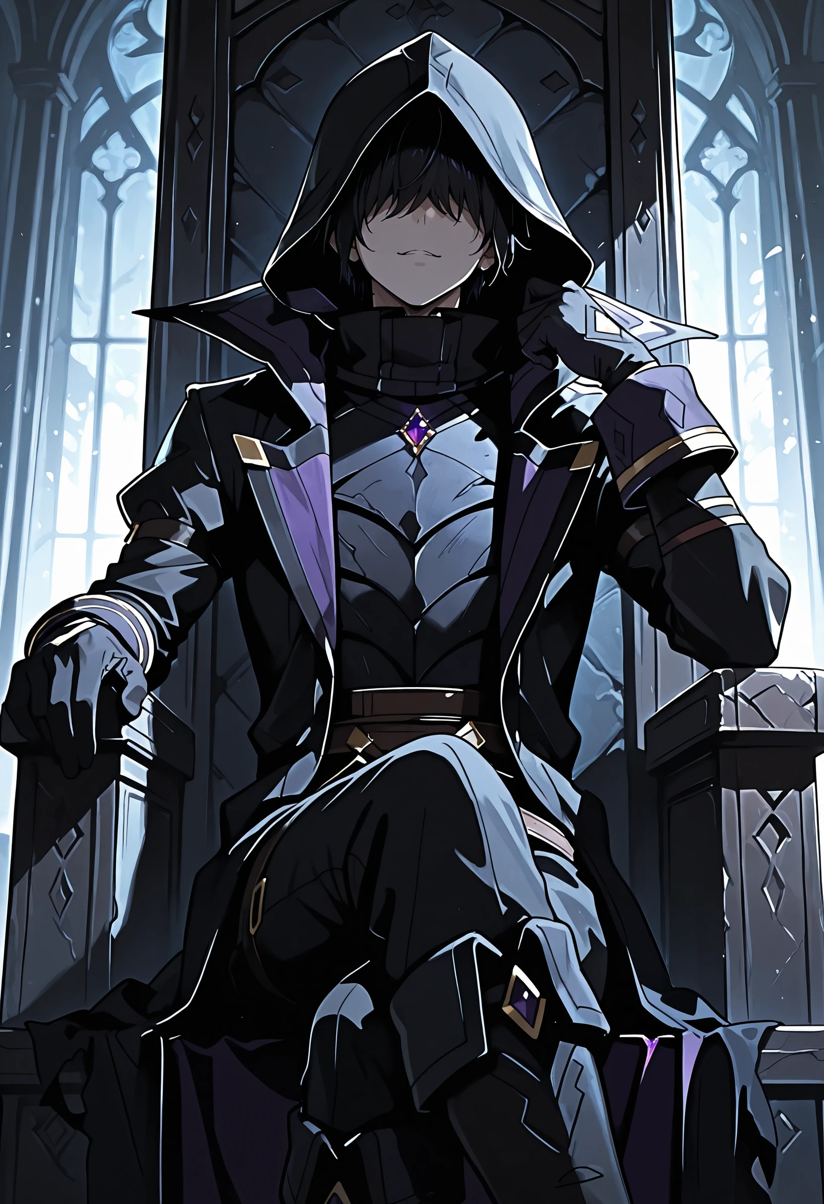 Default outfit: dark hood, dark bodysuit, breastplate, wide collar, wing collar, belt straps, criss-cross belts at waist, dark footwear, dark gloves, gold trims, torn cape, dark cape, dark pants, black pattern at pants, knee boots, purple gem