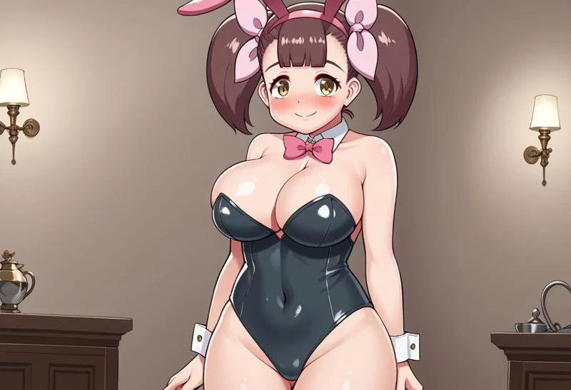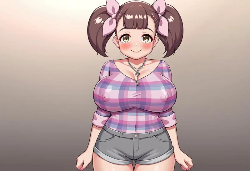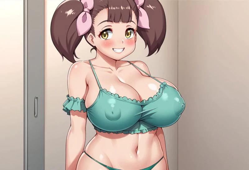 NatalieSOL, big breasts, brown hair, yellow eyes, twintails, pink ribbon