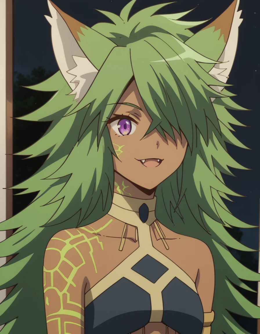 LeilaMofur, very long hair, purple eyes, green hair, fang, midriff, hair over one eye, animal ear fluff, dark-skinned female, tattoo, wolf ears,
