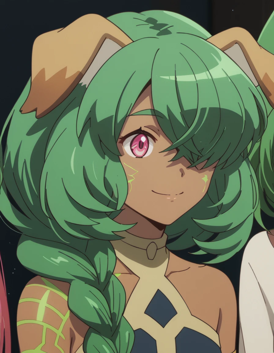LitkaMofur, very long hair, green hair, pink eyes, hair over one eye, flat chest, dark-skinned female, single braid, tattoo, facial mark, dog ears,