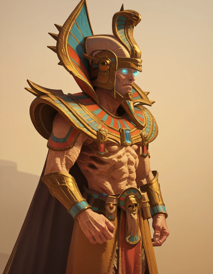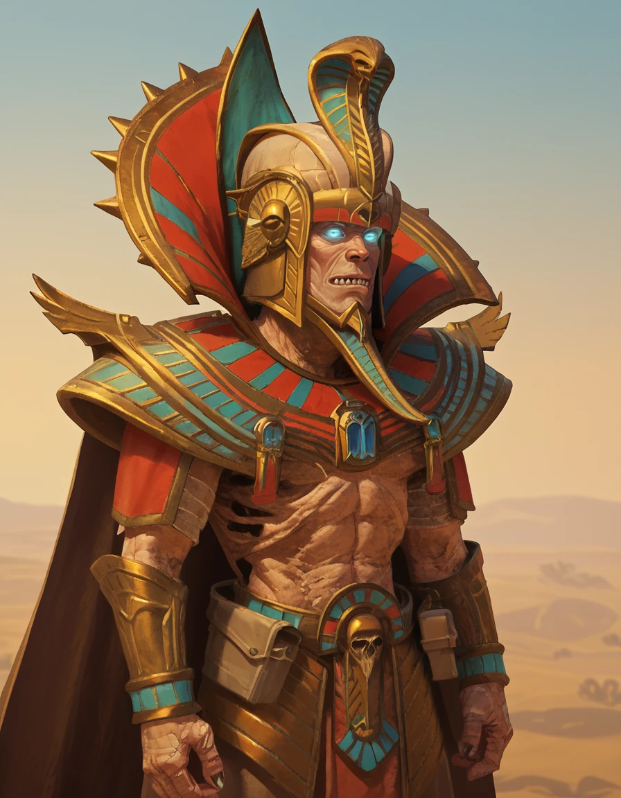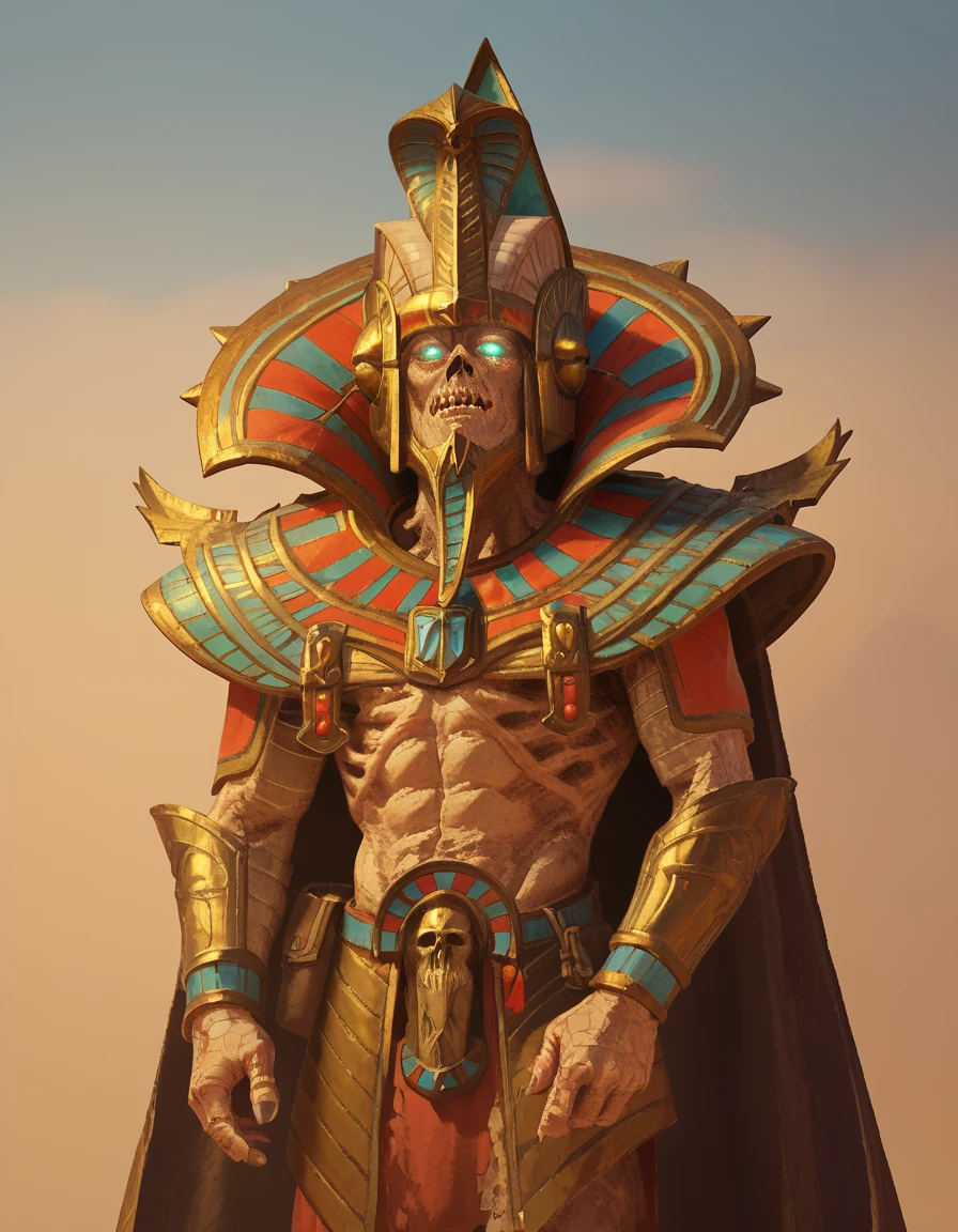 Settra, glowing eyes, undead, monster, helmet, cape,Recommended Weapon Tags: