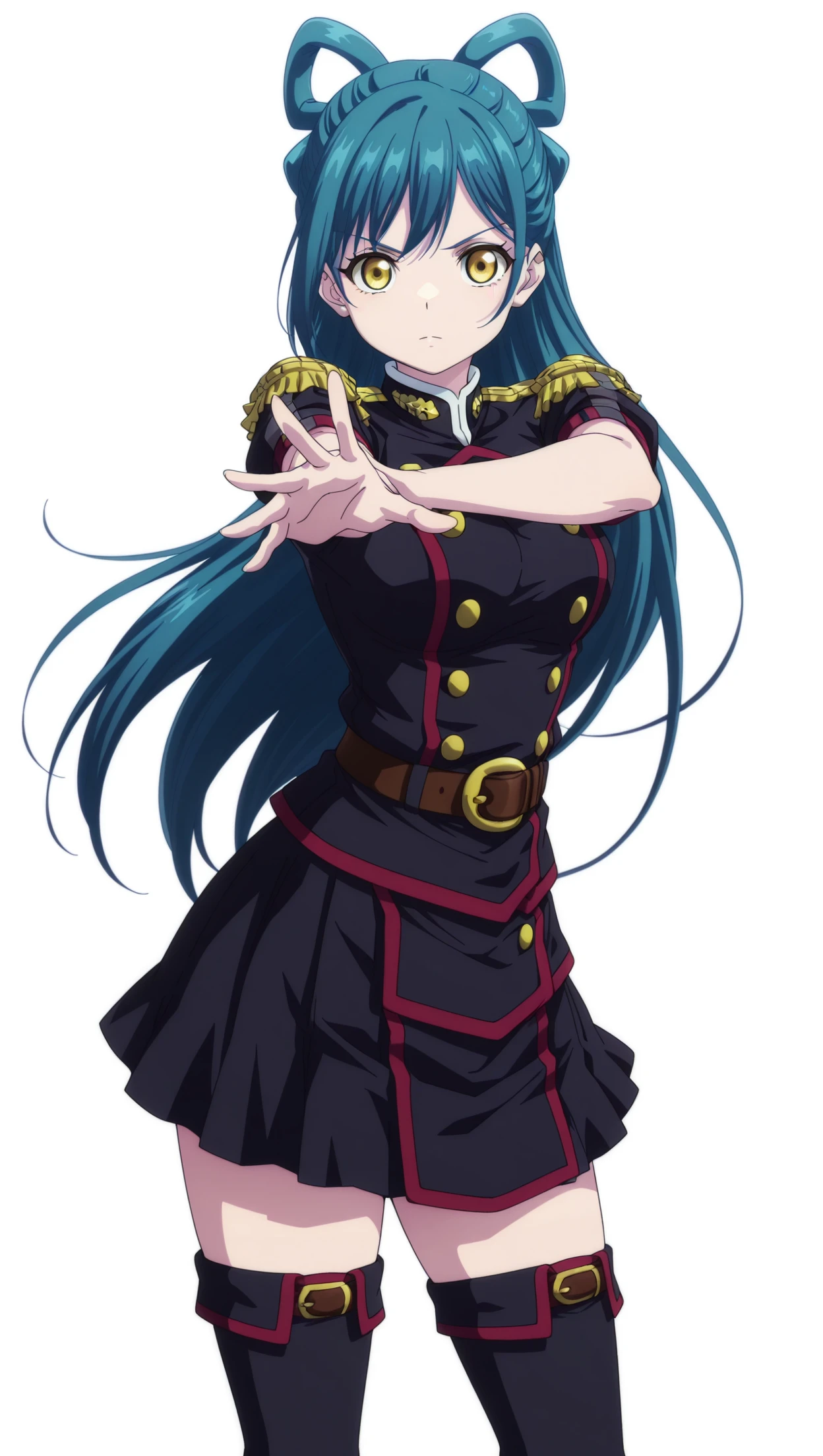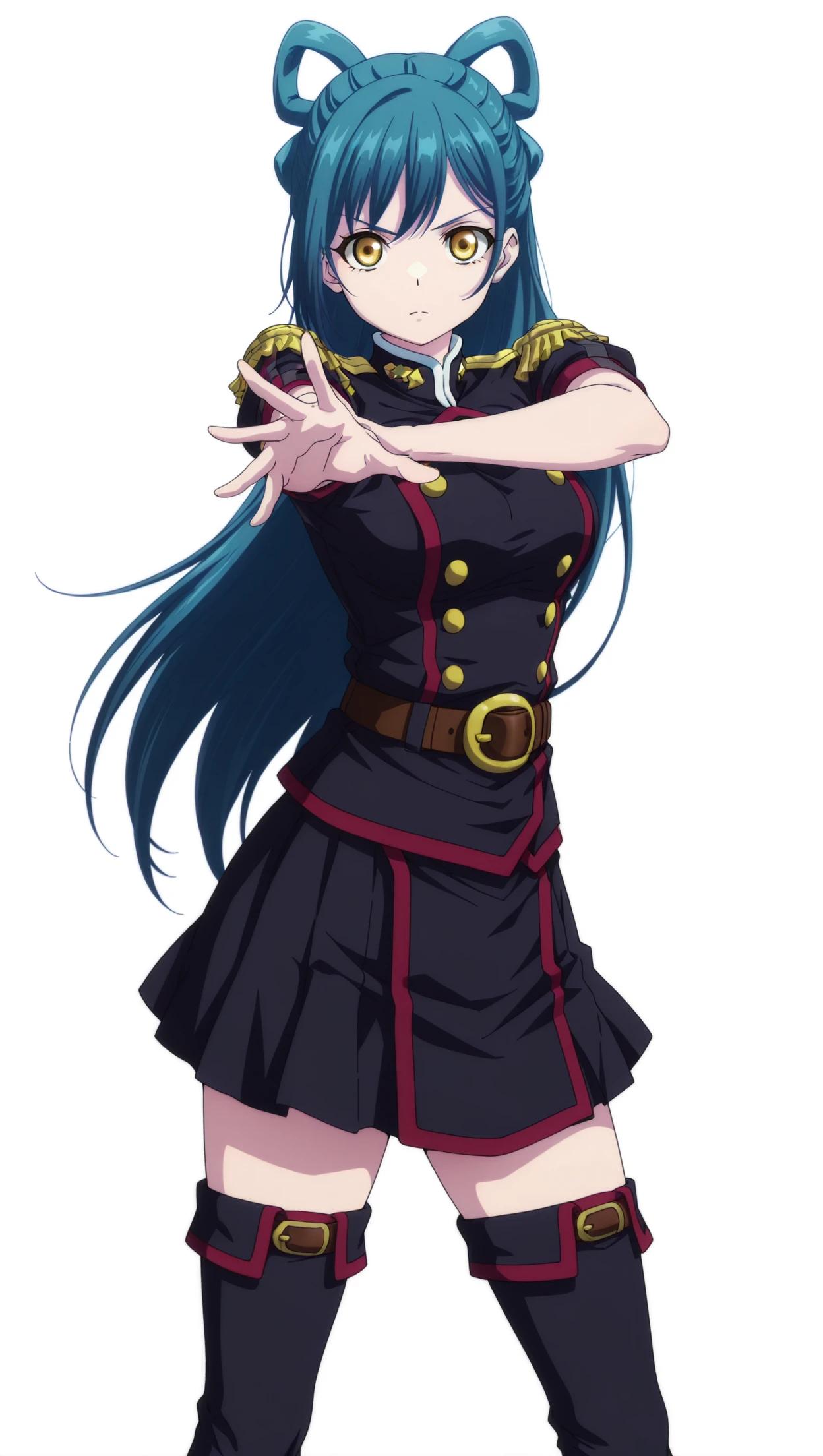h1m4r1h4zum4, 1girl, long hair, blue hair, hair rings, yellow eyes, , military uniform, black uniform, epaulettes, short sleeves, belt, skirt, black skirt, pleated skirt, thigh boots, black footwear