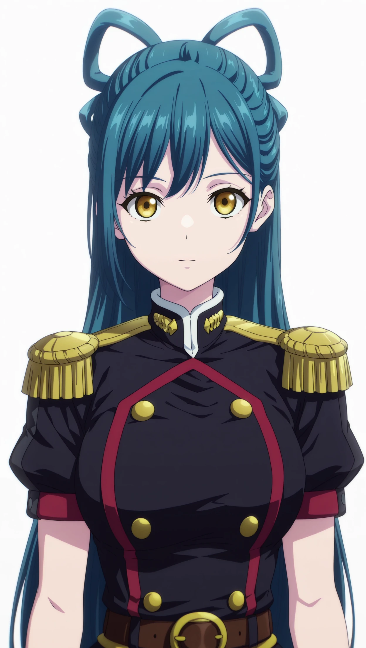 anime coloring, masterpiece, best quality, amazing quality, h1m4r1h4zum4, 1girl, long hair, blue hair, hair rings, yellow eyes, medium breasts, military uniform, black uniform, epaulettes, short sleeves, belt, skirt, black skirt, pleated skirt, thigh boots, black footwear, solo, pose, standing, looking at viewer, from front, ((((white background, simple background))))⚙️ Generation Settings