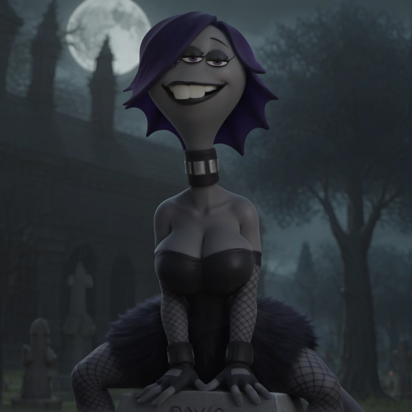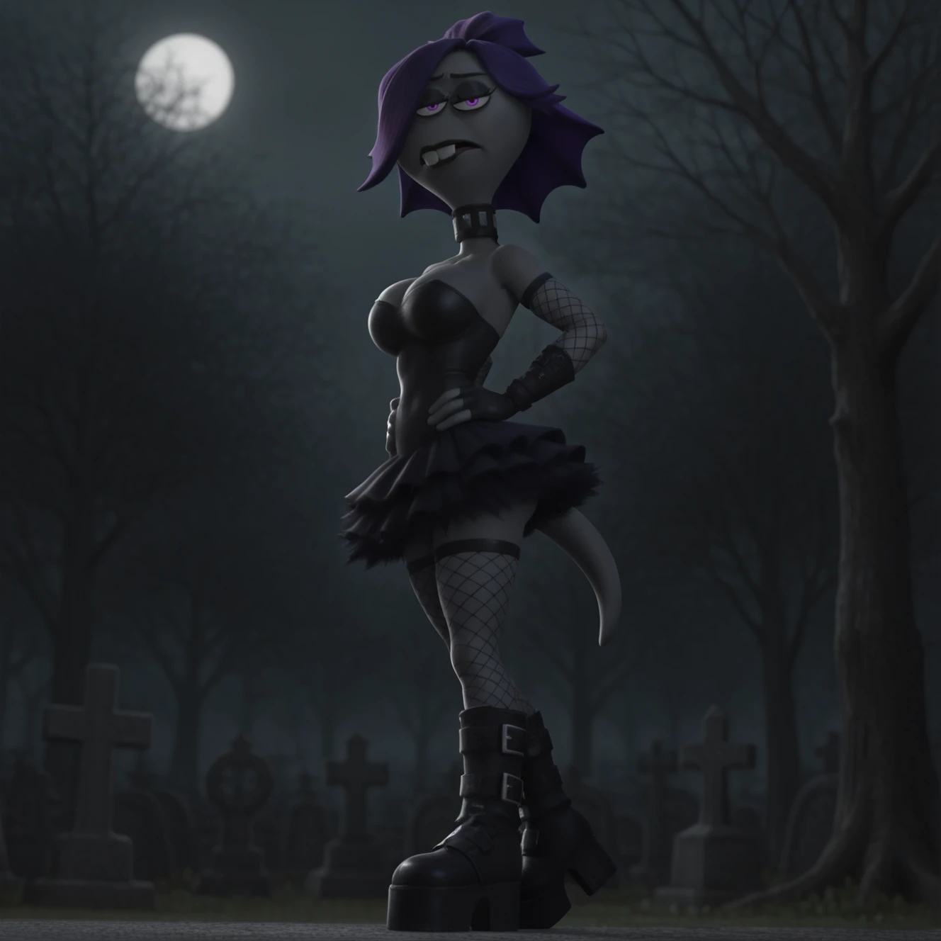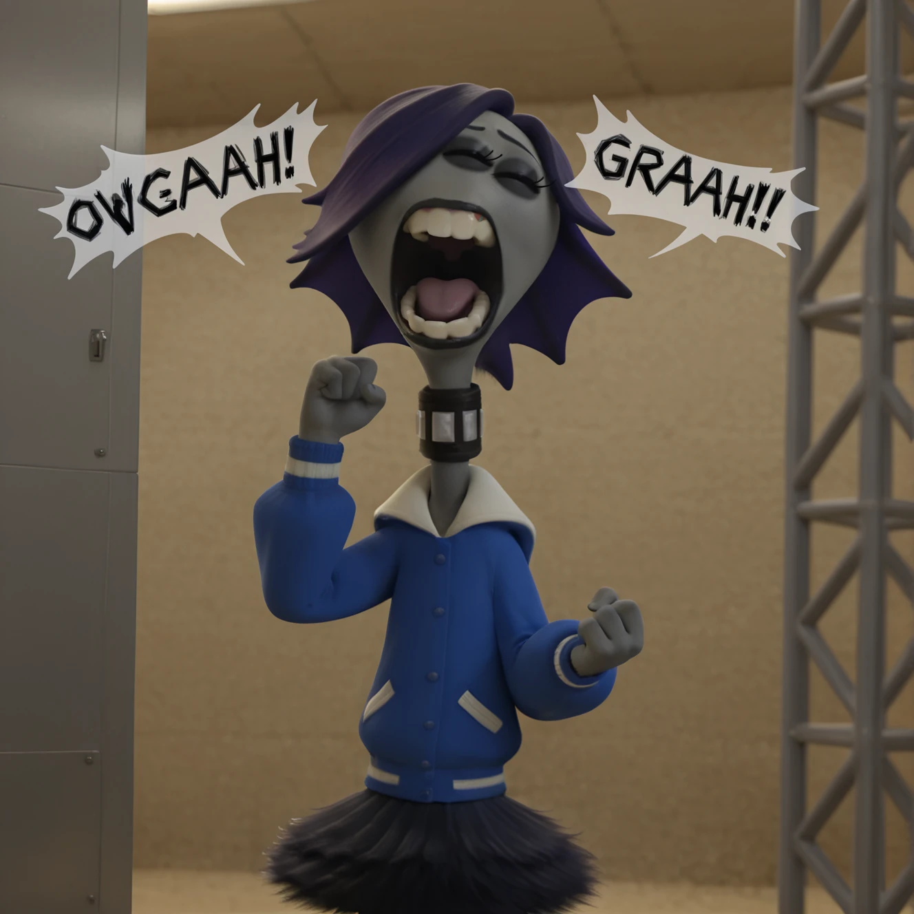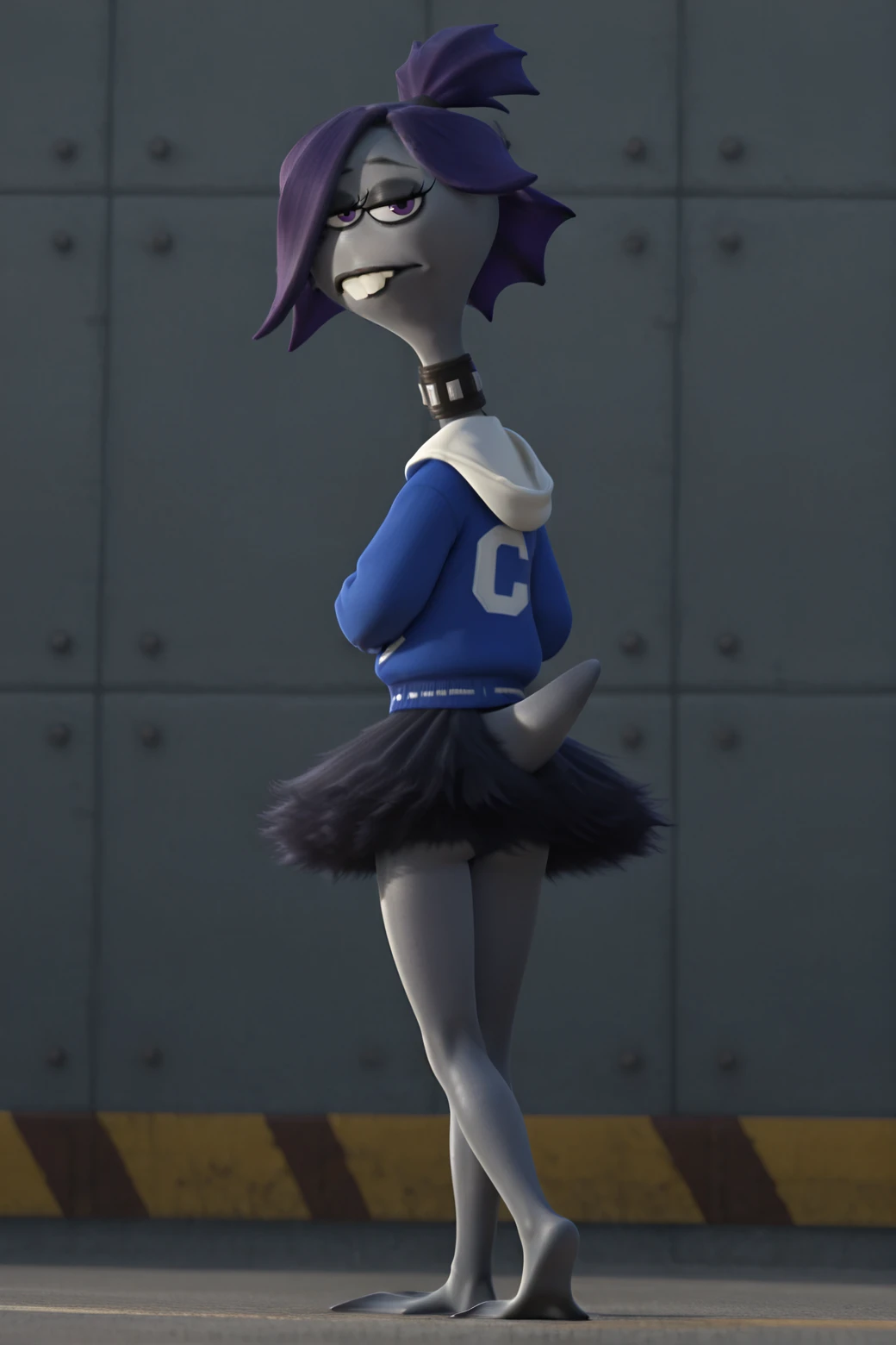 cl41r3_wh33ler, not furry, female, solo, alien humanoid, noseless, 3 eyes, purple eyes, eyelashes, eyeliner, black eyeshadow, hair over eye, fin hair, high ponytail, short ponytail, purple hair, buckteeth, black lips, grey skin, grey body, black collar, hoodie, white hood, blue topwear, long sleeves, letterman jacket, swept bangs, medium hair, black tutu, tail,