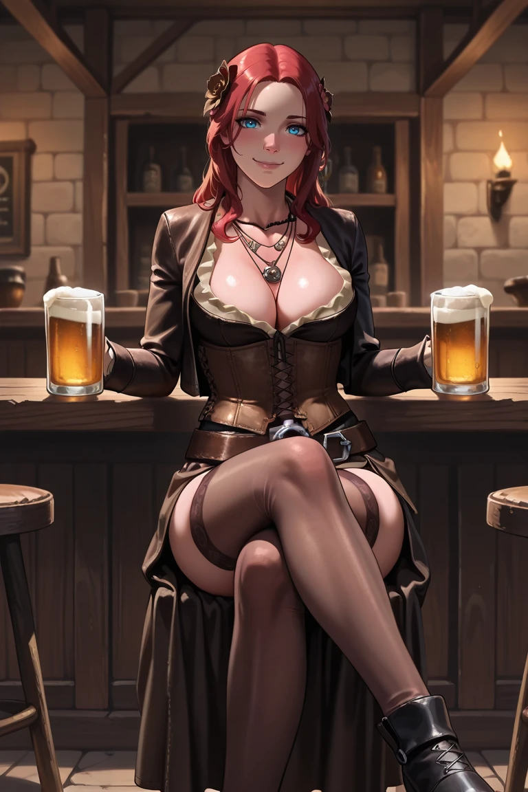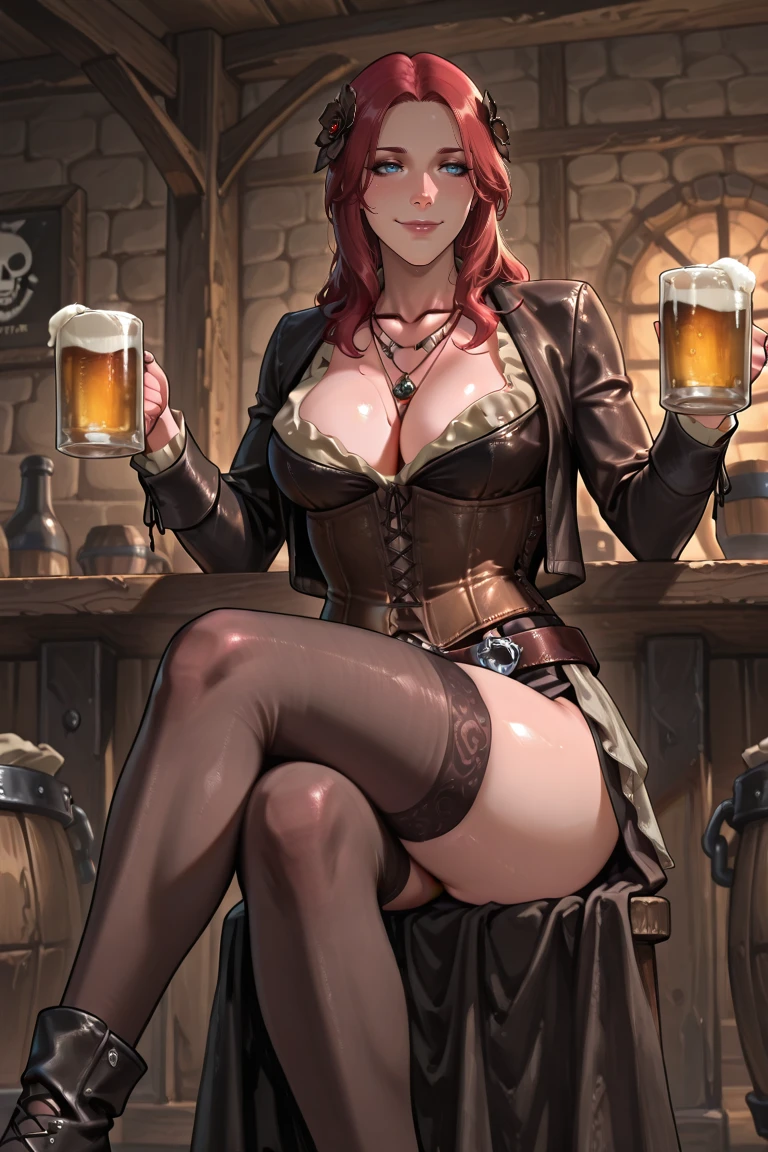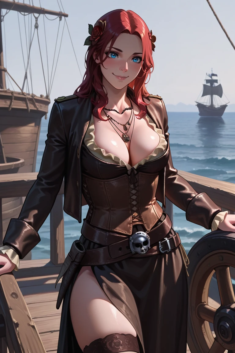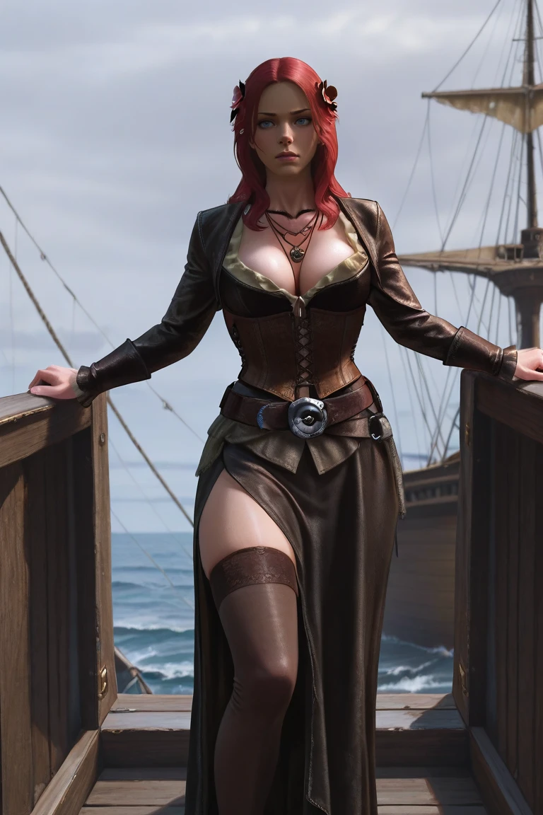 anne-pirate, corset, dress, necklace, jewelry, cleavage, belt, thighhighs, black footwear,