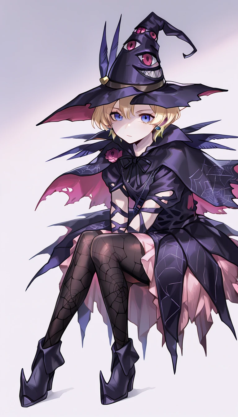 c_sakura,blonde hair,blue eyes,short hair,earrings,witch hat,black cape,neck ribbon,witch costume,webbed pantyhose,black footwear,pointy footweartiara: