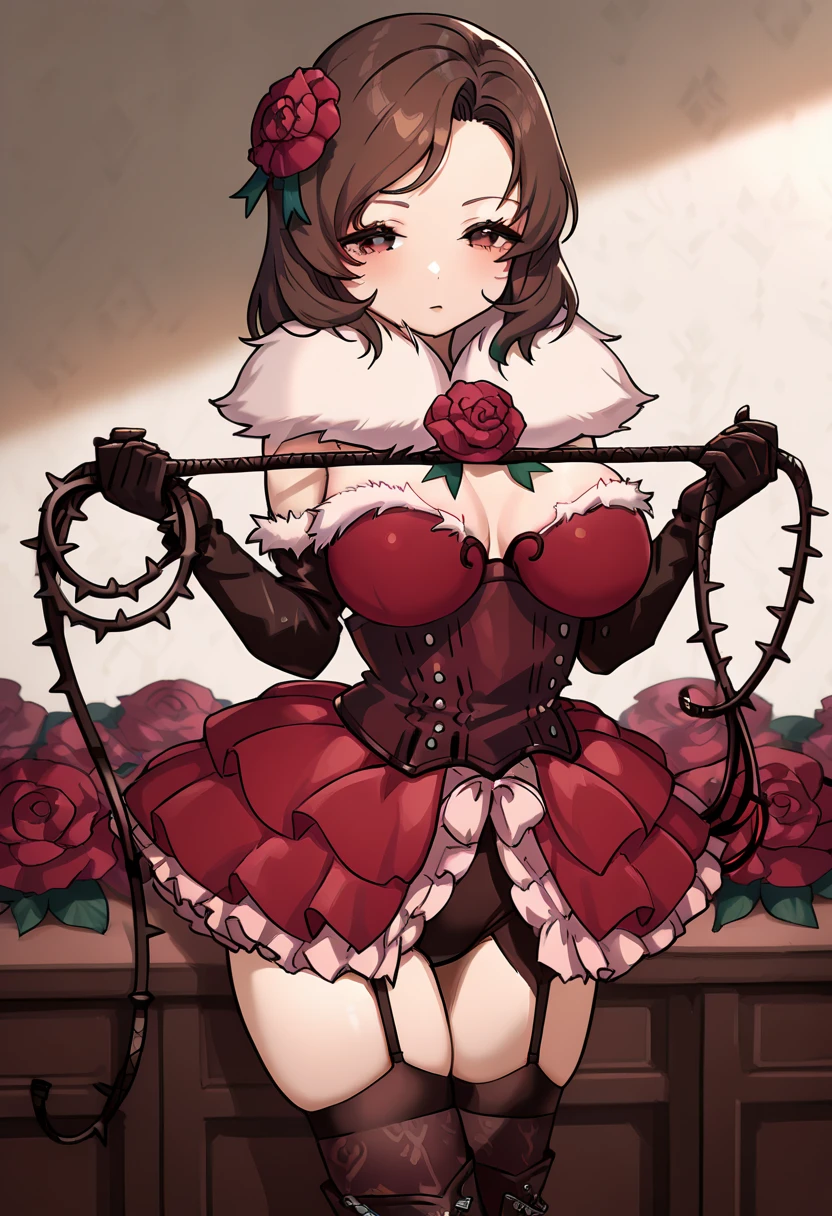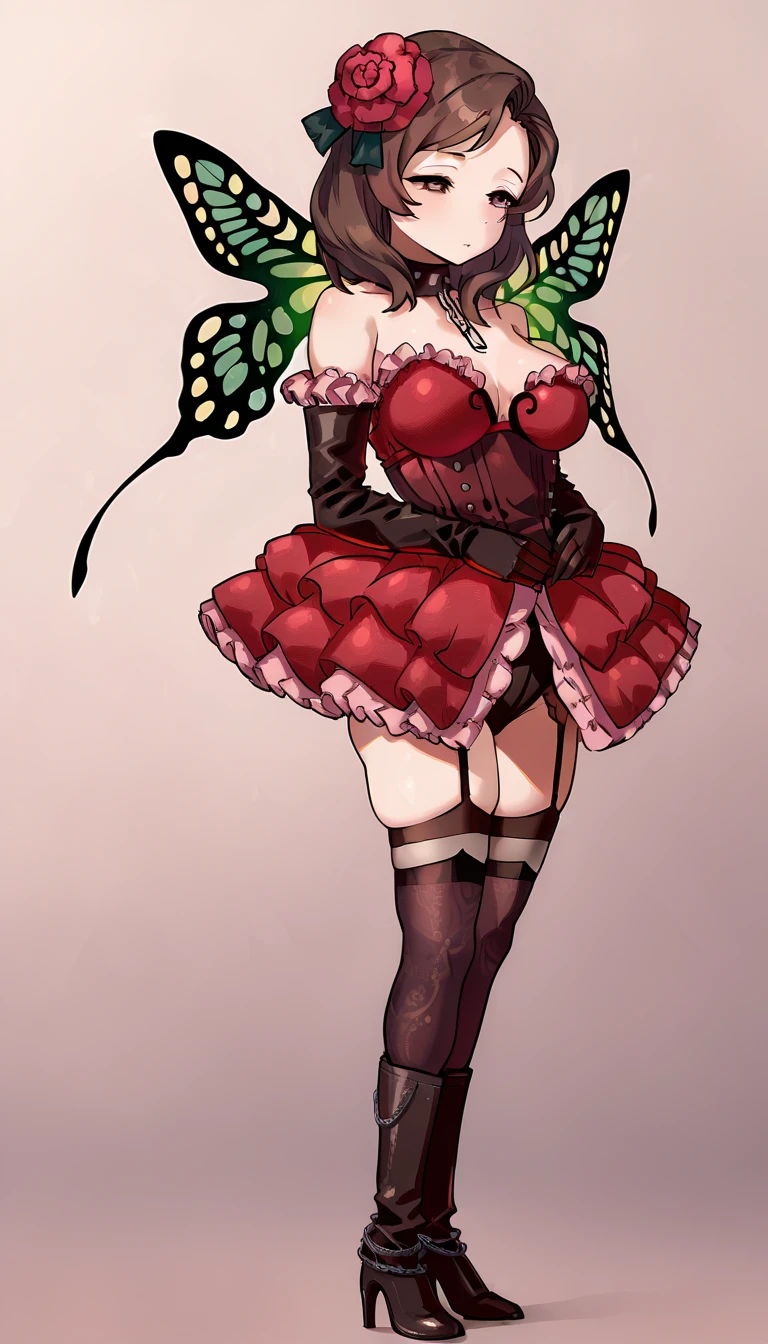 c_rosa,brown eyes,brown hair,medium hair,hair flower,choker,red dress,corset,bare shoulders,elbow gloves,black gloves,garter straps,thighhighs,high heel boots,butterfly wingsc_rosa,brown eyes,brown hair,medium hair,hair flower,flower collar,fur trim,red dress,corset,bare shoulders,elbow gloves,black gloves,garter straps,thighhighs,thigh bootslei: