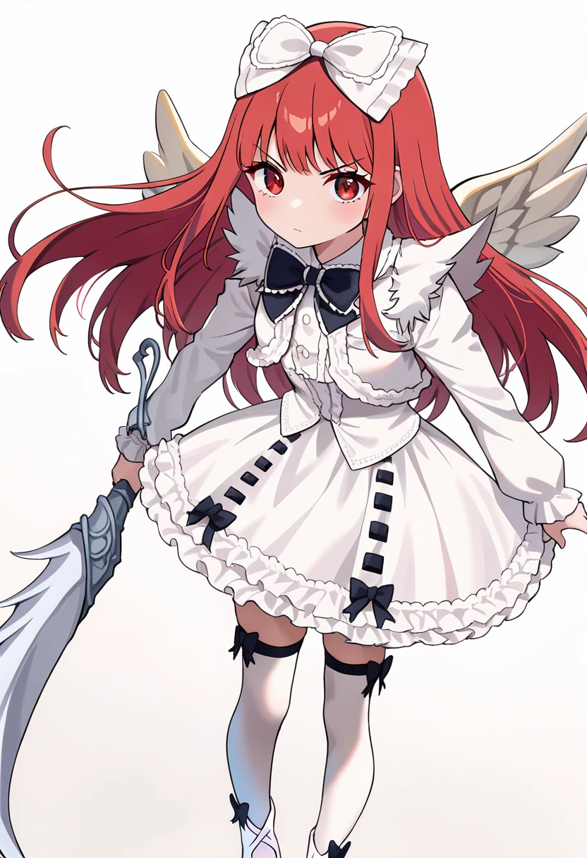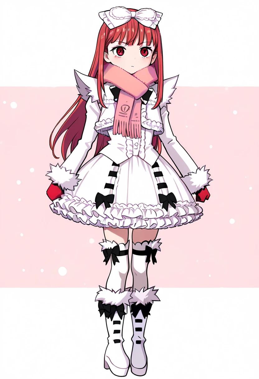 c_windia,red hair,red eyes,hair bow,bowtie,white dress,long sleeves,white skirt,white thighhighs,white footwear,footwear bow,angel wingsc_windia,red hair,red eyes,hair bow,pink scarf,red gloves,white dress,fur cuffs,long sleeves,white skirt,white thighhighs,white footwear,bootscasper:
