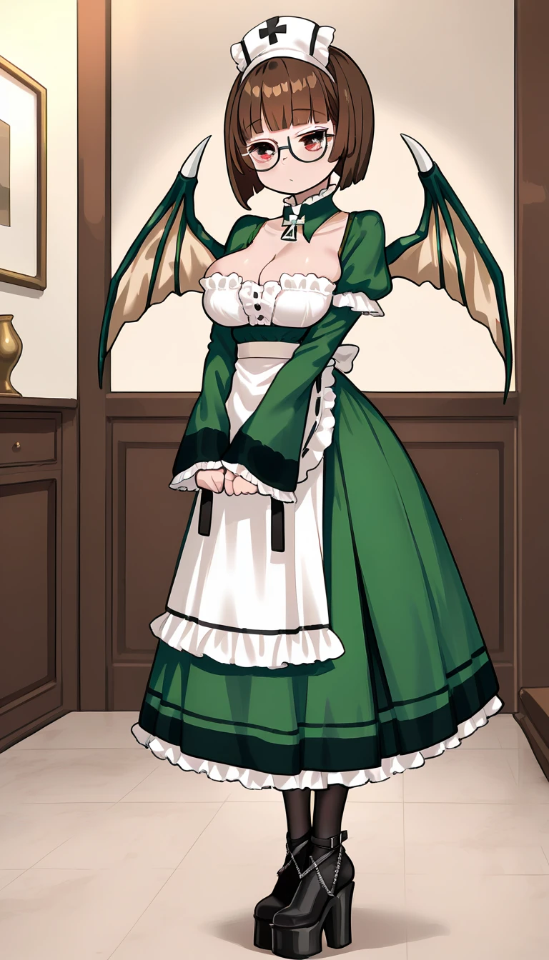 c_follett,brown eyes,brown hair,short hair,white headdress,glasses,detached collar,green dress,long dress,wide sleeves,white apron,black pantyhose,black footwear,platform heels,dragon wingsc_follett,brown eyes,brown hair,short hair,white headdress,glasses,green capelet,fur capelet,green dress,long dress,wide sleeves,white apron,cleavage,black pantyhose,black footwear,platform heelsrosa: