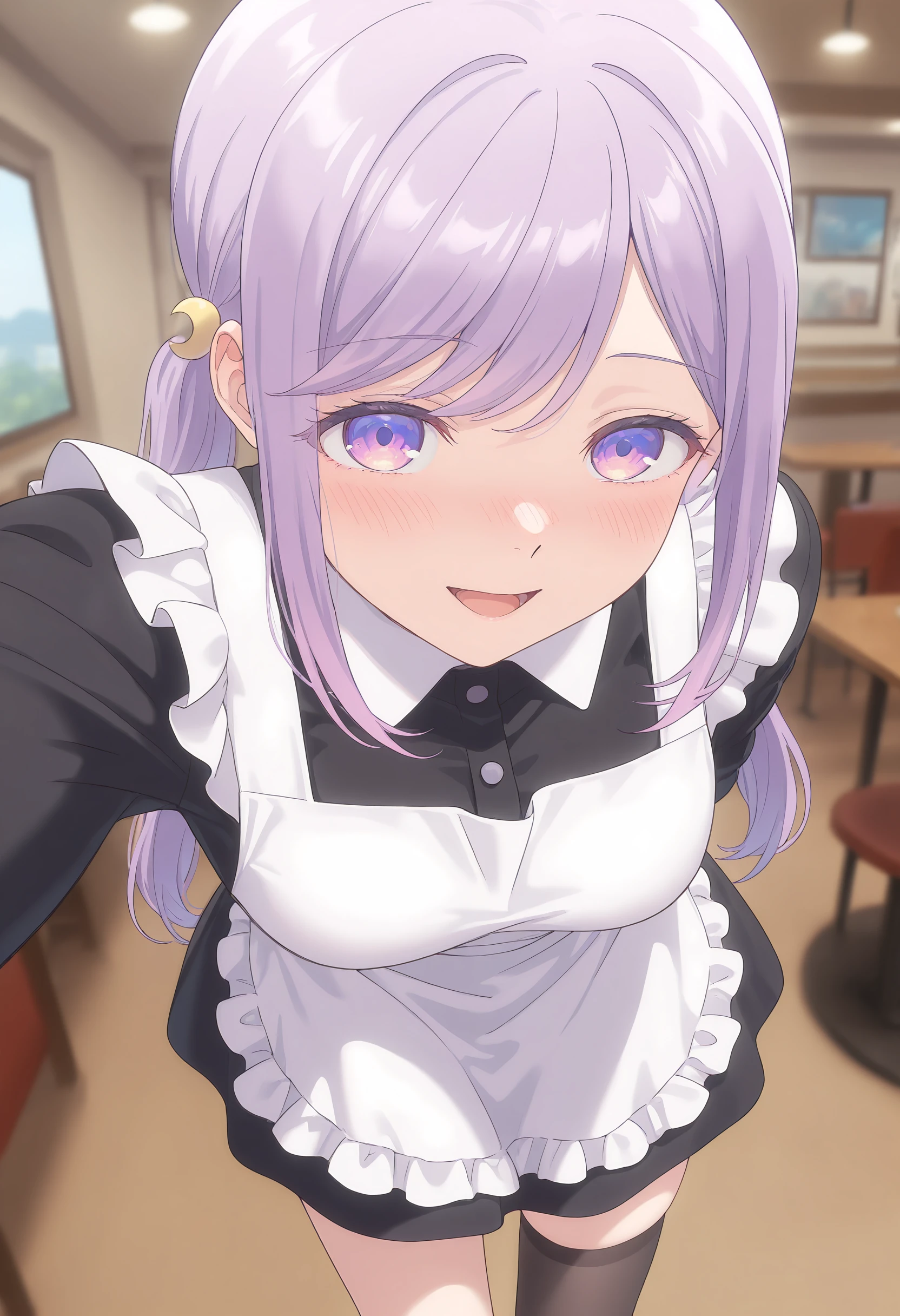 EBRuna, 1girl, solo, medium breasts, long hair, hair ornament, twintails, purple eyes, purple hair, swept bangs, sidelocks,