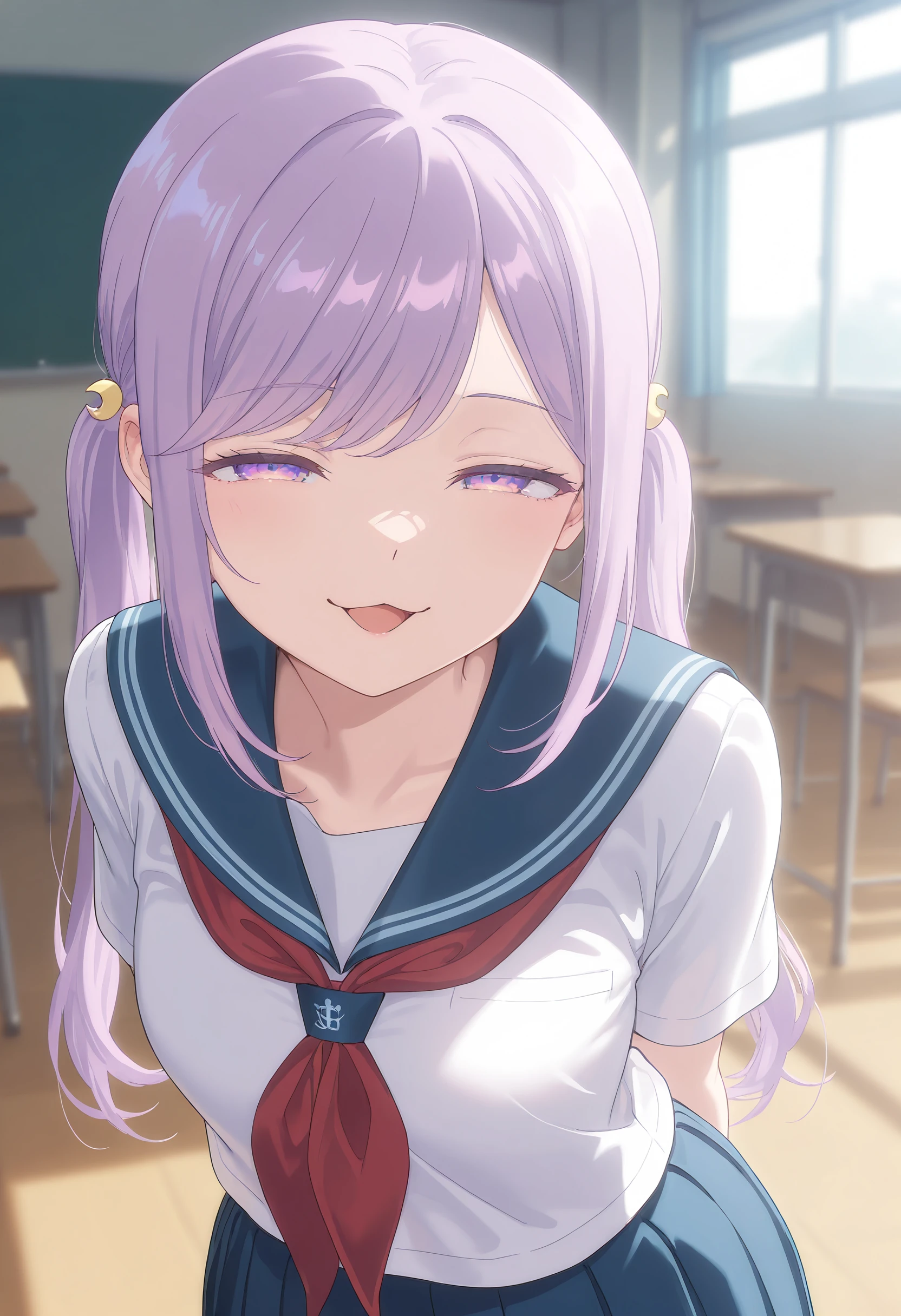 Tags for her look: girl, solo, medium breasts, long hair, hair ornament, twintails, purple eyes, purple hair, swept bangs, sidelocks,