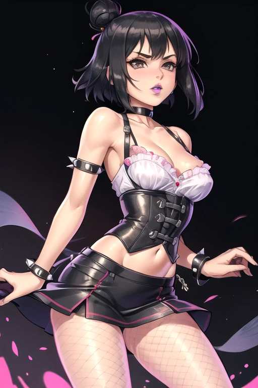 EbonyRavenWay, 1girl, solo, short hair, miniskirt, medium breasts, black hair, bare shoulders, brown eyes, jewelry, fishnet pantyhose, choker, midriff, hair bun, (single hair bun), corset, spiked bracelet, purple lips