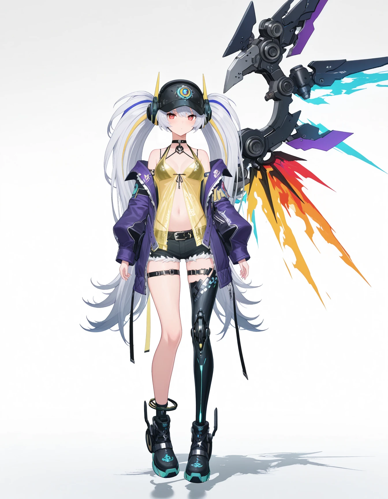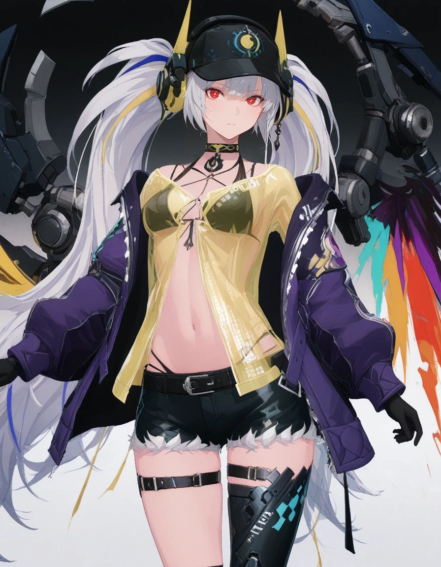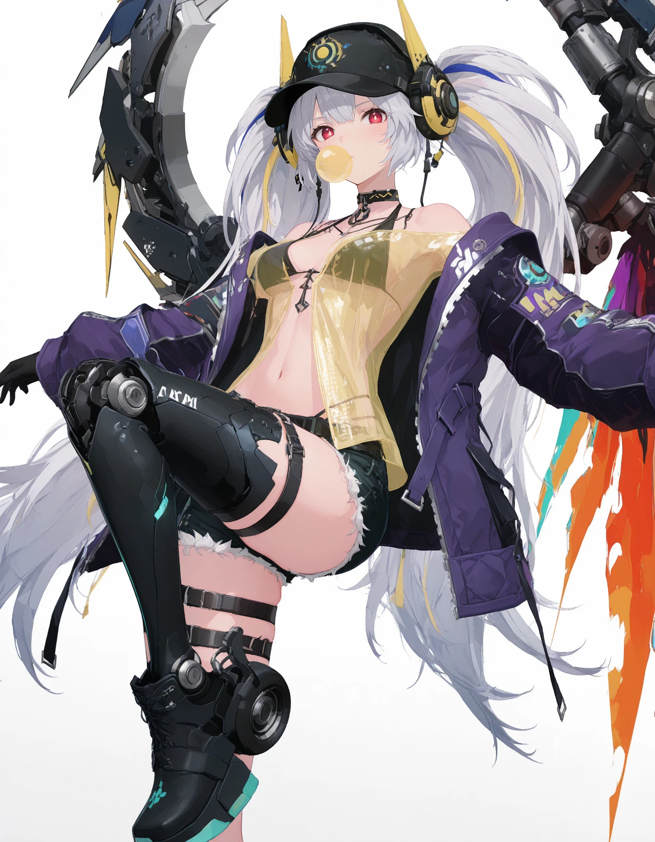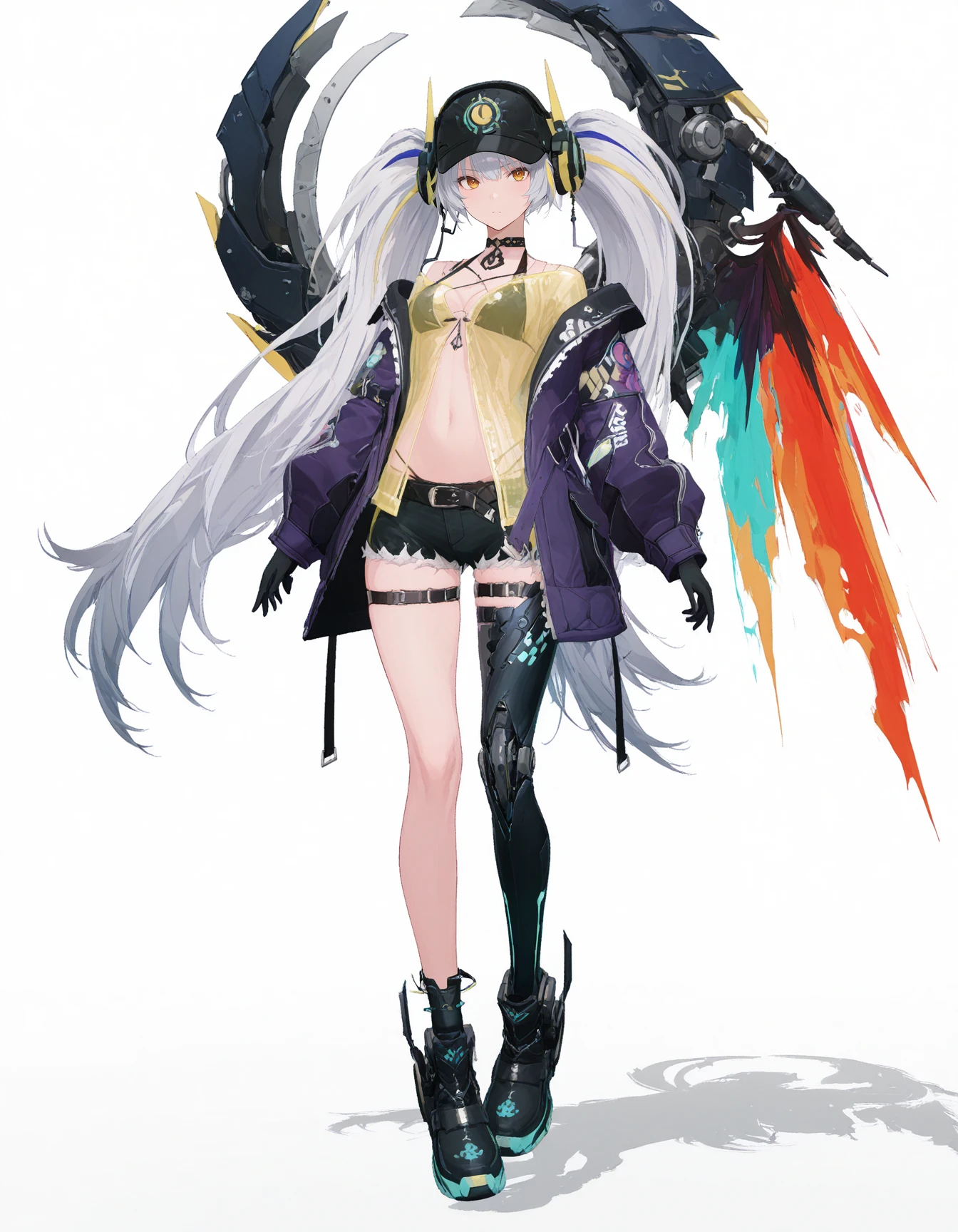 mai_pgrlunatyfz,very_long_hair,twintails,grey_hair,multicolored_hair,red_eyes,hat,navel,jacket,open_clothes,single_wing,mechanical_wings,multicolored_wing,purple_jacket,see-through_shirt,black_bikini,belt,short_shorts,thigh_strap,single_mechanical_arm,choker,open_jacket,headphones,single_thighhigh,skatesRecommend preferred Strength: 0.7~1.