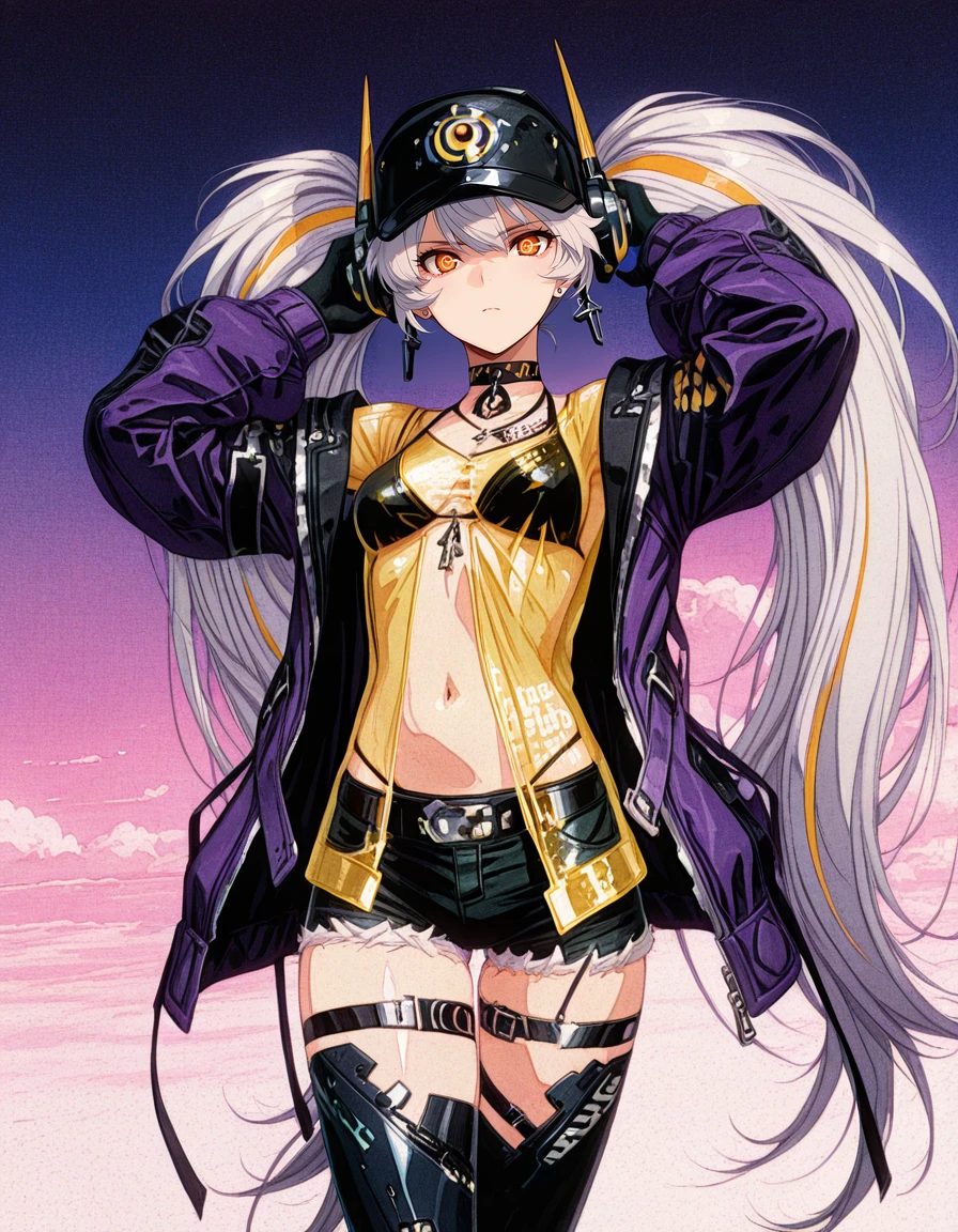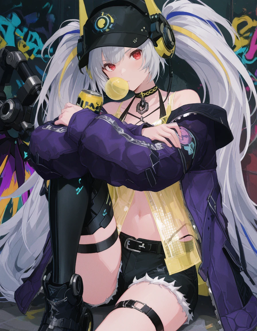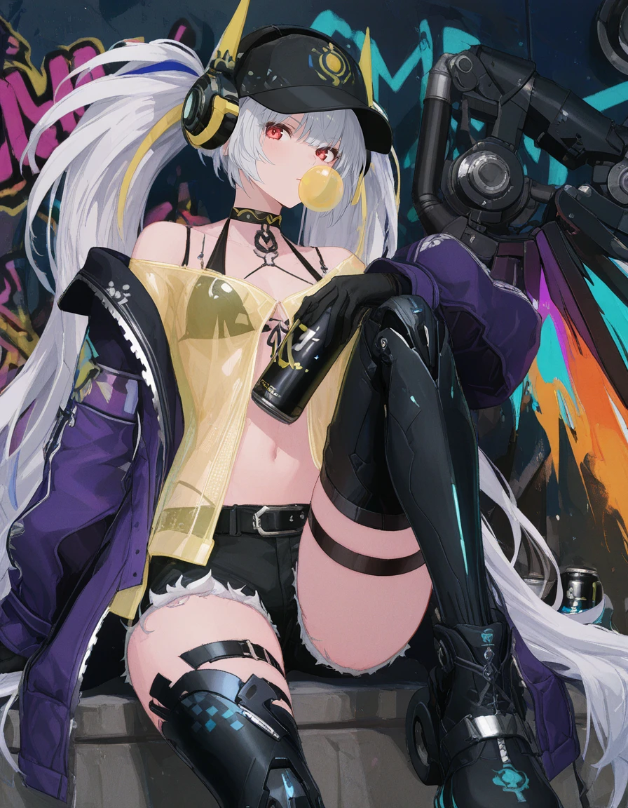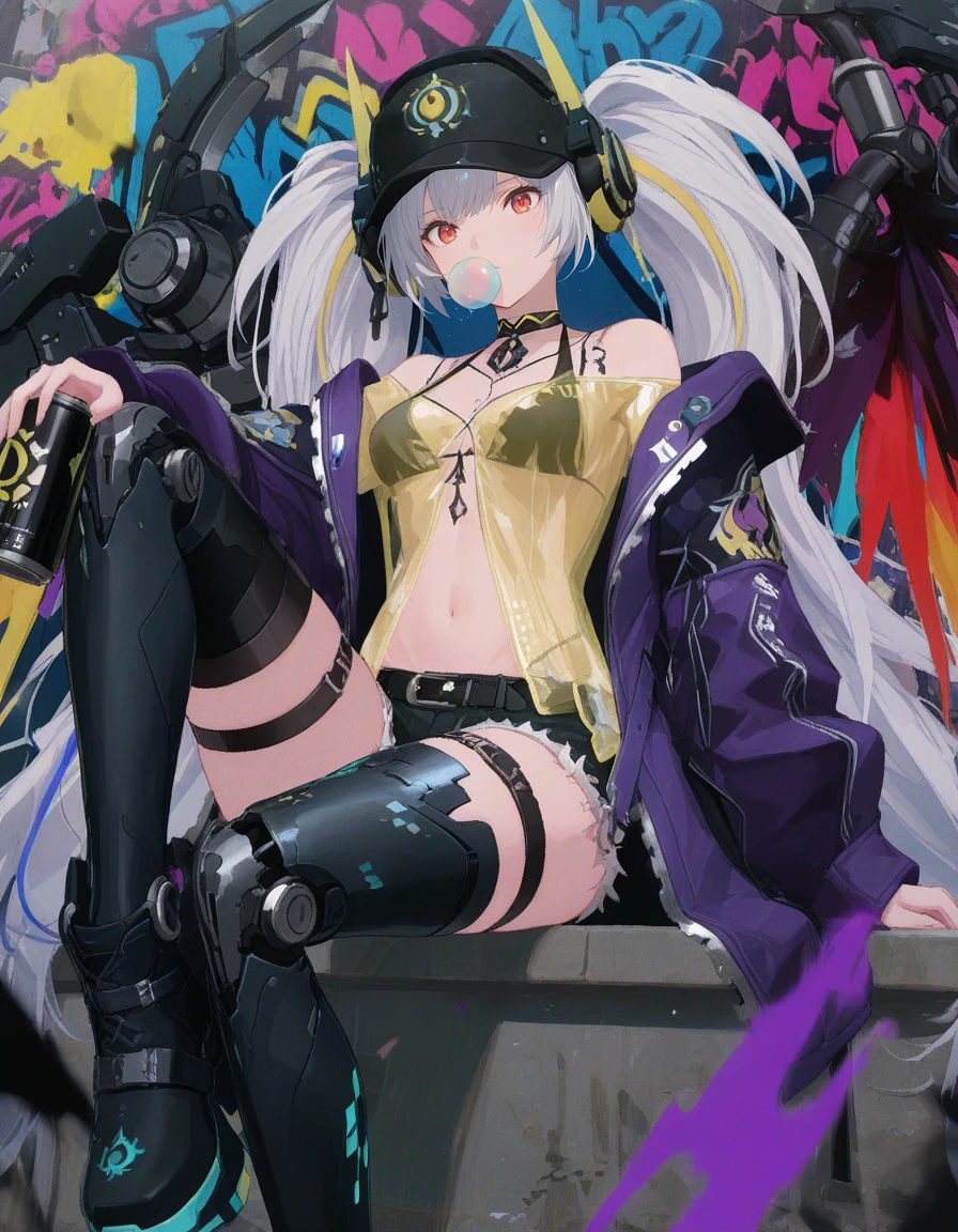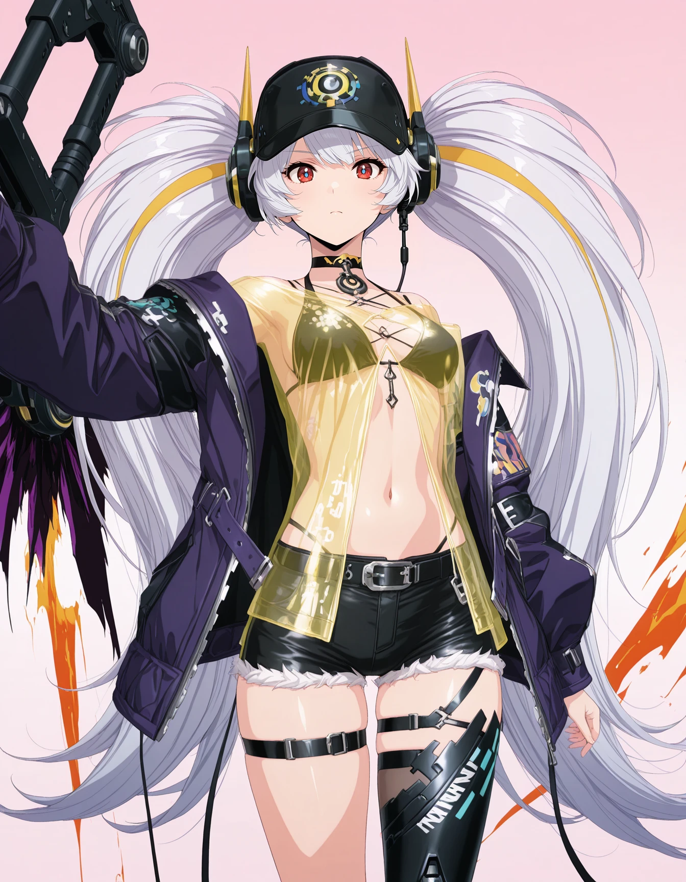 mai_pgrlunatyfz,very_long_hair,twintails,grey_hair,multicolored_hair,red_eyes,hat,navel,jacket,open_clothes,single_wing,mechanical_wings,multicolored_wing,purple_jacket,see-through_shirt,black_bikini,belt,short_shorts,thigh_strap,single_mechanical_arm,choker,open_jacket,headphones,single_thighhigh,skatesRecommend preferred Strength: 0.7~1.