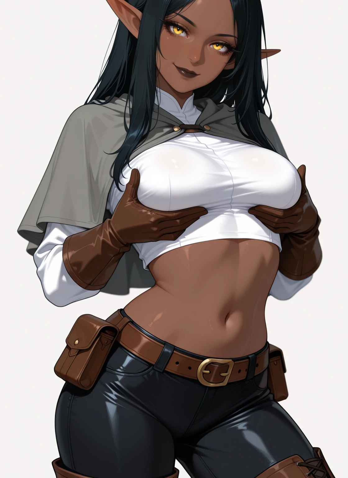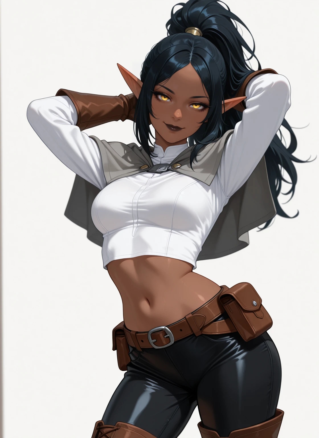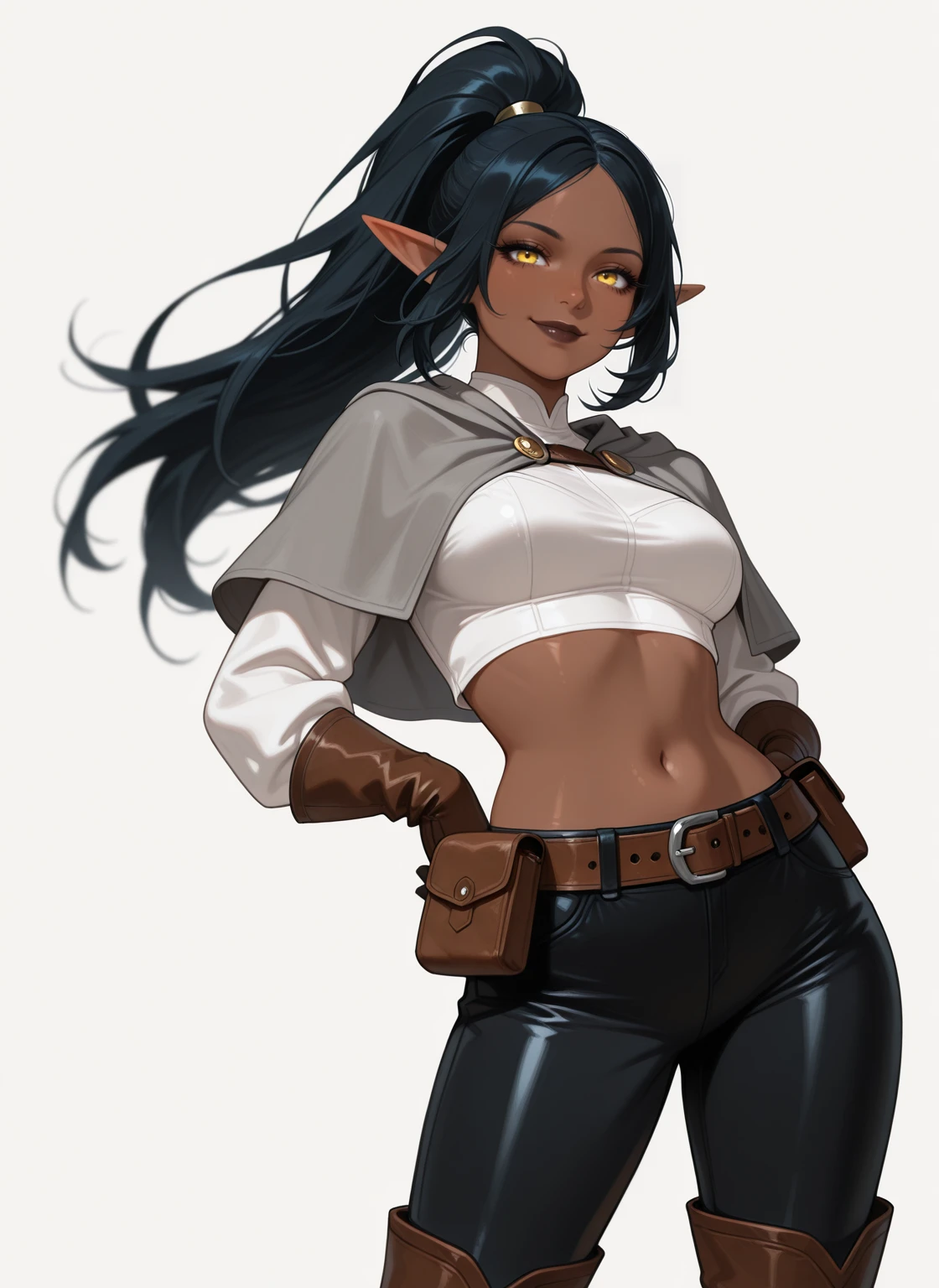 - Long Ponytail with hair base, Grey capelet, White Cropped shirt, Long-sleeved, show navel, Brown Leather belt with pouch, Black low pants, Brown Leather gloves, Brown Thigh Boots,